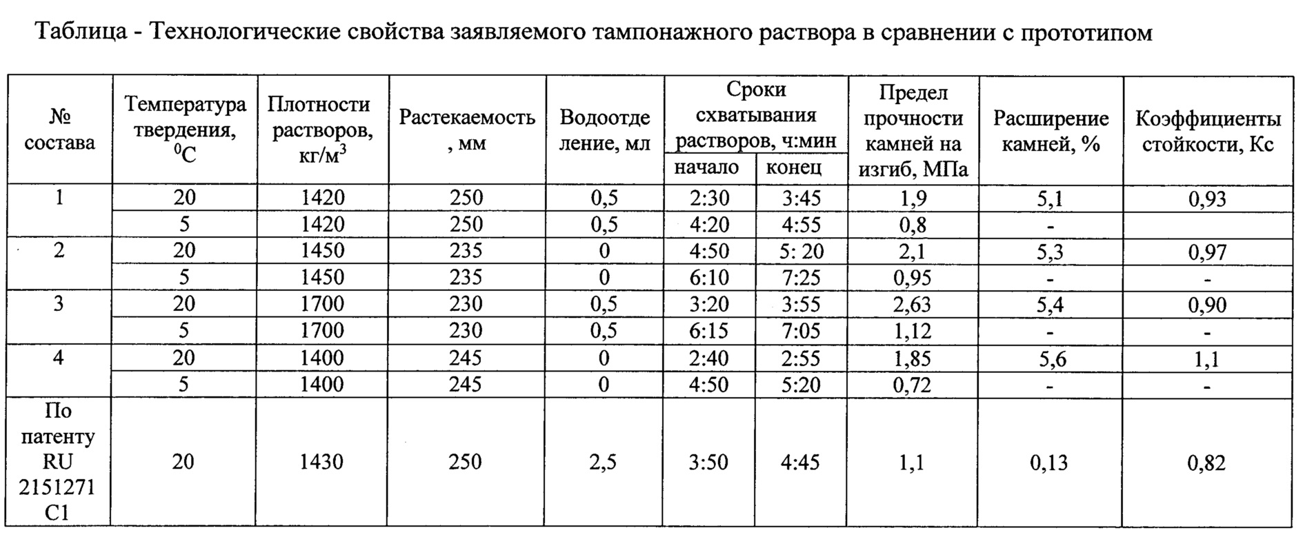 Расширяющийся тампонажный материал, содержащий тампонажный портландцемент, облегчающую добавку, расширяющий и связующий компоненты, алюмосиликатные микросферы, суперпластификатор и пресную или пластовую воду при водосмесевом отношении (В/С), равном 0,5-0,7, отличающийся тем, что в качестве облегчающей добавки используют керамзитовую пыль с удельной поверхностью 550-650 м2/кг, в качестве расширяющего компонента - сульфоалюминатнобелитовое вяжущее САБВ-30-1, в качестве суперпластификатора - порошковый продукт на основе модифицированного полиэфиркарбоксилата Melflux 1641 F, в качестве структурообразователя и регулятора сроков загустевания-схватывания - гидроксохлорид алюминия при следующем соотношении компонентов, мас. %: и пресная или пластовая вода сверх 100 мас. %.тампонажный портландцемент 55,2-70,7 керамзитовая пыль 10,0-15,0 гидроксохлорид алюминия 10,0-15,0 алюмосиликатные микросферы 2,0-4,0 САБВ-30-1 7,0-10,0 Melflux 1641 F 0,3-0,8