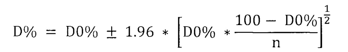 Для расчета интервала, в котором находится «истинное» значение диагностической чувствительности и специфичности с доверительной вероятностью С=95%, то есть для определения показателя правильности исследований, использовалась формула в соответствии с ГОСТ Ρ 53022.3-2008 и теорией вероятности для независимых испытаний по распределению Бернулли*: