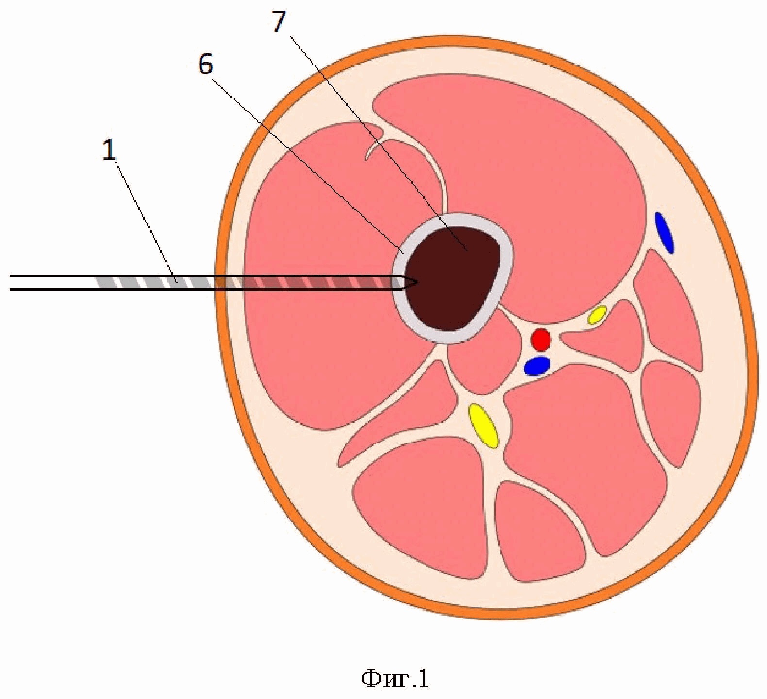 Область техники. Изобретение относится к области медицины, в частности к ортопедии, и может быть использовано при лечении больных с укорочениями и деформациями нижних конечностей. Уровень техники. Известен способ остеотомии бедренной кости в дистальной трети, «кортикотомия по Илизарову» (Бескровное удлинение голени методом дистракционного эпифизеолиза: Методические рекомендации / КНИИЭКОТ; Сост.: Г.А. Илизаров, В.И. Грачева, В.К. Камерин. - Курган, 1976. - 24 с.). На бедренную кость устанавливают опоры аппарата внешней фиксации. Выполняют доступ по передне-наружной поверхности бедра, в дистальной трети бедренной кости. С использованием инструмента (хирургическое долото или остеотом) пересекают кортикальную пластинку по передненаружной и частично по задне-наружной поверхности бедренной кости. Передне-внутренняя, задне-внутренняя часть кортикальной пластинки поверхности бедренной кости остается целой. Далее осуществляют перелом оставшегося непересеченным участка кости (остеоклазиея) путем ротационного поворота опор аппарата наружной фиксации в противоположных направлениях. Кортикотомия указанным способом позволяет сохранить цельным костный мозг, но не всегда приводит к предсказуемой линия излома бедренной кости, существует риск излома непересеченной части кости по линии отличающейся от запланированной. Известен способ остеотомии бедренной кости в дистальной трети, (Удлинение бедра после частичной кортикотомии по Илизарову у детей и подростков: Методические рекомендации / МЗ РСФСР, ВКНЦ "ВТО"; Сост.: Г.А. Илизаров, А.А. Чипизубов, С.Г. Лаврентьева-Илизарова. - Курган, 1987. – 32с.). Выполняют доступ к бедренной кости. С использованием инструмента (долото, остеотом) пересекают кортикальную пластинку по передне-наружной, задне-наружной, передне-внутренней и задне-внутренней поверхности бедренной кости. Полная остеотомия бедренной кости по указанному способу неизбежно приводит к повреждению структур внутри костномозгового канала, костного мозга. Таким образом проблема известных способов заключается в том, что в ходе нарушения целостности кости, при обеспечении целостности костного мозга и других структур костномозгового канала, существует риск получения линии излома отличающейся от ожидаемой, а при получении ожидаемой линии излома путем полного пересечения кортикальной пластики, не обеспечивается сохранность костного мозга и других структур костномозгового канала. Задачей настоящего изобретения является разработка способа кортикотомии, обеспечивающего сохранение костного мозга и других структур костномозгового канала, с получением предсказуемой линией излома бедренной кости. Сущность технического решения. Технический результат заключается в получении кортикотомии бедренной кости в дистальной трети с предсказуемой линией излома при сохранении целостности костного мозга и других структур костномозгового канала. Технический результат достигается тем, что в способе выполнения кортикотомии бедренной кости в дистальной трети включающий выполнение двух противоположных доступов к кости, рассечение кортикального слоя кости остеотомом выполняют последовательную встречную перфорацию кортикальных пластинок вдоль планируемой линии излома, для этого с двух противоположных сторон поверхности бедренной кости
