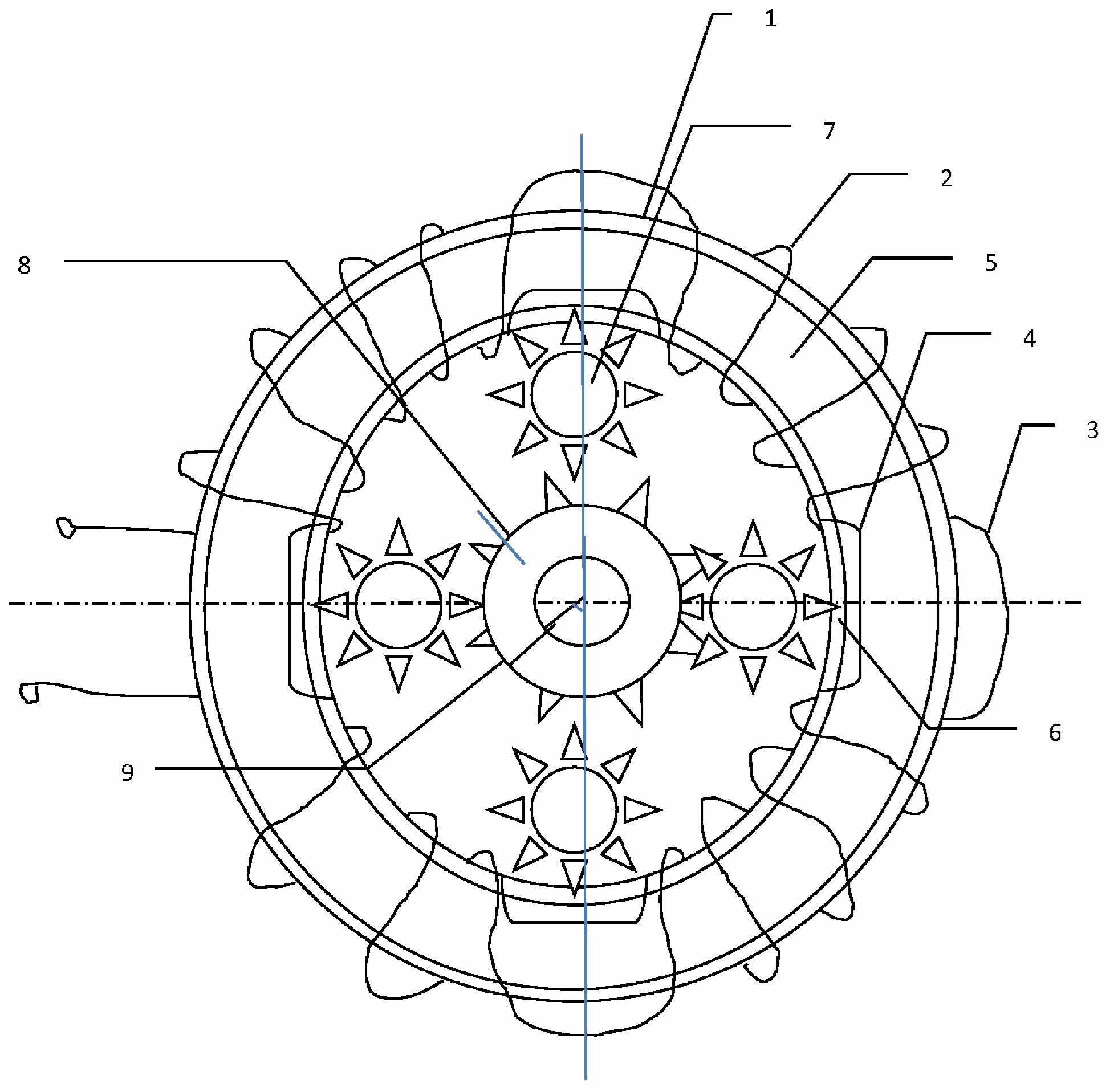 Бесколлекторный электрический двигатель постоянного тока, содержащий тороидальный статор с корпусом в виде тора и обмоткой и содержащий ротор с постоянными магнитами, установленный внутри корпуса статора, отличающийся тем, что ротор выполнен в виде кольца, состоящего из двух полукольцевых постоянных магнитов, на внутренней стороне кольца ротора закреплена роторная шестерня, на внутренней стороне корпуса статора, обращенной к оси тора, выполнены вырезы, равномерно расположенные вдоль его внутреннего периметра, на внешней стороне корпуса статора на участках, расположенных напротив вырезов внутренней стороны, обмотка статора расположена линейно, на участках между вырезами обмотка расположена спирально вокруг поверхности тора, в местах вырезов корпуса статора роторная шестерня входит в зацепление с передаточными шестернями, взаимодействующими с центральной шестерней вала двигателя.