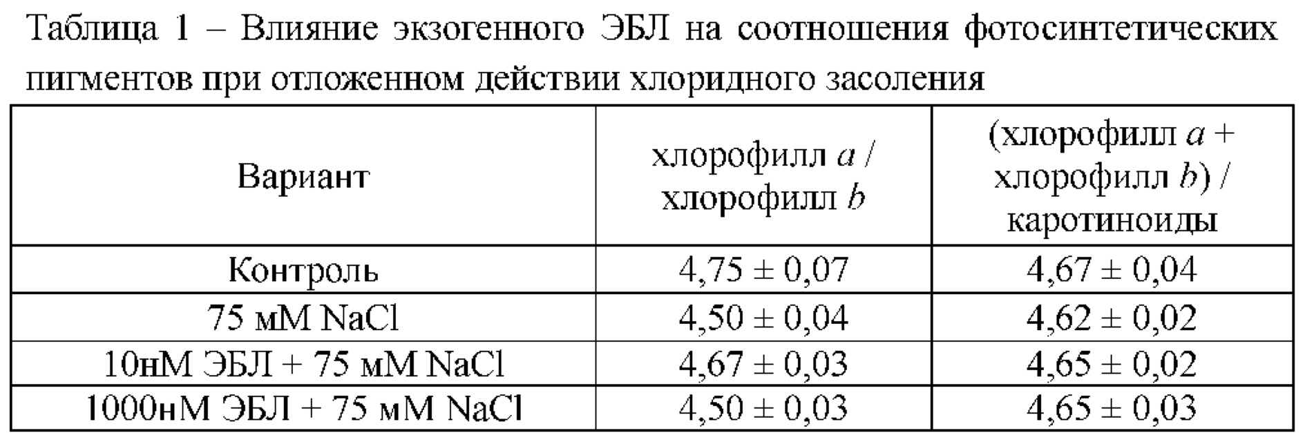 , в результате действия хлорида натрия, способствовало изменению соотношения пигментов (Таблица 1). Гормональное воздействие полностью восстанавливало данный показатель при концентрации 10 нм и частично при концентрации 1000 нМ ЭБЛ.