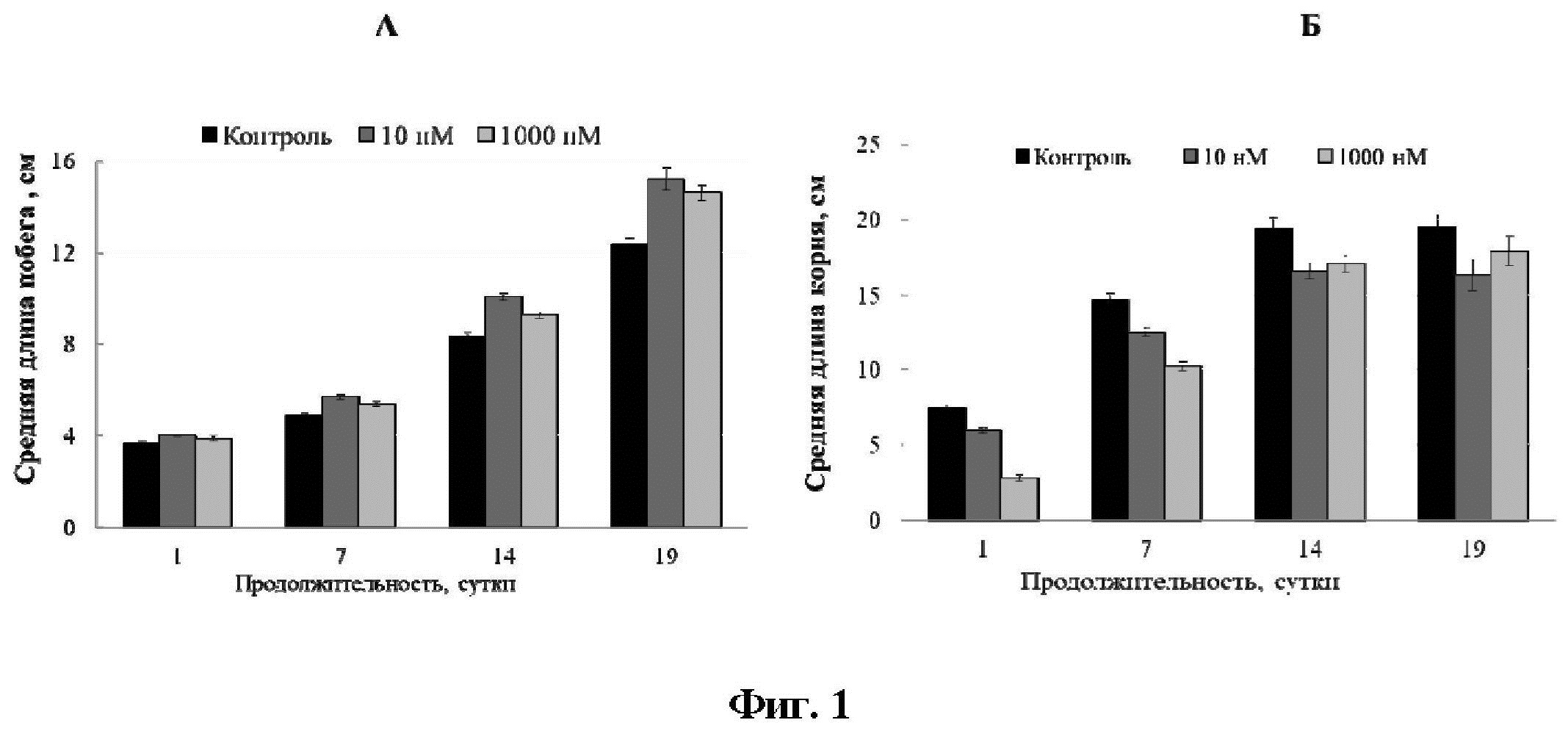 Изобретение относится к биотехнологии и может быть использовано в сельском хозяйстве для повышения продуктивности растений картофеля и/или их защиты от действия абиотических стрессоров, в частности хлоридного засоления при выращивании на открытом грунте или закрытом грунте. Одной из причин сокращения площади земель, доступных для сельского хозяйства, является засоление. Выращивание сельскохозяйственных культур на засоленных территориях приводит к снижению их продуктивности, что, в свою очередь, сопровождается серьезными экономическими потерями. Применение соединений гормональной природы для повышения продуктивности растений в условиях абиотического стресса является эффективной и безопасной технологией. Стероидные гормоны демонстрируют протекторные свойства в условиях хлоридного засоления. Брассиностероиды с лактоновым кольцом, к которым относится 24-эпибрассинолид (ЭБЛ), являются наиболее активными и применяются для создания агропрепаратов. Ранее показана эффективность фунгицидной композиции, главным составляющим которой является ЭБЛ, при обработке вегетирующих растений и семян (Пат. BY 022248). Известен способ повышения роста и развития растений комплексным препаратом для предпосевной обработки семян на основе брассиностероидов. В состав препарата входят: брассинолид 250-350 мг/л, гумат 8-12 г/л, кальциевый бентонит 35-45 г/л, автолизат пивных дрожжей 10-14 г/л. Изобретение позволяет ускорить прорастание семян яровой пшеницы и развитие проростков, в частности, приводит к достоверному увеличению их длины (Пат. RU 2728677). Основной недостаток способа заключается в необходимости использования ряда химических соединений, в том числе брассинолида, в относительно высокой концентрации, что сопровождается увеличением финансовых затрат при выращивании растений. Известен способ повышения устойчивости растений эпибрассинолидом. Технология предполагает предпосевную обработку семян томатов в течение 10-12 часов раствором фитопрепарата, в его состав включен эпибрассинолид в концентрации 10 нМ/л, с последующей вторичной обработкой молодых растений раствором эпибрассинолида в концентрации 10 мкМ/л при норме расхода 2-3 мл/растение. Изобретение позволяет стимулировать рост и развитие растений, усиливать процессы генеративного развития и повышать продуктивность на фоне стрессовых условий (Пат. RU 2349088). Показано увеличение количества плодов томатов и ускорение наступления фазы бутонизации. Основной недостаток способа - вторичная обработка растений фитопрепаратом, гормон в котором находится в высокой концентрации, что приводит к повышенному расходу эпибрассинолида, и также способствует удорожанию конечного продукта. Ранее был разработан способ повышения устойчивости растений рапса к интенсивному хлоридному засолению, включающий культивирование растений рапса в условиях хлоридного засоления и обработку растений раствором биологически активного вещества, отличающийся тем, что растения рапса культивируют на питательной среде Хогланда-Снейдера в течение трех недель, после чего растения подвергают засолению хлоридом натрия при концентрации приблизительно 175 мМ, во время которого в раствор двукратно вносят 24-эпибрассинолид, в первый день засоления и через 7 суток после засоления (Пат. RU 2522519). Основными недостатками способа