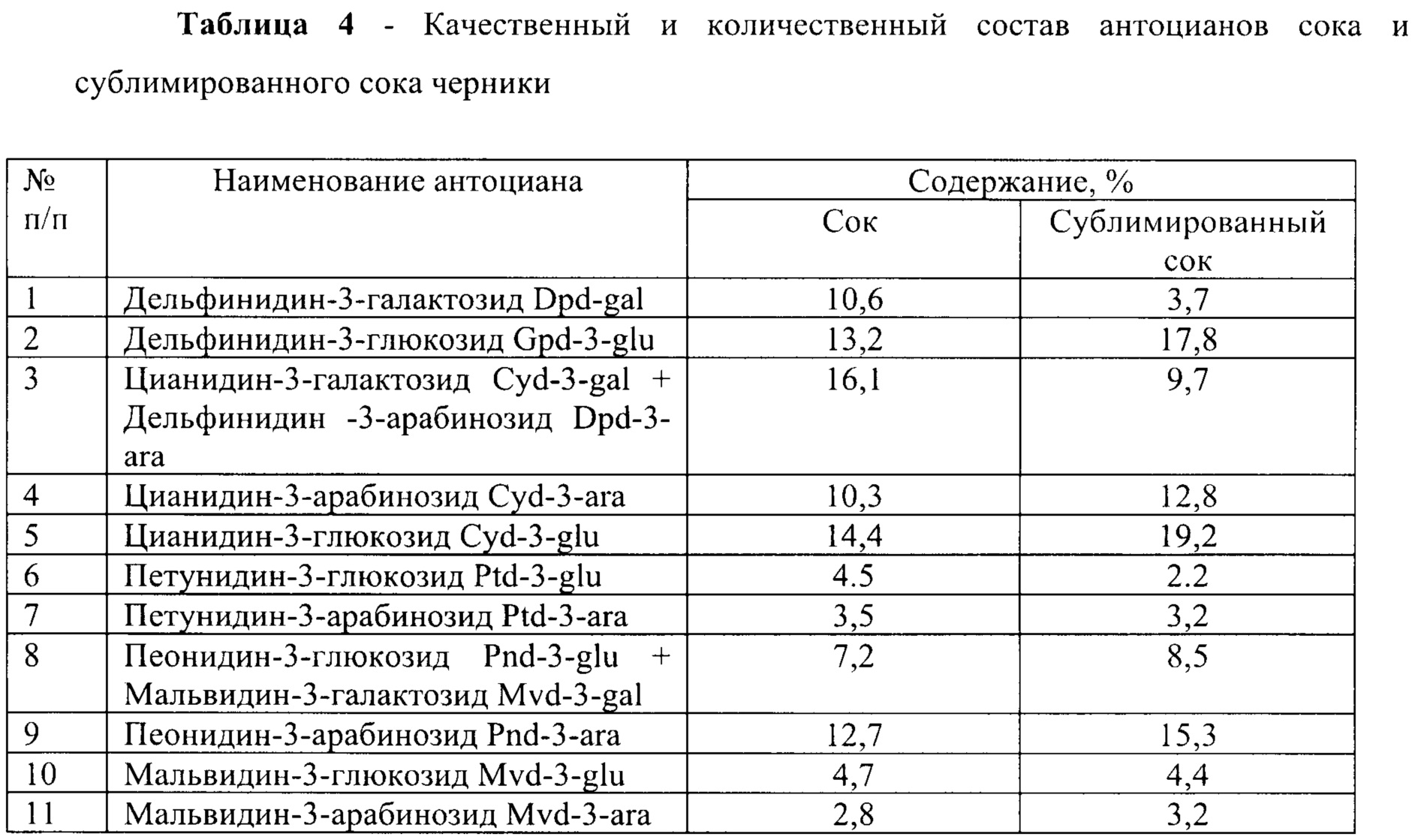 В семействе флавоноидов особое место занимают антоцианы, обусловливающие характерную окраску ягод и продуктов их переработки. Доказана роль антоцианов в укреплении стенок сосудов и соединительной ткани как антиоксидантных и бактерицидных агентов. Результаты проведенных исследований свидетельствуют, что нативный и сублимированные соки содержат значительные количества антоциановых пигментов: 2594 мг/100 г а.с.в. и 2230 мг/100 г а.с.в., соответственно: потери антоцианов при сублимации составили 14% (таблица 1). Анализ профиля антоцианов соков черники показал наличие специфических индивидуальных антоцианов, построенных на основе пяти антоцианидинов - цианидина, дельфинидина, петунидина, пеонидина, мальвидина, гликозилированных остатками глюкозы, галактозы, арабинозы (таблица 4).