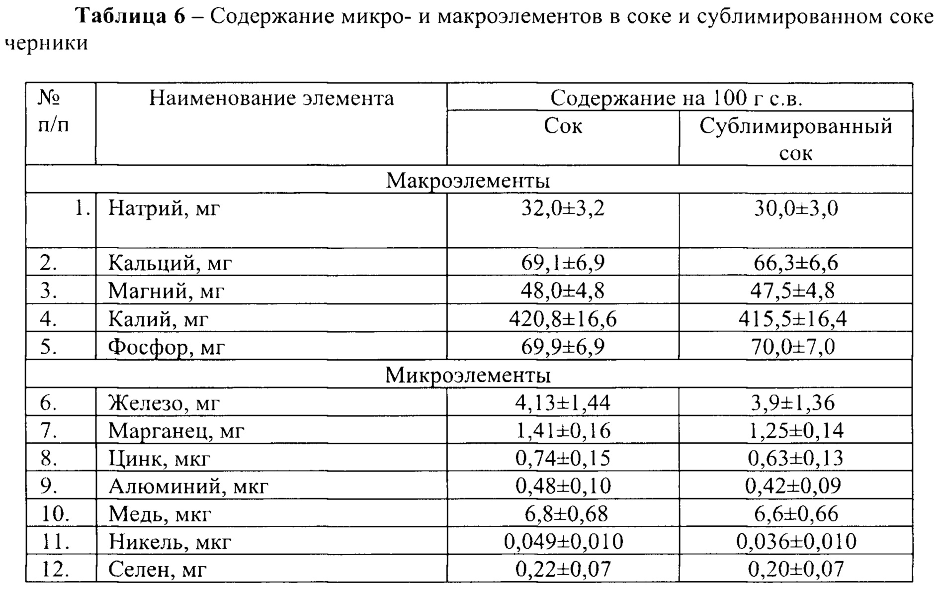 Проведен анализ макро-, микроэлементного состава нативного и сублимированного соков черники (таблица 6). По данным таблицы 6 следует, что соки содержат богатый набор минеральных компонентов, выполняющих многочисленные функции в организме человека.