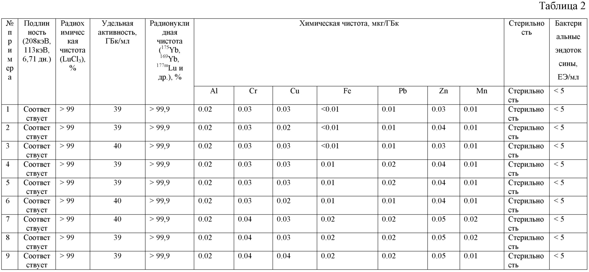 Способ получения фармацевтической субстанции на основе лютеция-177 из облученного в ядерном реакторе иттербия-176, включающий приготовление рабочего раствора разделяемых элементов в соляной кислоте, сорбцию лютеция-177 и иттербия из рабочего раствора на колонке, содержащей в качестве сорбента аммонийную ионную форму сильнокислого сульфокатионита на основе сополимера стирола и дивинилбензола, объем сорбента в колонке устанавливают с учетом массы иттербия в рабочем растворе, размер частиц сорбента составляет 200-400 меш (38-75 мкм), промывку колонки дистиллированной водой, разделение лютеция-177 и иттербия посредством промывки колонки раствором α-гидроксиизобутирата аммония, порционный сбор (фракционирование) вытекающего из колонки раствора (элюата), а также повторное катионообменное разделение лютеция-177 и иттербия, отличающийся тем, что доводят pH рабочего раствора до значения в интервале от 2 до 5 с помощью раствора гидроксида аммония концентрацией 2 моль/л, при пропускании которого через колонку сорбируют иттербий и лютеций-177 в верхней части термостатируемой колонки при температуре 50-80°С, имеющей высоту слоя сорбента не менее 20 см, причем отношение высоты колонки к её диаметру составляет не менее 10, для элюирования лютеция-177 и иттербия последовательно используют дистиллированную воду и раствор α-гидроксиизобутирата аммония концентрацией от 0,1 до 0,3 моль/л, с рН от 3,5 до 5,0, со скоростью фильтрации от 0,1 до 1,0 мл/(мин⋅см2), непрерывную сорбцию лютеция и иттербия осуществляют в индивидуальные ионообменные колонки, содержащие в качестве сорбента H+-форму сильнокислого сульфокатионита на основе сополимера стирола и дивинилбензола,