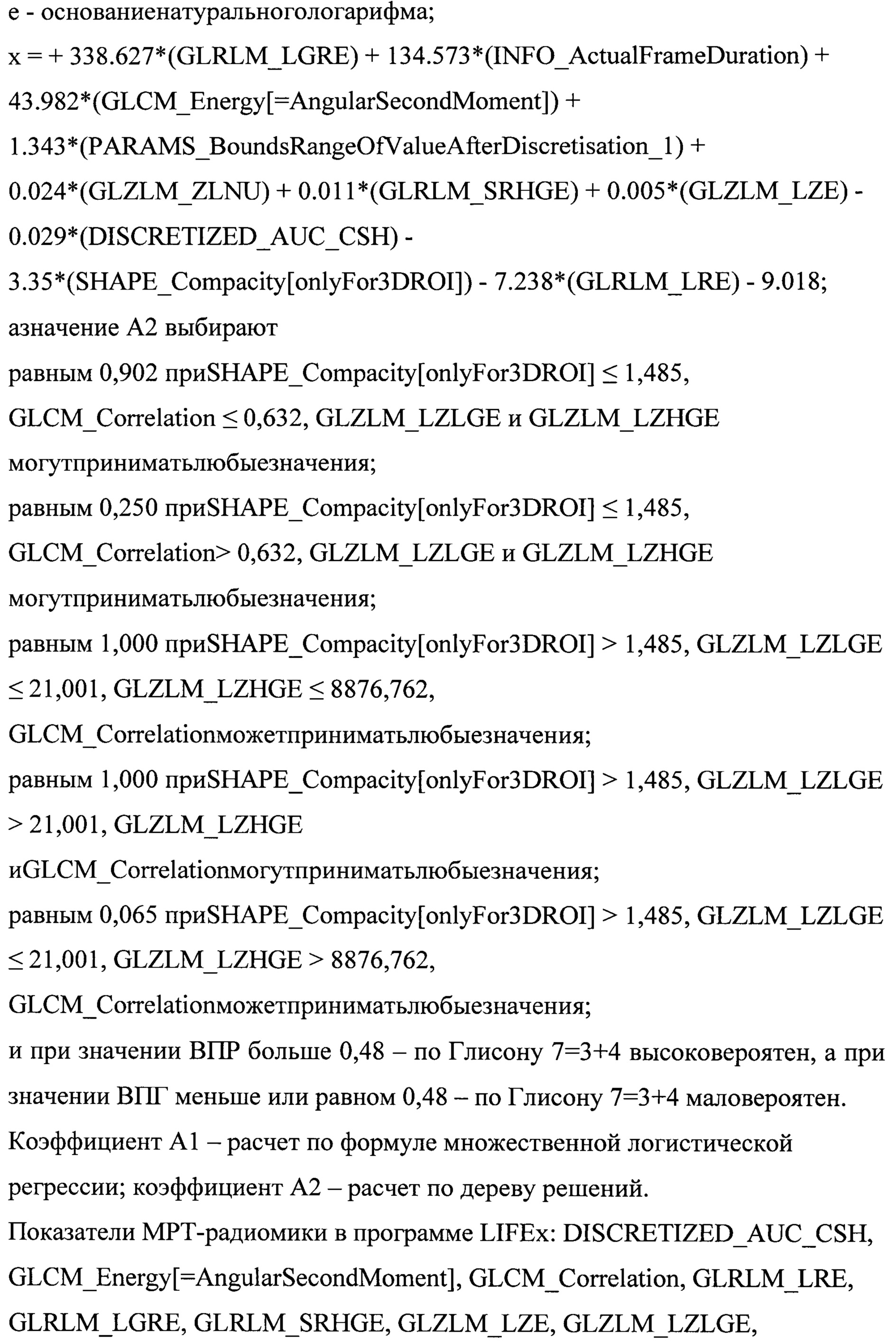 Рак предстательной железы - злокачественное новообразование эпителиальной или мезенхимальной структуры, развивающееся из клеток предстательной железы. • С61 Рак предстательной железы Новизна 1. Заключается в предложении способа оценки вероятности степени злокачественности по шкале Глисона 7=3+4 и 7=4+3 при ацинарной аденокарциноме предстательной железы у мужчин с промежуточной степенью злокачественности (Gs=7), включающего выполнение магнитно-резонансной томографии предстательной железы на высокопольном МР-томографе в соответствии со стандартами сканирования выбранной зоны, определение количественных показателей данных МРТ-радиомики, полученных в программе LIFEx: DISCRETIZED_AUC_CSH, GLCM_Energy[=AngularSecondMoment], GLCM_Correlation, GLRLM_LRE, GLRLM_LGRE, GLRLM_SRHGE, GLZLM_LZE, GLZLM_LZLGE, GLZLM_LZHGE, GLZLM_ZLNU, SHAPE_Compacity[onlyFor3DROI], INFO_ActualFrameDuration, PARAMS_BoundsRangeOfValueAfterDiscretisation_1; а также расчет прогностического коэффициента ВПР по формуле. Описание Область техники Изобретение относится к области медицины (по МПК - измерения для диагностических целей в медицине), а именно к лучевой диагностике (магнитно-резонансной томографии), урологии и онкологии, и может быть использовано для оценки вероятности выявления по Глисону 7=3+4 и 7=4+3 при ацинарной аденокарциноме предстательной железы у мужчин при первичной диагностике патологии предстательной железы. Уровень техники У данного изобретения не существует аналогов, позволяющих достичь подобных технических результатов. В литературе не описано ни одной математической модели для расчета вероятности выявления 7=3+4 и 7=4+3 при ацинарной аденокарциноме предстательной железы на основе данных количественной оценки бпМР-радиомики. Раскрытие изобретения Согласно данным Российского Центра информационных технологий и эпидемиологических исследований в области онкологии, рак предстательной железы (РПЖ) занимает второе место среди мужчин в структуре онкологических заболеваний в Российской Федерации на 2021 год, составляя 15,1%. За последние десять лет наблюдается значительный рост заболеваемости РПЖ как во всем мире, так и в России. В РФ за последние десять лет заболеваемость РПЖ выросла на 17,2%. В 2021 году от злокачественных новообразований в Российской Федерации умерло 278 992 человека, причем РПЖ стал причиной смерти у 8,6% мужчин, умерших от злокачественных новообразований. За последние десять лет смертность от РПЖ в Российской Федерации выросла на 23,87% и составляет 19 случаев на 100000 населения (в сравнении с 15,9 случаев на 100 000 в 2011 году). [Под ред. А.Д. Каприна, В.В. Старинского, А.О. Шахзадовой Злокачественные новообразования в России в 2021 году (заболеваемость и смертность) - М.: МНИОИ им. П.А. Герцена - филиал ФГБУ «НМИЦ радиологии» Минздрава России, - 2022. - илл. - 252 с.]. Несмотря на совершенствование методов диагностики РПЖ и внедрение ПСА-мониторинга, заболеваемость запущенными формами РПЖ в России остается высокой. Ацинарная аденокарцинома является самым распространенным типом злокачественной опухоли при раке предстательной железы (ААПЖ). Она составляет около 95% всех диагностируемых опухолей данной локализации. «Золотым стандартом» диагностики РПЖ: определение распространенности опухолевого процесса (стадирование) - являются результаты биопсии - оценка степени риска по шкале Глисона [Epstein Л. Prostate cancer grading: a decade after the 2005 modified system. ModPathol 2018; 31: S47-S63]. Впервые шкала была предло