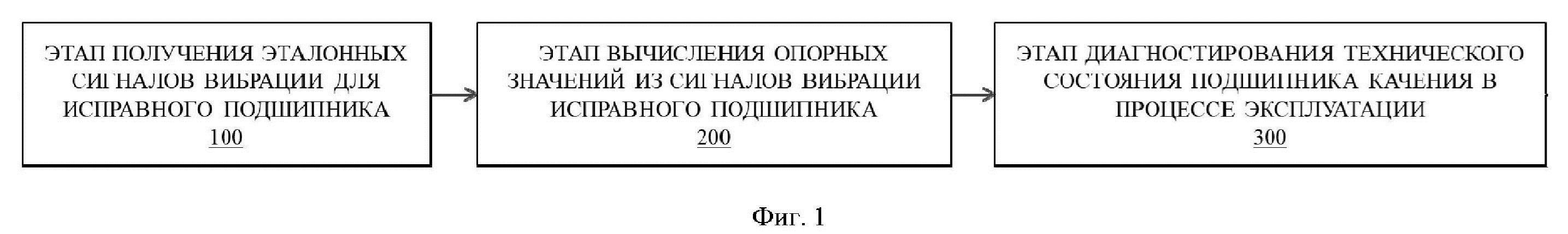 Область техники Изобретение относится к области измерительной техники, а именно к диагностированию технического состояния подшипников качения, и может быть использовано для оценки и мониторинга текущего технического состояния вращающихся машин, узлов и механизмов сложных технических систем предприятий с непрерывным циклом производства по виброизмерениям в режиме реального времени. В частности, механизмов и агрегатов с нанесенным на рабочую поверхность многофункциональным покрытием из композиционных материалов на базе фаз с многокомпонентной основой, с целю повышения эксплуатационных характеристик (износостойкость, коррозионностойкость, жаропрочность и др.) для горнодобывающей, нефтеперерабатывающей, металлургической и машиностроительной промышленности. Уровень техники Известен способ виброакустической диагностики подшипников качения (патент SU №1787269, опубл. 11.06.1990, МПК G01M 13/04), согласно которому измеряют амплитудный спектр вибрации элементов подшипников при вращении его под нагрузкой, выделяют составляющие спектра вибрации в заданном диапазонах частот и судят о состоянии элементов подшипника при измерении амплитудного спектра вибрации элементов подшипника при обратном вращении, выделяют составляющие этого спектра в заданном диапазоне частот, определяют сдвиг частот составляющих относительно эталонного значения, по сдвигу частот судят о наличии дефекта, по сравнению максимальных значений амплитуд составляющих спектра вибрации подшипника при прямом и обратном вращении определяют место дефекта и его параметры. Известен способ контроля технического состояния подшипников качения (патент SU №1649348, опубл. 15.05.1991, МПК G01M 13/04), согласно которому выделяют сигнал вибрации подшипникового узла, при котором измеряют величину амплитуды сигнала пропорционального виброускорению. Определяют максимальное значение амплитуды и устанавливают пороговое значение на 5 дБ ниже максимального, измеряют число импульсов сигнала, имеющих величину выше порогового значения и по отношению числа импульсов к суммарной длительности судят о техническом состоянии подшипникового узла, и при величине этого отношения более 5 считают подшипник имеющим повреждения. Известен способ диагностики подшипниковых узлов (патент SU № 1691702, опубл. 15.11.1991, МПК G01M 13/04), согласно которому выделяют сигнал огибающей случайных вибраций, контролируют наличие импульсного сигнала и при его появлении выделяют максимальную составляющую из гармоник спектра информативных частот, определяют отношение постоянной составляющей спектра к уровню максимальной переменной, и по величине этого отношения оценивают техническое состояние подшипника. Известен способ диагностики подшипников (патент RU №2209410, опубл. 21.11.2001, МПК G01M 13/04), заключающийся в расчете характерных частотных масок для отдельных элементов подшипника, вносящих доминирующий вклад в его вибрацию, и последующем измерении сигнала вибрации подшипника при его вращении, преобразовании полученного сигнала в цифровую форму с образованием не менее двух его равновеликих реализаций, проведении быстрого преобразования Фурье, выделении амплитудного спектра, сравнении его с рассчитанными частотными масками для отдельных элементов подшипника, определении доли вклада каждого из этих элементов в общую эн