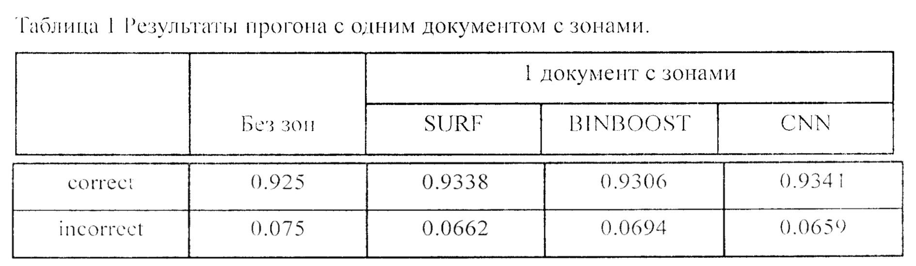 Таким образом, сущность заявленного технического решения заключается в том, что предлагается использовать уникальные глобальные особенности документов, представляемые в виде зон, для отклонения ложных ответов системы локализации и идентификации документов, тем самым повышая качество и надежность системы и последующего распознавания документов.