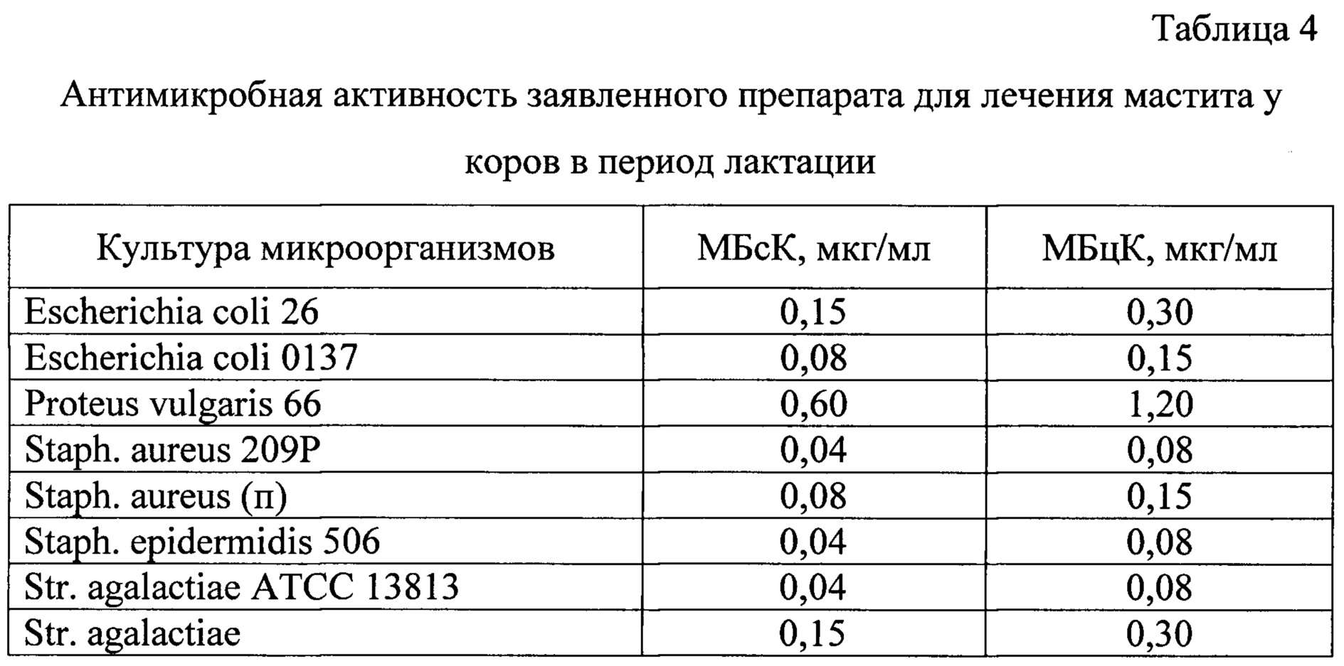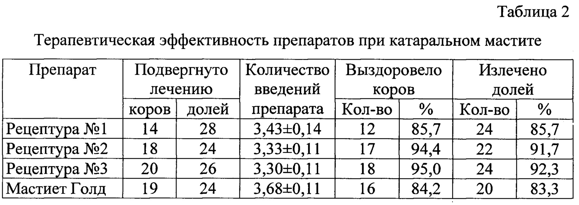 Препарат для лечения мастита у коров в период лактации, содержащий цефалоспорин, преднизолон и основу, отличающийся тем, что в качестве цефалоспорина используют цефтиофура гидрохлорид, в качестве основы - эмульгатор, моноглицериды дистиллированные и масло вазелиновое, и дополнительно содержит марбофлоксацин при следующем соотношении компонентов, мас. %:Марбофлоксацин 3,20-4,80 Цефтиофура гидрохлорид 1,80-2,70 Преднизолон 0,32-0,48 Моноглицериды дистиллированные 1,00 Эмульгатор 3,00 Масло вазелиновое до 100