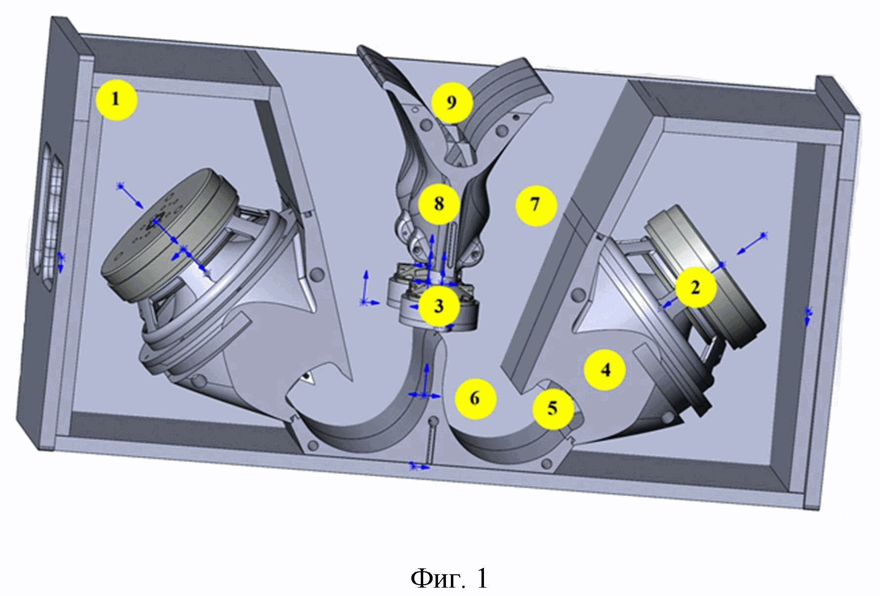 Область техники, к которой относится изобретение Изобретение относится к электроакустике, в частности к аудиосистемам, а именно к устройству двухполосного элемента линейного массива для формирования цилиндрического (тороидального) фронта волны во всем рабочем диапазоне частот. Уровень техники Для озвучивания пространств с высоким уровнем отражения звука еще полвека назад стали использовать линейные массивы, что позволяло уменьшить вертикальное рассеивание звука. Применение линейных массивов снижало вертикальное рассеивание звука, что увеличивало разборчивость и четкость звучания, что продемонтрировал еще доктор Гарри Олсон, выдающийся инженер и изобретатель в области акустической инженерии прошлого века. Линейный массив представляет собой акустическое устройство, состоящее из нескольких модулей, образующих такое же звучание, как и один громкоговоритель, равный по размерам общему набору модулей. Громкоговорители линейного массива обычно выполняют в форме трапеции и соединяют их друг с другом. Характерным для линейных массивов является то, что расстояние между источниками звука меньше или равно половине длины волны воспроизводимой частоты. Фронт звуковых волн создается несколькими источниками звука и имеет форму цилиндра при определенных частотах. На самом деле, идеальная форма фронта напоминает тороид: с удалением от динамиков покрываемая звуком поверхность линейно увеличивается, при этом высота площади остается постоянной, ширина увеличивается, а уровень звукового давления уменьшается. Линейный массив включает несколько источников звука, что формирует вытянутый волновой фронт вместо сферического, как у отдельного громкоговорителя или нелинейного массива. Длина массива кроме того влияет на передачу звуковых волн определенной длины, соответственно, чем длиннее массив, тем более низкий по частоте звук (более длинные волны) будет иметь узкую форму направленности. На рынке аудиотехники, а также в патентных источниках представлены различные конструкции линейных массивов. К примеру, компания L-Acoustics выпускает 2-полосные акустические системы https://www.l-acoustics.com/products/kara-ii/(дата обращения: 15.07.2024 г.). Конструкции этих элементов линейных массивов не имеют низкочастотных волноводов. В заявке PCT WO2004071129 «MULTIMEDIA LOUDSPEAKER» (МПК H04R1/26; H04R1/32, приоритет: 07.02.2003 г) раскрыт двухполосный громкоговоритель, обладающий следующими тремя характеристиками: рупорный высокочастотный динамик (2) с узким рассеиванием звука в вертикальной плоскости, установленный таким образом, что его опорная ось излучения расположена под углом от 10 до 40 градусов относительно горизонтальной плоскости. поверхность стола; блок НЧ/СЧ (3), установленный близко к поверхности стола так, чтобы его акустический центр находился на расстоянии менее 63 мм от горизонтальной поверхности стола; кроссовер с частотой пересечения ниже первого минимума результирующей АЧХ громкоговорителя НЧ/СЧ, возникающий в результате интерференции прямой звуковой волны и звуковой волны, отраженной от поверхности стола. Изобретение обеспечивает ровную частотную характеристику как стоя на столе, так и в свободном пространстве. Все другие известные мультимедийные громкоговорители (предназначенные для установки на столе) страдают от интерференции между прямой звуковой волной и зву