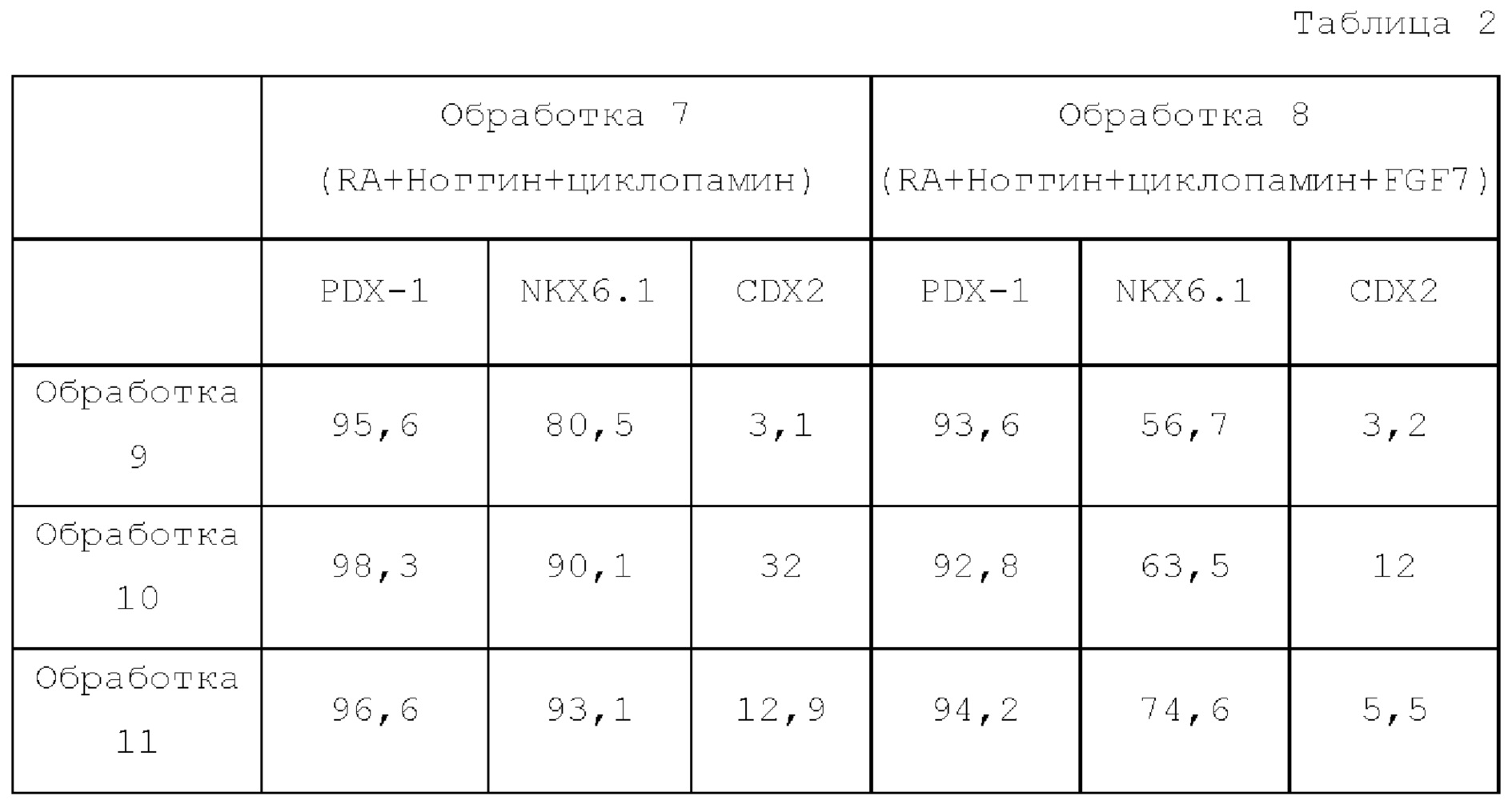 Культуры, обработанные Т8 с последующей обработкой средой Т9, формировали популяцию клеток, экспрессирующих маркеры, характерные для линии панкреатической энтодермы, где 56,1% клеток популяции экспрессировали NKX6.1. См. таблицу 2. Культуры, обработанные Т8 с последующей обработкой средой Т10, формировали популяцию клеток, экспрессирующих маркеры, характерные для линии панкреатической энтодермы, где 63,5% клеток популяции экспрессировали NKX6.1, после обработки отмечалось возрастание числа клеток, экспрессирующих CDX2. См. таблицу 2. Культуры, обработанные Т8 с последующей обработкой средой Т11, формировали популяцию клеток, экспрессирующих маркеры, характерные для линии панкреатической энтодермы, где 74% клеток популяции экспрессировали NKX6.1. См. таблицу 2. Большинство экспрессирующих NKX6.1 клеток также экспрессировали PDX 1.