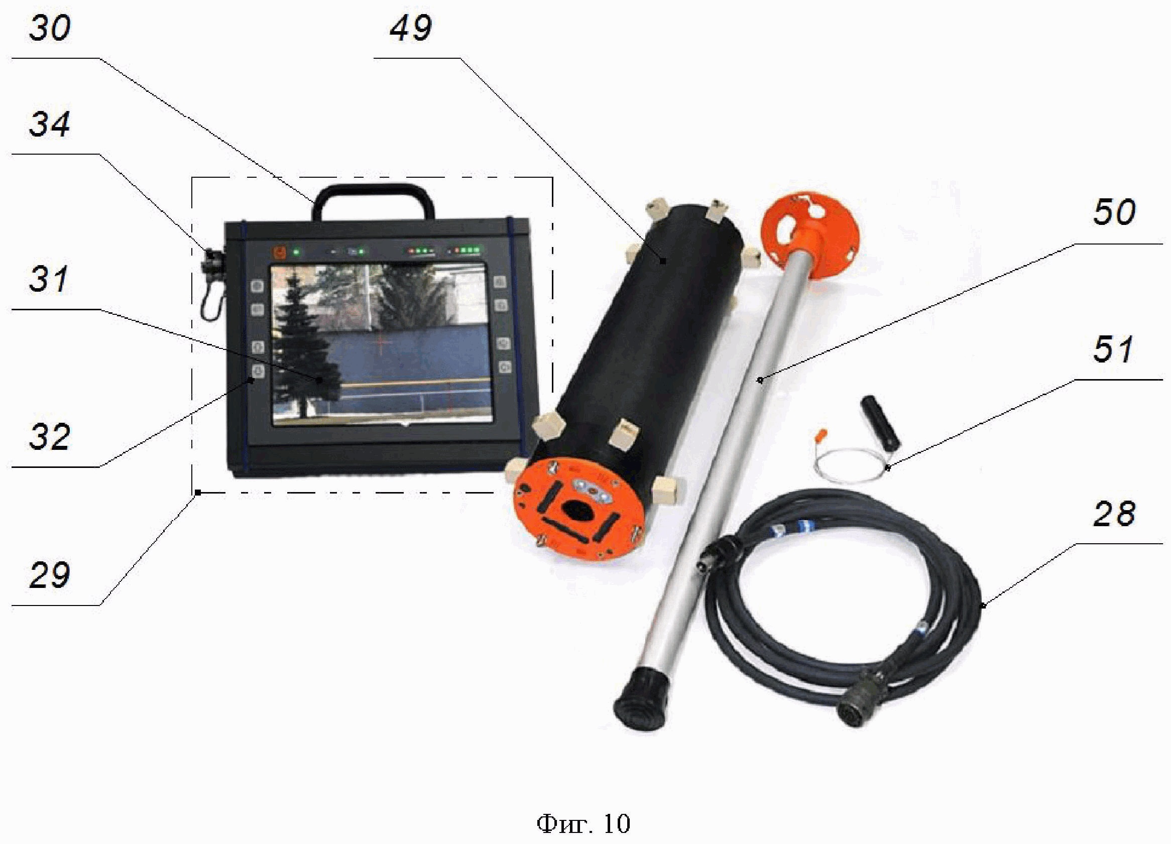 1. Способ определения оси канала ствола для выверки прицелов военной техники, основанный на реализации алгоритма юстировки устройства выверки и последующей выверки прицельных приспособлений, заключающийся в следующем: - использование программной обработки изображения, формируемого телевизионной камерой, размещенной внутри канала ствола со стороны дульного среза, входящей в состав зонда устройства выверки, представляющего собой цилиндрический корпус с двумя активными центрирующими устройствами по торцам, обеспечивающими расположение оптической оси камеры вдоль оси зонда в канале ствола в направлении точки прицеливания, - нацеливание марки устройства выверки приводами наведения ствола на любую точку на местности или мишени, находящейся в поле зрения камеры зонда на любом расстоянии, с обеспечением резкого изображения, знак или точку на выверочной карточке или контрольно-выверочной мишени, - автоматическое определение положения истиной оси канала ствола в режиме юстировки устройства выверки с помощью алгоритма программного обеспечения в статическом положении ствола, заключающегося в фиксации положения выбранной точки наводки при помощи подвижной марки на дисплее пульта управления при многократном последовательном развороте зонда на угол не более 90°, и последующего построения окружности, описанной точками подвижной марки, определении пикселей матрицы камеры, соответствующих центру этой окружности, - формирование перекрестия марки, лежащей на истиной оси ствола, совпадающей с центром, содержащим найденные пиксели, и наложением на изображение местности перекрестия сформированной марки, что определяет истинное положение оси канала ствола с устранением рассогласования оптической оси камеры устройства выверки и механической оси зонда, вызванных кривизной ствола и точностью изготовления деталей зонда, - производство выверки прицелов по окончании юстировки устройства выверки путем наведения на знак или точку на выверочной карточке или мишени, ствола орудия с помощью приводов вертикального и горизонтального наведения до совпадения марки устройства выверки на дисплее пульта управления, со знаком или точкой, с последующей оценкой рассогласования положений истинной оси ствола и прицельных марок прицелов вооружения, например, наводчика и командира, - в случае рассогласования прицельных марок прицелов наводчика и командира с положением истиной оси ствола и марки устройства выверки проводится выверка прицелов согласно эксплуатационной документации на объект обслуживания, - передача изображения местности на дисплей пульта управления устройства выверки от камеры зонда по беспроводному каналу, обеспечивающему работу с устройством, в том числе в боевых отделениях бронированных машин, - обеспечение многократного увеличения изображения местности на дисплее пульта управления для точности и удобства наведения марок устройства. 2. Устройство выверки прицелов военной техники для реализации способа по п. 1, отличающееся тем, что в состав устройства входят: - зонд в корпусе с двумя центрирующими устройствами, содержащий электронно-оптический блок (ЭОБ) с телевизионной камерой и блоком передачи данных; - пульт управления устройства выверки; - комплект кабелей для зарядки зонда, пульта управления, передачи дан