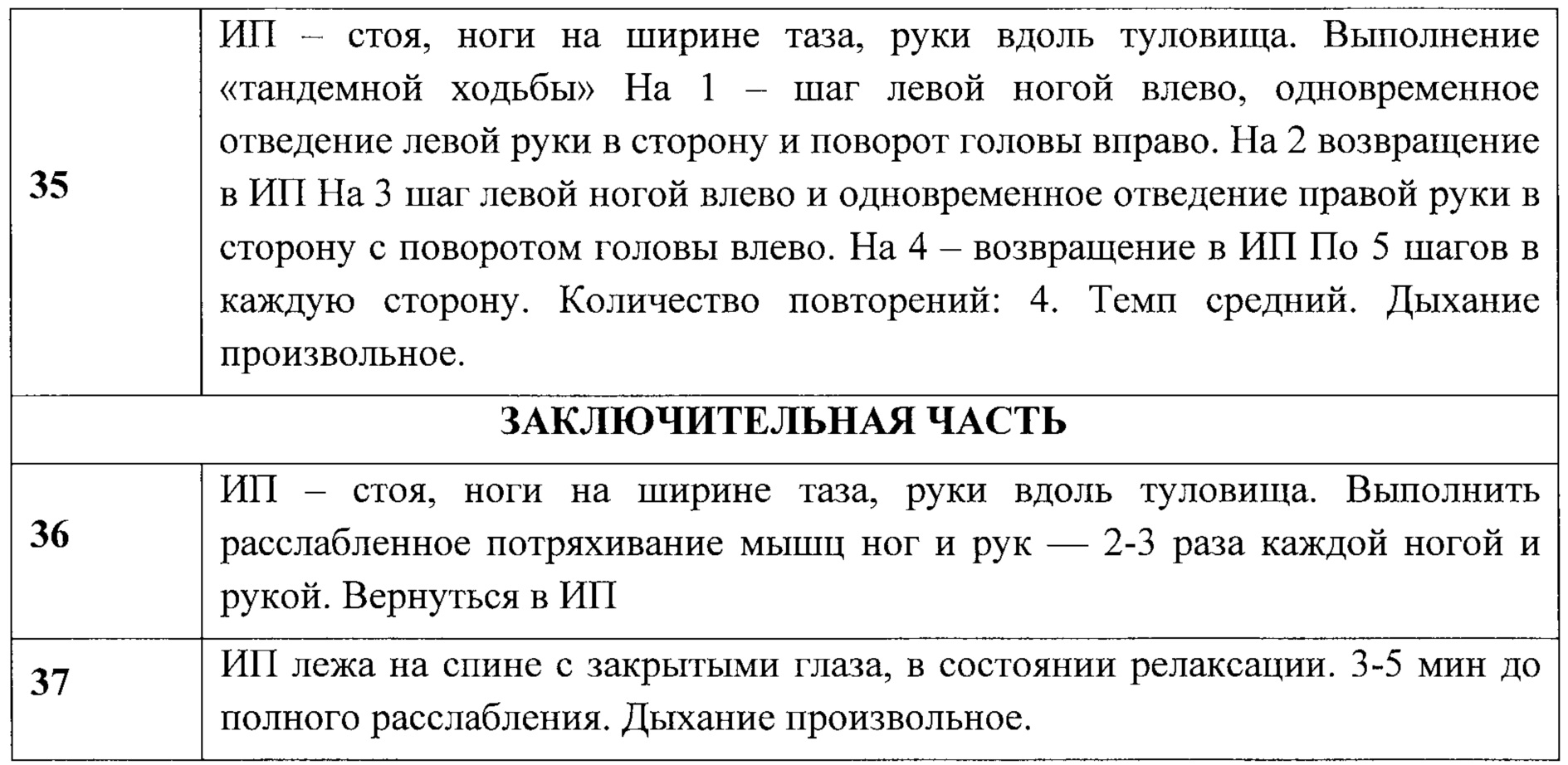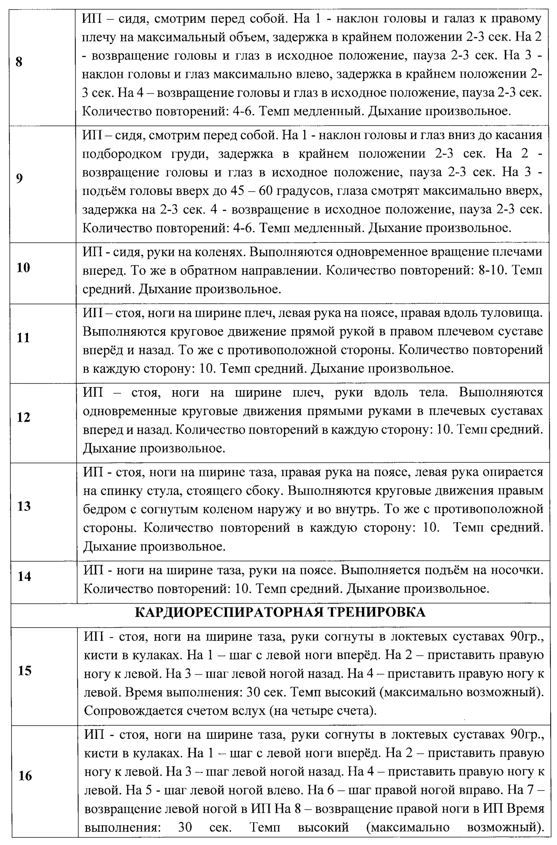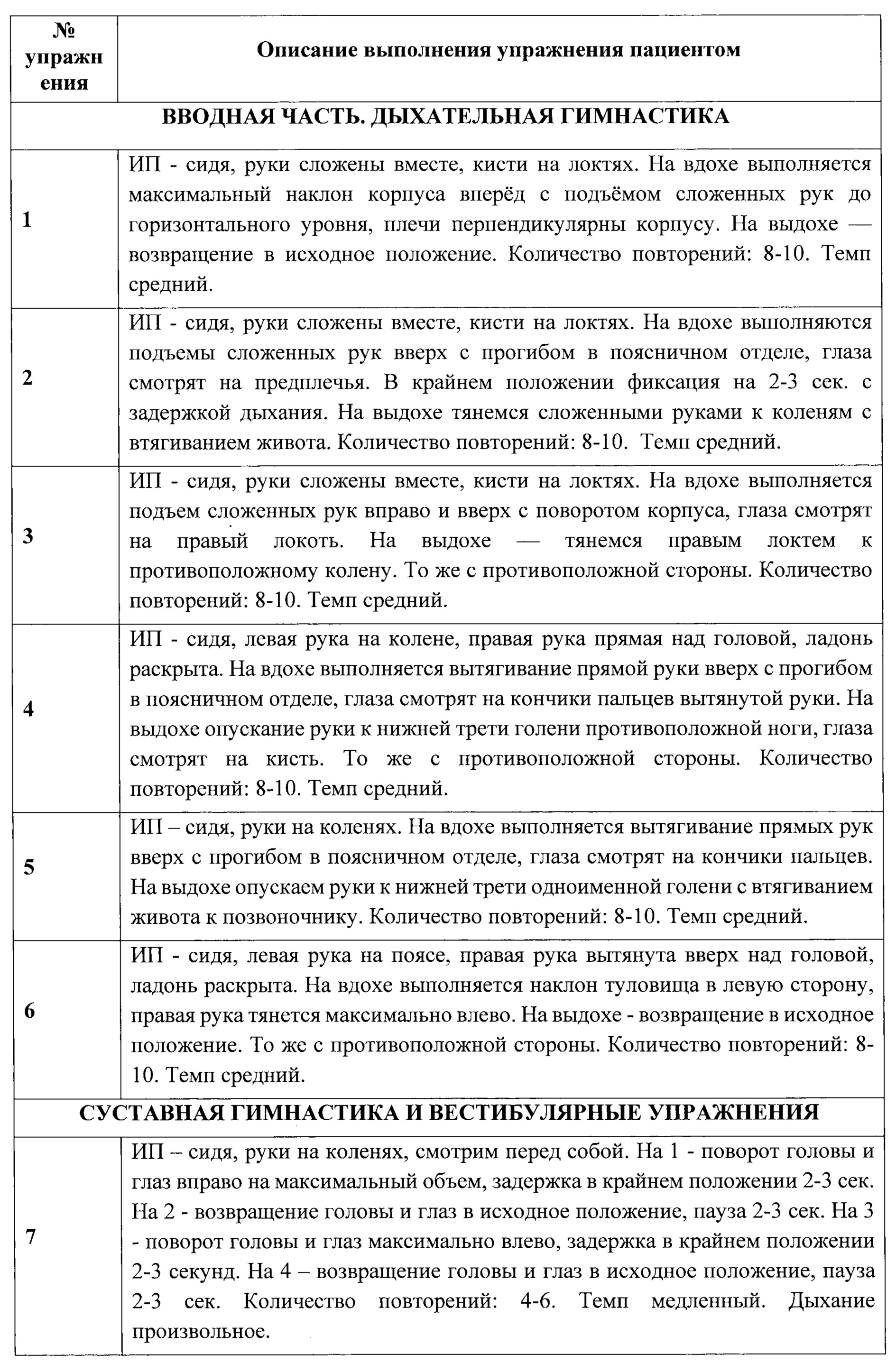 Способ пререабилитации онкологических пациентов перед полостными операциями с помощью кинезиотерапии, включающий в себя проведение комплекса лечебной физкультуры, состоящего из дыхательной гимнастики, кардиореспираторной тренировки, упражнений на баланс в течение 2 недель до предстоящей операции, отличающийся тем, что на первом упражнении кисти рук располагают на локтях, на вдохе выполняют максимальный наклон корпуса вперёд с подъёмом сложенных рук до горизонтального уровня, на выдохе возвращение в исходное положение; на втором упражнении кисти рук располагают на локтях, на вдохе выполняют подъемы сложенных рук вверх с прогибом в поясничном отделе, при этом смотрят на предплечья, фиксируют крайнее положение на 2-3 секунды с задержкой дыхания, на выдохе тянутся сложенными руками к коленям с втягиванием живота; на третьем упражнении кисти рук располагают на локтях, на вдохе выполняют подъем сложенных рук вправо и вверх с поворотом корпуса, смотрят на правый локоть, на выдохе тянутся правым локтем к противоположному колену, после 8-10 повторений то же выполняют с противоположной стороны; на четвертом упражнении левую руку располагают на колене, правую руку выпрямляют над головой с раскрытой ладонью, на вдохе выполняют вытягивание прямой руки вверх с прогибом в поясничном отделе, при этом смотрят на кончики пальцев вытянутой руки, на выдохе опускают руку к нижней трети голени противоположной ноги, продолжают смотреть на кисть, после 8-10 повторений то же выполняют с противоположной стороны; на пятом упражнении руки располагают на коленях, на вдохе выполняют вытягивание прямых рук вверх с прогибом в поясничном отделе, смотрят на кончики пальцев, на выдохе опускают руки к нижней трети одноименной голени с втягиванием живота к позвоночнику; на шестом упражнении левую руку располагают на поясе, правую руку вытягивают над головой с раскрытой ладонью, на вдохе выполняют наклон туловища в левую сторону, правую руку тянут максимально влево, на выдохе возвращают в ИП, после 8-10 повторений то же выполняют с противоположной стороны; после чего переходят к выполнению основной части, состоящей из суставной гимнастики в сочетании с вестибулярными упражнениями, кардиореспираторной тренировки, общеукрепляющих упражнений и упражнений на баланс; суставная гимнастика в сочетании с вестибулярными упражнениями включает в себя 8 последовательных упражнений, выполняемых в ИП сидя с 1 по 4 упражнение, в ИП стоя с 5 по 8 упражнение, при этом: на первом упражнении руки располагают на коленях, смотрят перед собой, осуществляют максимальный поворот головы и глаз вправо, фиксируют крайнее положение на 2-3 секунды, возвращают голову и глаза в ИП, фиксируют ИП на 2-3 секунды, осуществляют максимальный поворот головы и глаз влево, фиксируют крайнее положение на 2-3 секунды, возвращают голову и глаза в ИП, фиксируют ИП на 2-3 секунды, количество повторений 4-6; на втором упражнении руки располагают на коленях, смотрят перед собой, осуществляют максимальный наклон головы и глаз к правому плечу, фиксируют крайнее положение на 2-3 секунды, возвращают голову и глаза в ИП, фиксируют ИП на 2-3 секунды, осуществляют максимальный наклон головы и глаз к левому плечу, фиксируют крайнее положение на 2-3 секунды, возвращают голову и глаза в ИП, фиксируют ИП на 2-3 секунды, коли