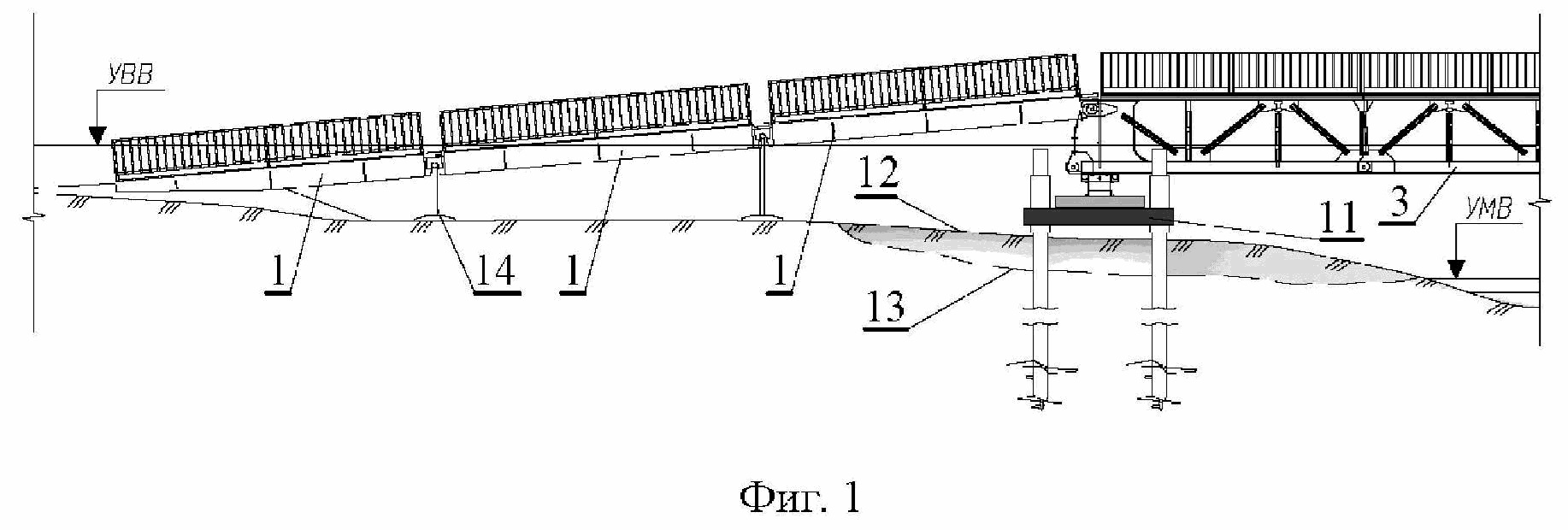 Изобретение относится к области устройства временных мостов. Оно, в частности может быть применено для обеспечения горизонтальной устойчивости однопутного автодорожного разборного моста САРМ-М [1] при воздействии на его устои и береговые (пойменные) опоры высоких и интенсивных паводков, в результате чего могут образоваться подмывы устоев и других береговых опор моста (стр. 123) [1], угрожающих горизонтальной устойчивости их и моста в целом. Известна конструкция поверхностного фундамента САРМ-М (рис. 47) [1], состоящего из верхнего ригеля опоры, устанавливаемого на опорную плиту, которая укладывается на грунт берега сразу в проектное положение. К верхнему ригелю крепится балансирная тележка, на неё опирается одна концевая секция пролётного строения моста в первом и последнем пролётах. Эта конструкция устоя принята в качестве прототипа изобретения. Одним из недостатков прототипа является то, что она не гарантирует устойчивости устоя при воздействии на него высоких паводков, которые затапливают подходы к устоям и образуют подмывы их и других береговых (пойменных) опор. В результате этого могут произойти перекосы и понижения уровня опорных плит устоев. Следствием этого, как показывает анализ прохода высоких паводков, возникают перекосы пролётных строений в первом и последнем пролётах моста. При катастрофических подъёмах воды возможно так же обрушение концов таких пролётных строений с устоев на грунт, что приведёт к повреждению моста и перерывам движения транспорта по повреждённому мосту. Авторы изобретения считают, что к катастрофическим подъёмам воды следует относить так же волну прорыва, возникающую при разрушении плотины или дамбы, расположенных выше моста по реке. Анализ опыта устройства и эксплуатации временных автодорожных мостов, включая автодорожные разборные мосты (АРМ) показывает, что во время прохода высоких, в том числе катастрофических паводков, устойчивость и прочность сохраняют в основном опоры с фундаментом из свай [2]. Технической задачей изобретения является разработка такой конструкции устоя для однопутного САРМ-М, которая обеспечит горизонтальную устойчивость (прочность) его и концевых частей моста при образовании подмывов устоев во время прохода высоких, в том числе катастрофических, паводков и волны прорыва. Указанная техническая задача решена за счет того, что инвентарный свайно-винтовой устой (ИСВУ) однопутного моста САРМ-М состоит: из свайно-винтового ростверка (СВР) с 4-мя винтовыми сваями; из верхнего ригеля промежуточной опоры; из 4-х узлов сопряжения ригеля ростверка с винтовыми сваями; из балансирной (опорной) тележки и других элементов ростверка (прил. 4) и береговой опоры (прил. 5) [1]. Отличается тем, что верхний ригель опоры с прикреплённой к нему балансирной тележкой опирается на два ригеля свайно-винтового ростверка; при этом в ростверке применены сваи с двумя витками, которые разнесены по длине ствола на полтора диаметра (рис. 3.3) [2]; при этом все сваи завинчены в грунты берега на такую глубину, при которой обеспечивается постоянное положение витков свай в грунте берега ниже уровня подмыва устоя. Основные элементы и узлы предлагаемой конструкции свайно-винтового устоя показаны на рисунке, где обозначено: фиг. 1 - фрагмент однопутного моста САРМ-М с одним свайно-винтовым устоем; фиг. 2 - вид с