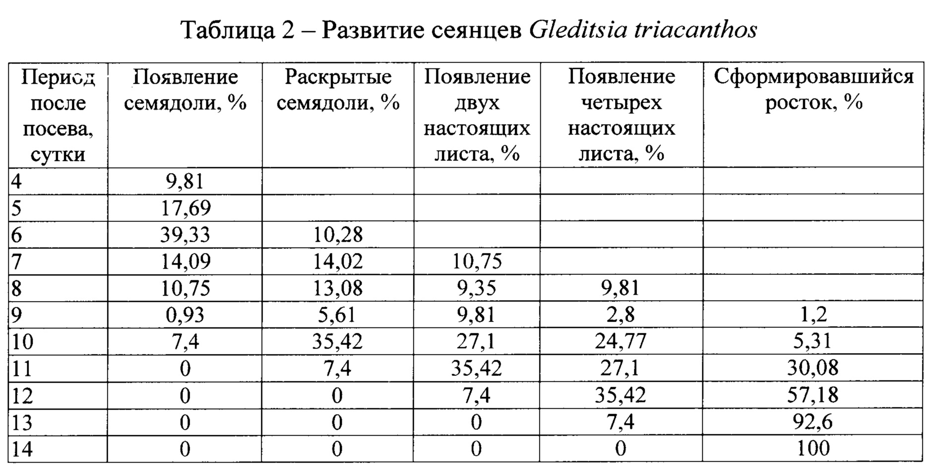 Изобретение относится к сельскому хозяйству. Предложен способ получения семенного материала акации белой, акации желтой и гледичии, включающий обработку семян перед закладкой на хранение, хранение семян и предпосевную активацию их жизнедеятельности. Перед закладкой на хранение семена помещают в сушильный шкаф на 2,5-4,5 часов при температуре 45-65°С, хранение семян проводят при температуре 21-24°С и относительной влажности воздуха 45-60%. При этом влажность семян при закладке на хранение у акации белой и желтой составляет 9-12%, а у гледичии - 10-11%, а предпосевную обработку проводят концентрированной серной кислотой 95,72%. Изобретение направлено на получение доброкачественных и жизнеспособных семян, увеличение срока хранения семян без риска заражения вредителями, повышение всхожести семян и энергии произрастания гипокотиля и улучшение развития органогенеза семян древесных растений с твердой оболочкой. 1 ил., 2 табл.