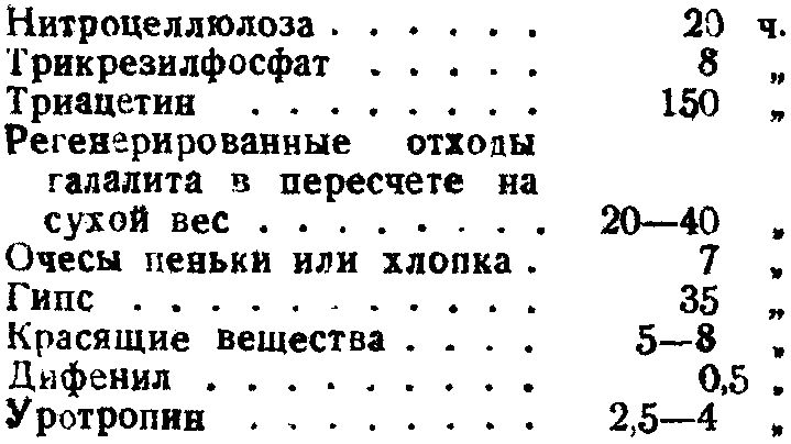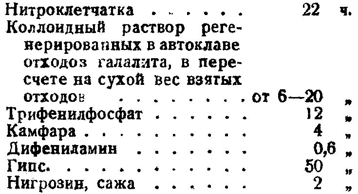 Описанный в вышеуказанном английском патенте способ обработки отходов галалита и нитроцеллюлозы не достигает главнейшей цели, т.е. превращения задубленного галалита в пластичный материал, способный заменить значительную часть эфира целлюлозы, так как при описанном способе измельченные отходы, обработанные горячей водой, при смешивании с нитроцеллюлозой имеют значение инертного наполнителя, как измельченные бакелитовые отходы при использовании их в прессовочных бакелитовых порошках, вследствие чего воспламеняемость изготовленных масс не понижается; точно так же снизить количество нитроклетчатки заменой отходами галалита не удается.