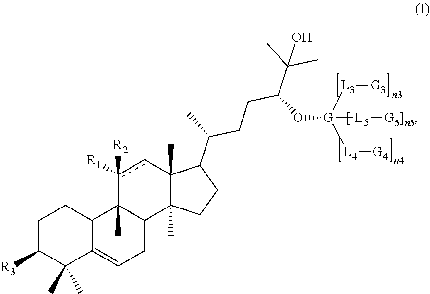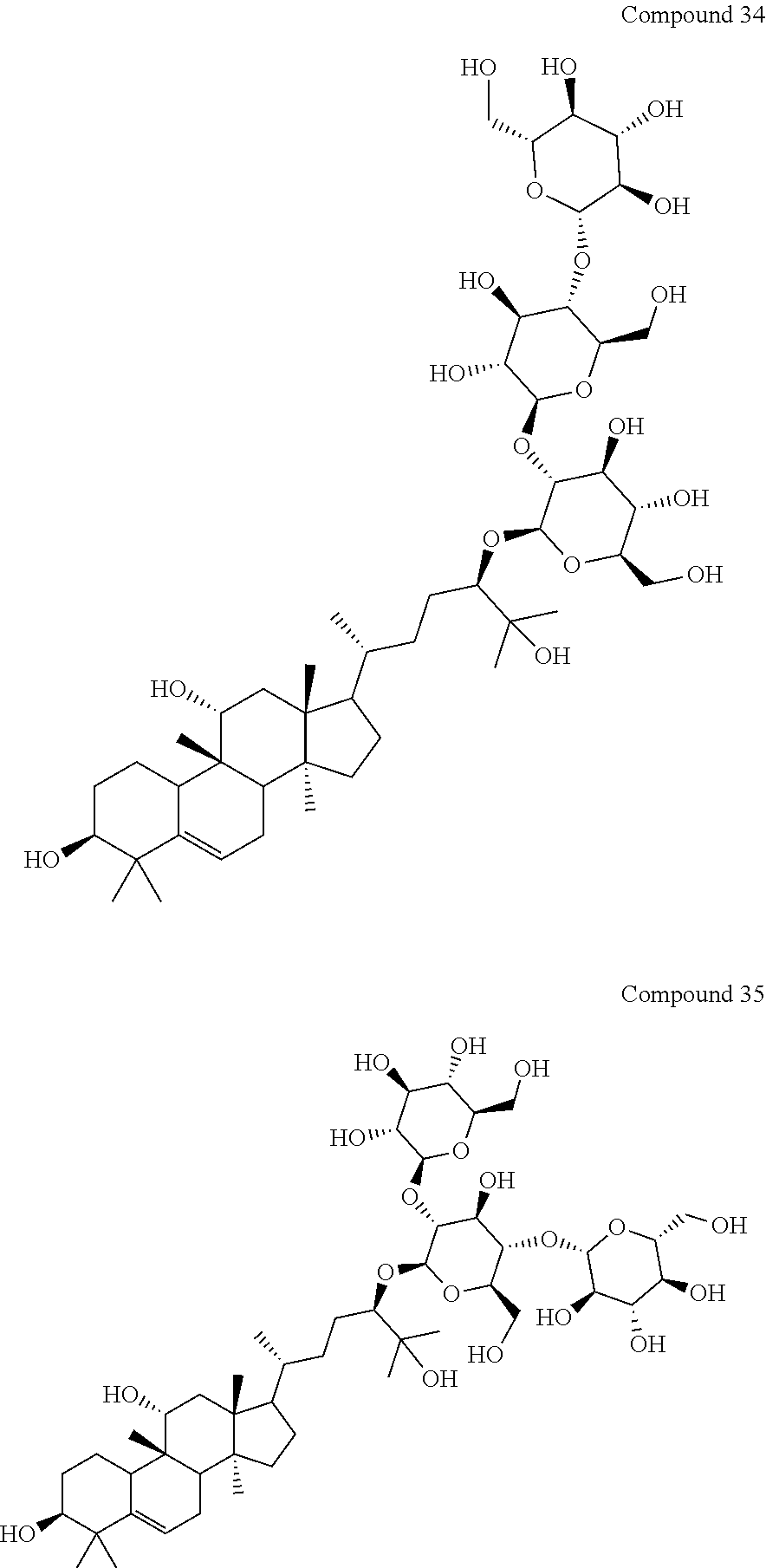 [0626]Compound 34:1H NMR (400 MHz, Pyridine-d5+D2O), selected signals: δ 5.62 (d, J=6.0 Hz, 1H), 5.24 (d, J=7.8 Hz, 1H), 5.01 (d, J=7.8, Hz, 2H), 3.85 (dt, J=6.3, 3.4 Hz, 1H), 3.70 (d, J=2.9 Hz, 1H), 1.44 (s, 3H), 1.39 (brs, 6H), 1.33 (s, 3H), 1.17 (s, 3H), 1.02 (d, J=6.4 Hz, 3H), 0.89 (s, 3H), 0.84 (s, 3H);13C NMR (101 MHz, Pyridine-d5+D2O) δ 144.14, 119.11, 105.71, 105.64, 101.83, 87.86, 83.58, 82.68, 78.40, 78.06, 77.89, 77.19, 76.49, 76.22, 76.16, 75.55, 74.95, 72.41, 72.28, 71.13, 69.78, 62.45, 62.26, 61.81, 50.80, 49.71, 47.40, 43.57, 42.27, 40.85, 40.15, 36.73, 34.54, 33.96, 30.64, 28.69, 28.53, 27.31, 26.71, 26.65, 26.21, 25.89, 25.55, 24.60, 19.37, 19.03, 17.01; ESI-MS, 963.84 (MH)+, 961.85 (M−H)−; Molecular formula, C48H82O19.
