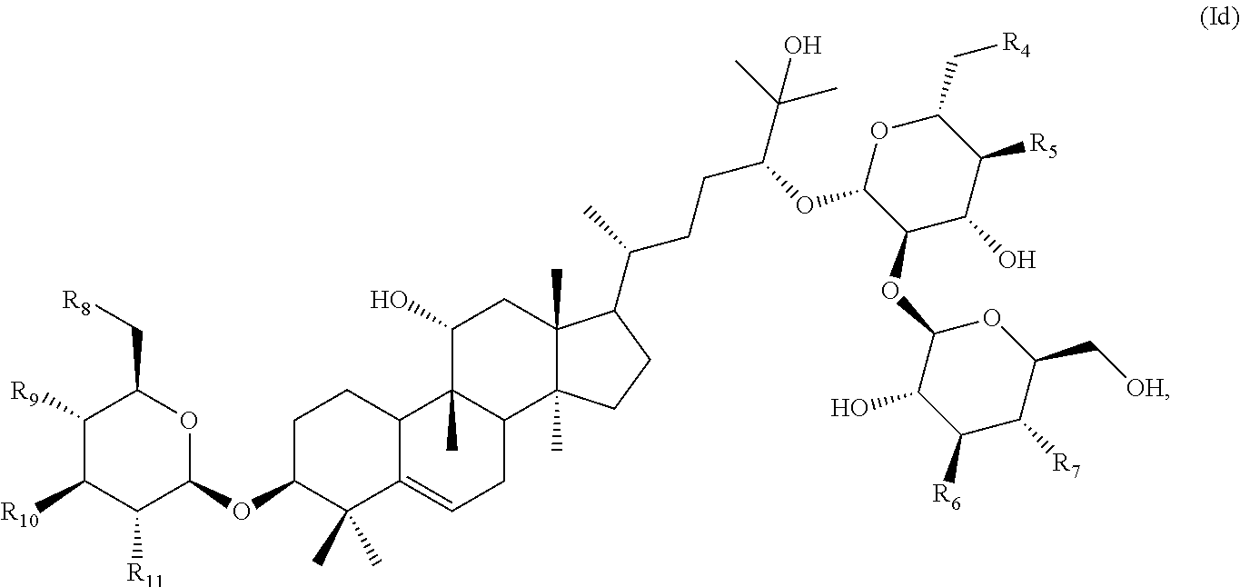 [0022]In some embodiments, the composition comprises less than 0.3% by weight of 11-oxo-Mogroside IIIE. In some embodiments, the composition comprises less than 0.3% by weight of 11-oxo-Mogroside IIIE. In some embodiments, the composition comprises less than 0.1% by weight of 11-oxo-Mogroside IIIE. In some embodiments, the composition comprises less than 0.05% by weight of 11-oxo-Mogroside IIIE. In some embodiments, the composition comprises less than 0.01% by weight of 11-oxo-Mogroside IIIE.