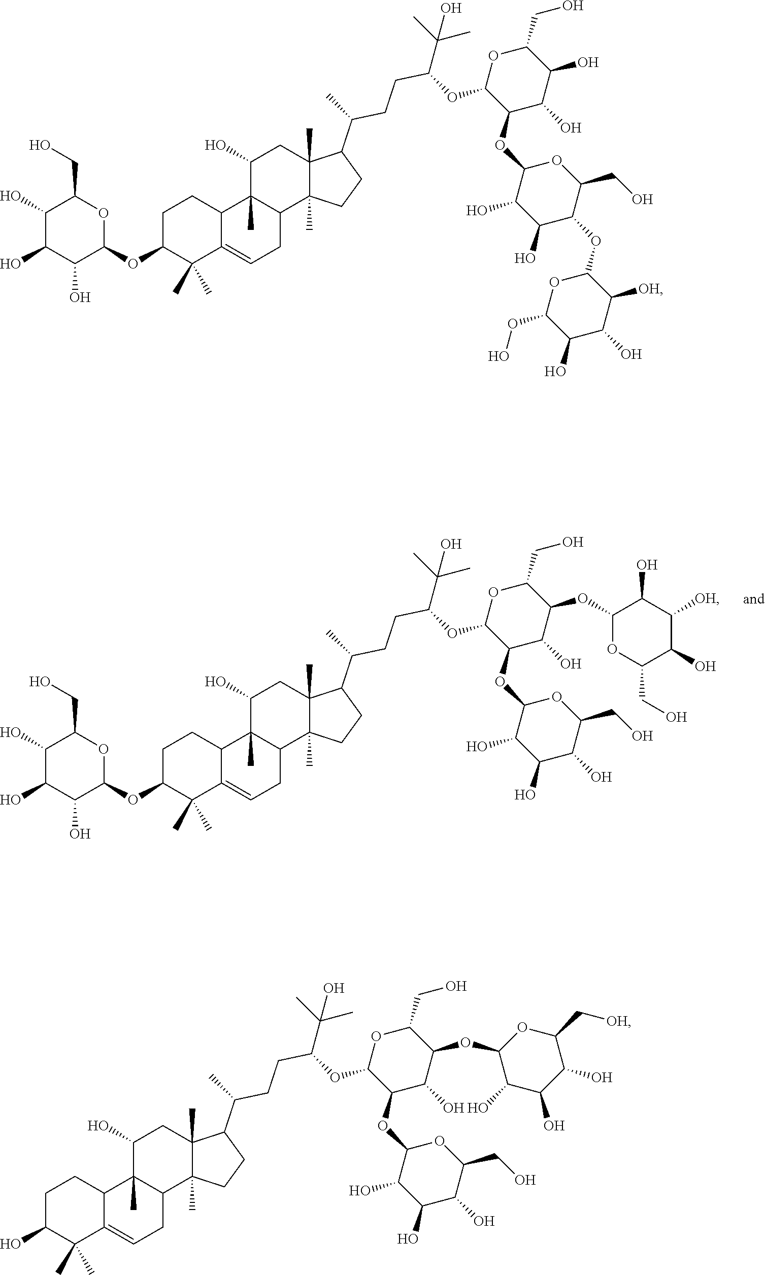 [0037]In some embodiments, the composition comprises a combined concentration of all isomers of Mogroside I, Mogroside II, and Mogroside III of less than 1% by weight. In some embodiments, the composition comprises a combined concentration of all isomers of Mogroside I, Mogroside II, and Mogroside III of less than 0.5% by weight. In some embodiments, the composition comprises a combined concentration of all isomers of Mogroside I, Mogroside II, and Mogroside III of less than 0.1% by weight.