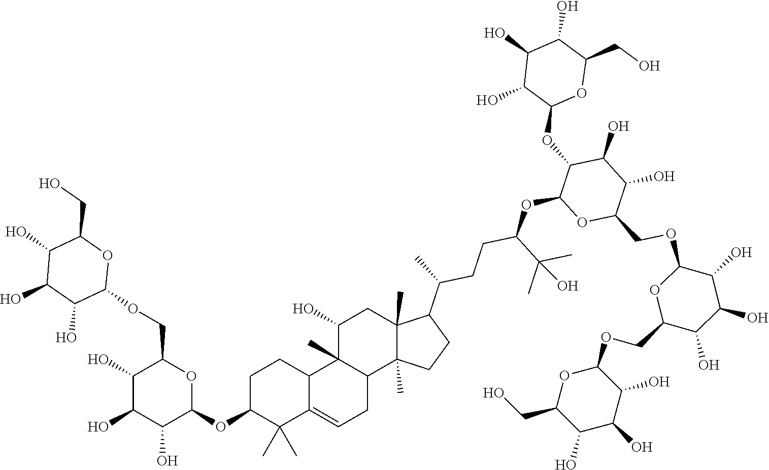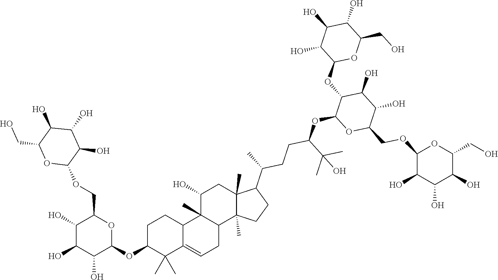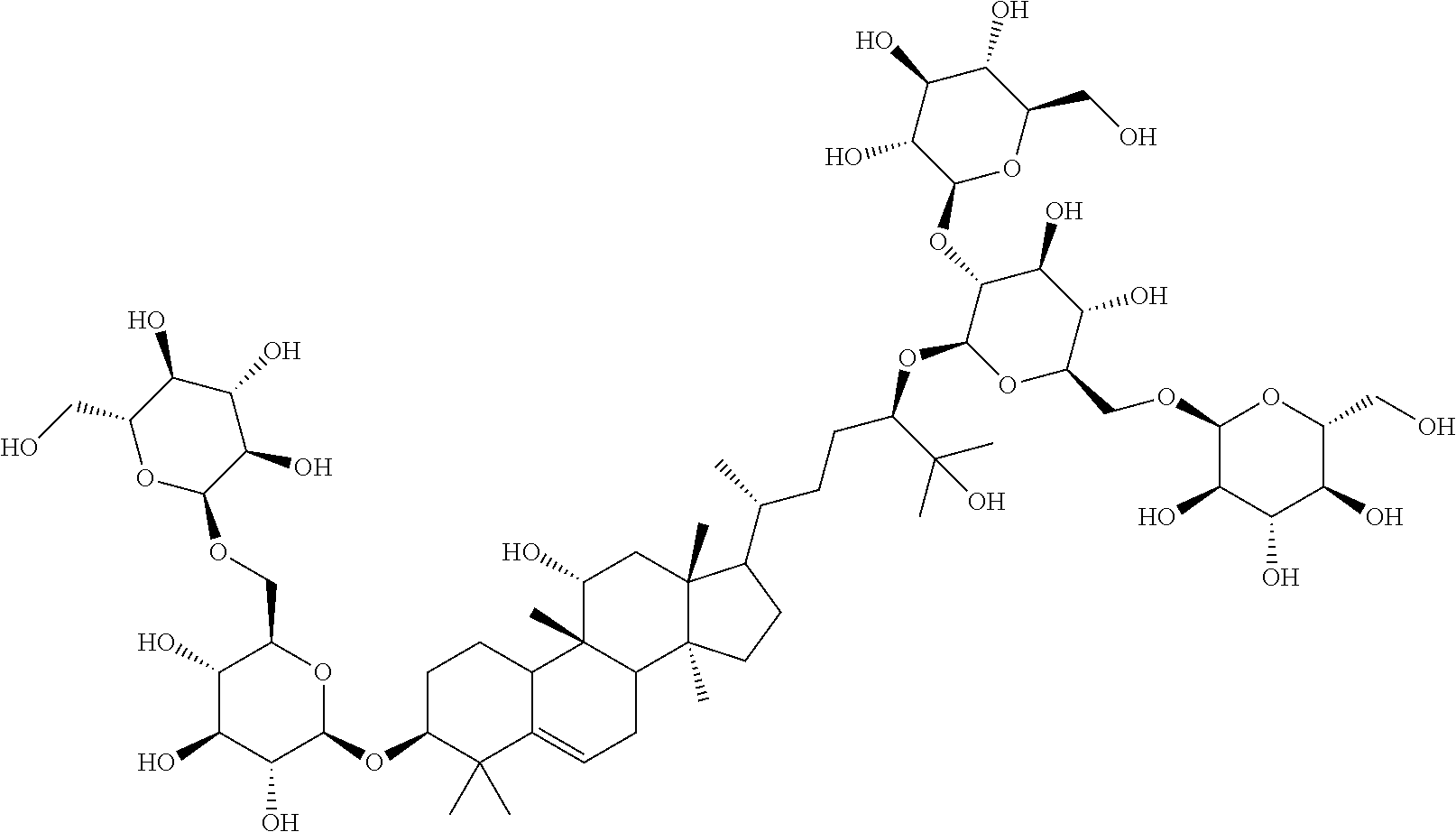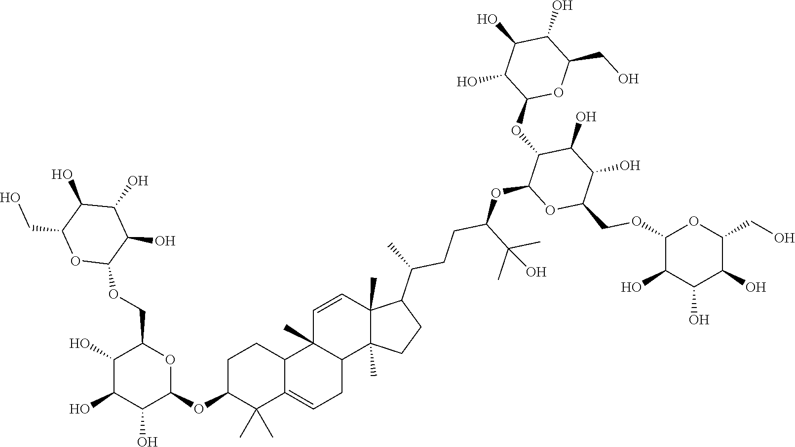 [0615]Mogrol:1H NMR (400 MHz, Pyridine-d5+D2O), selected signals: δ 5.64 (d, J=5.9 Hz, 1H), 4.19 (dd, J=10.7, 5.9 Hz, 1H), 3.81-3.76 (m, 1H), 3.74 (d, J=2.8 Hz, 1H), 1.55 (s, 3H), 1.52 (s, 3H), 1.42 (s, 3H), 1.36 (s, 3H), 1.18 (s, 3H), 1.00 (d, J=6.2 Hz, 3H), 0.91 (brs, 3H), 0.88 (s, 3H); ESI-MS 477.47 (MH)+; Molecular formula, C30H52O4.