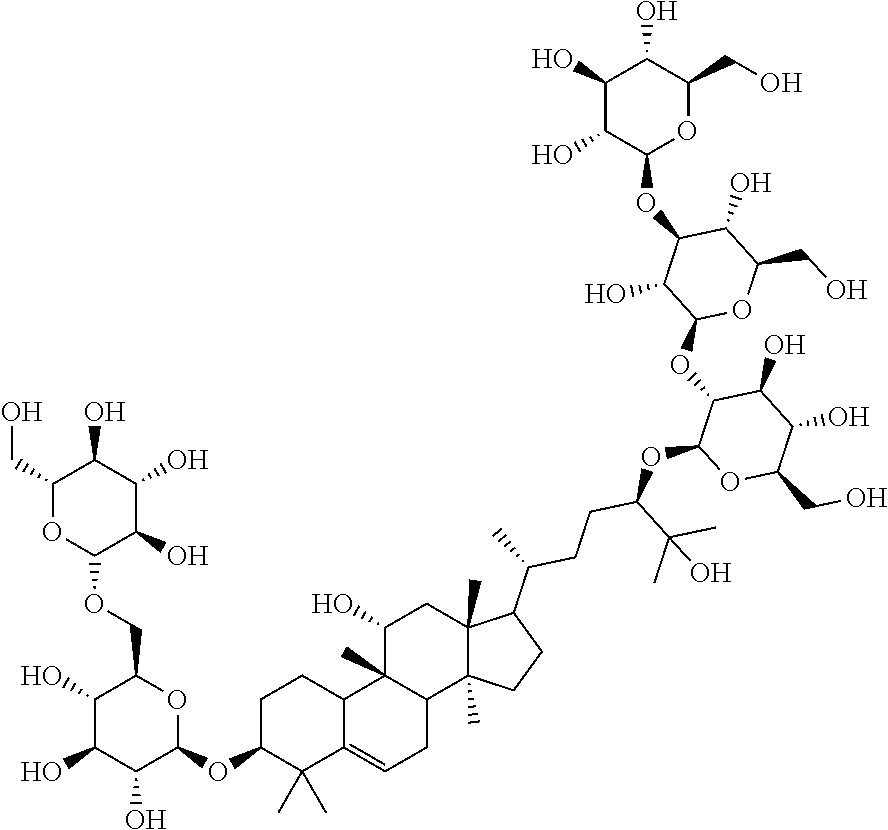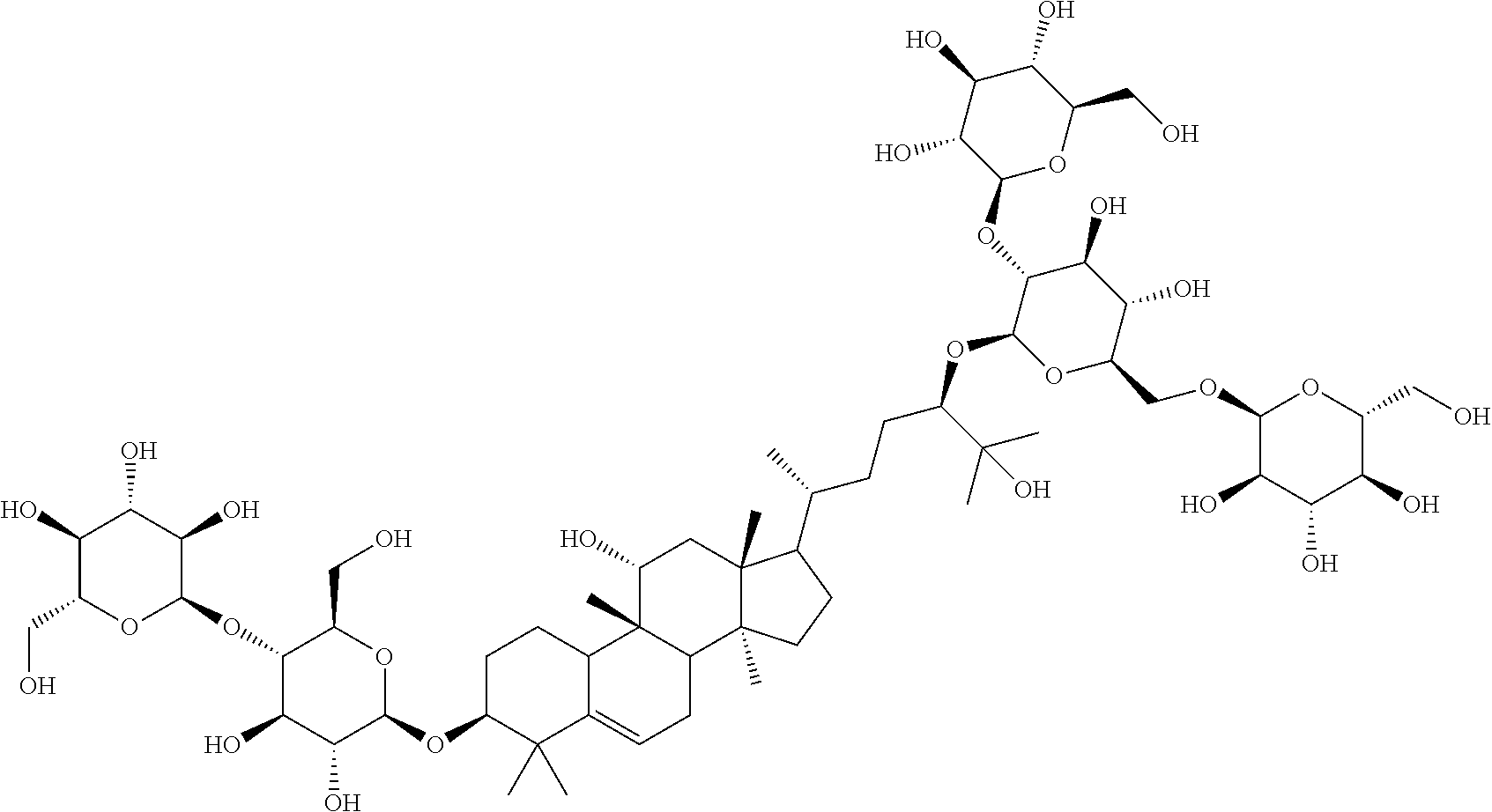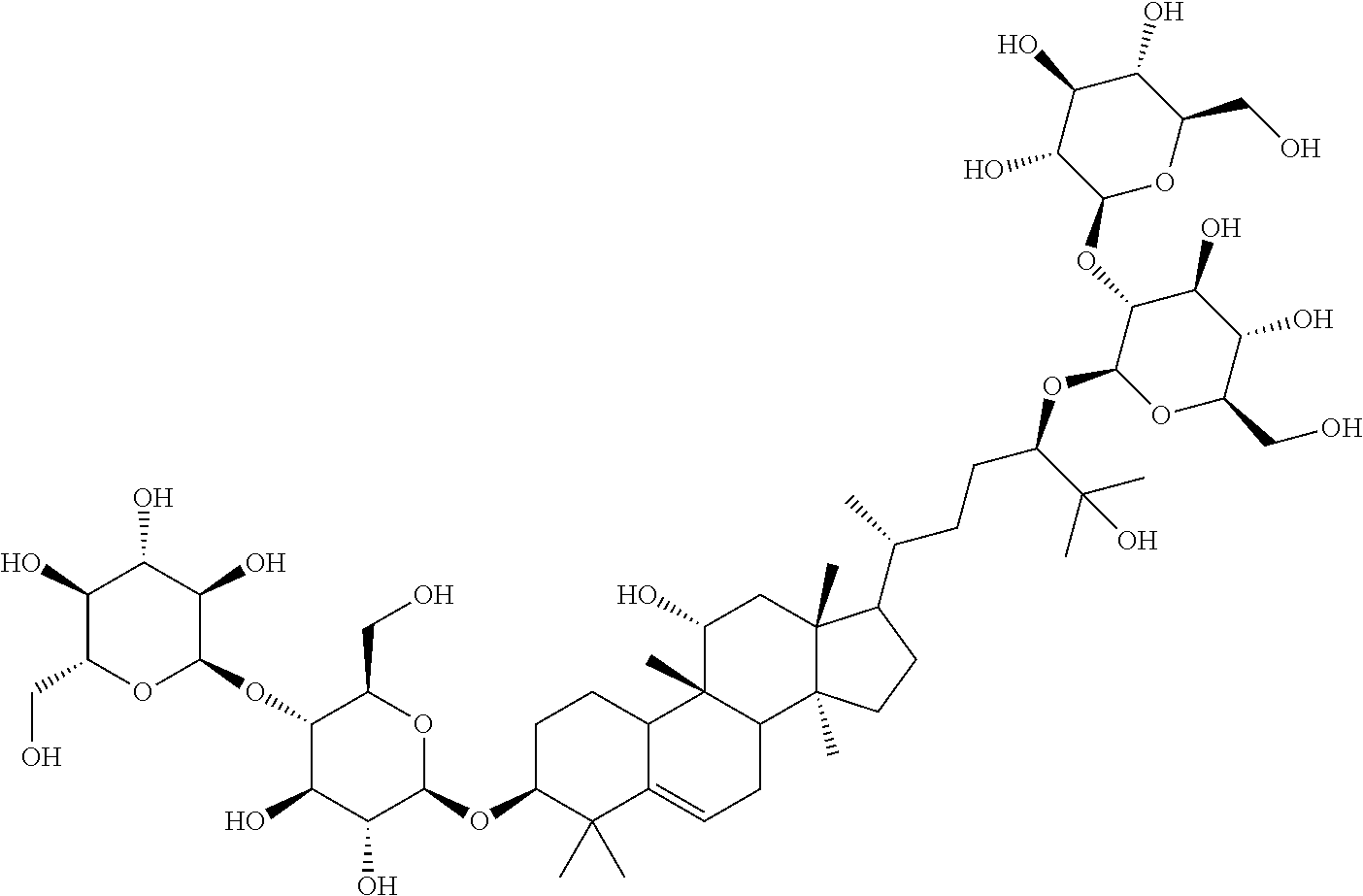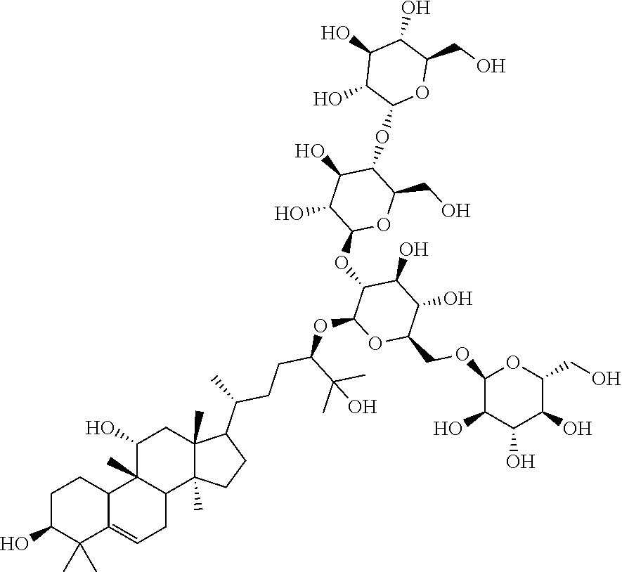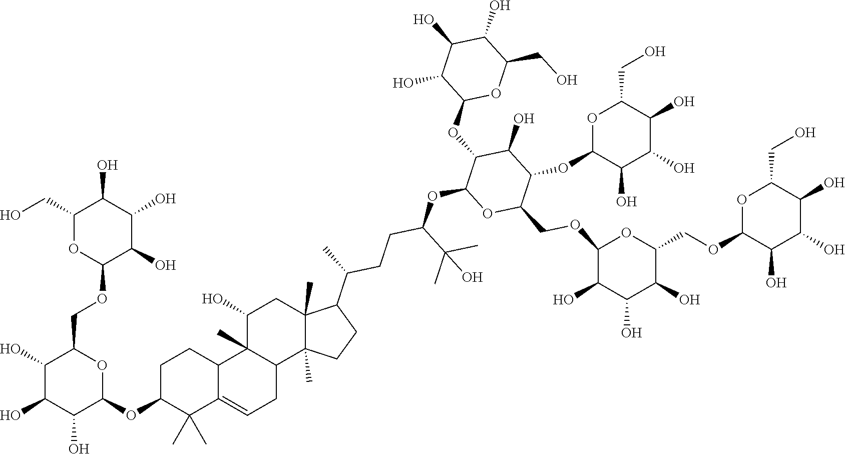 [0615]Mogrol:1H NMR (400 MHz, Pyridine-d5+D2O), selected signals: δ 5.64 (d, J=5.9 Hz, 1H), 4.19 (dd, J=10.7, 5.9 Hz, 1H), 3.81-3.76 (m, 1H), 3.74 (d, J=2.8 Hz, 1H), 1.55 (s, 3H), 1.52 (s, 3H), 1.42 (s, 3H), 1.36 (s, 3H), 1.18 (s, 3H), 1.00 (d, J=6.2 Hz, 3H), 0.91 (brs, 3H), 0.88 (s, 3H); ESI-MS 477.47 (MH)+; Molecular formula, C30H52O4.