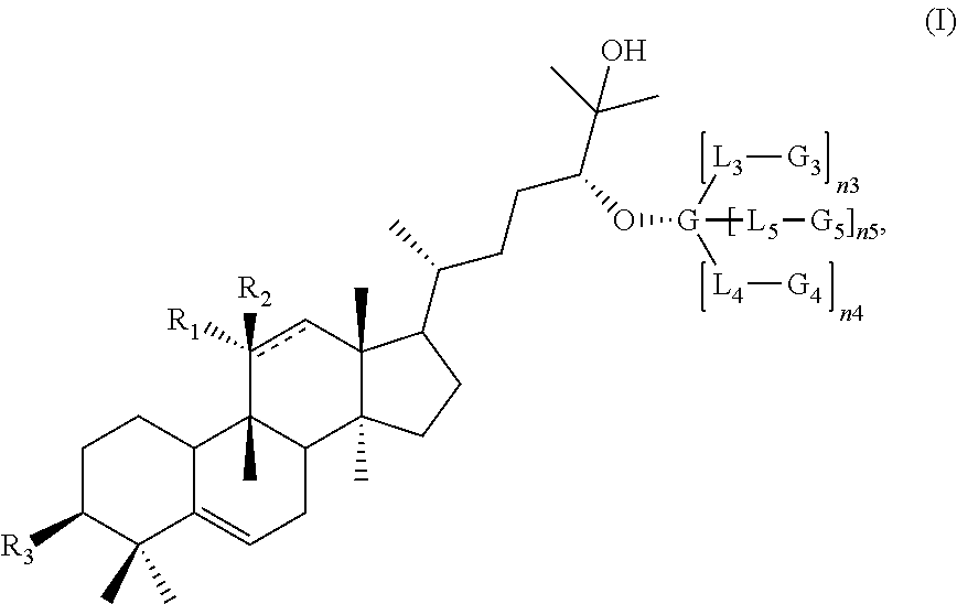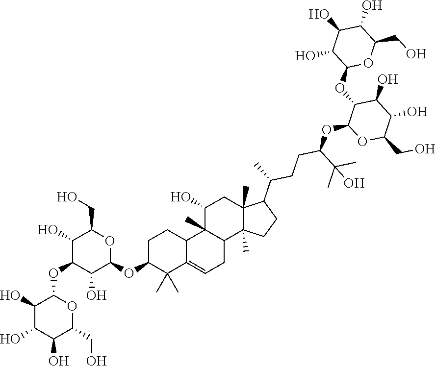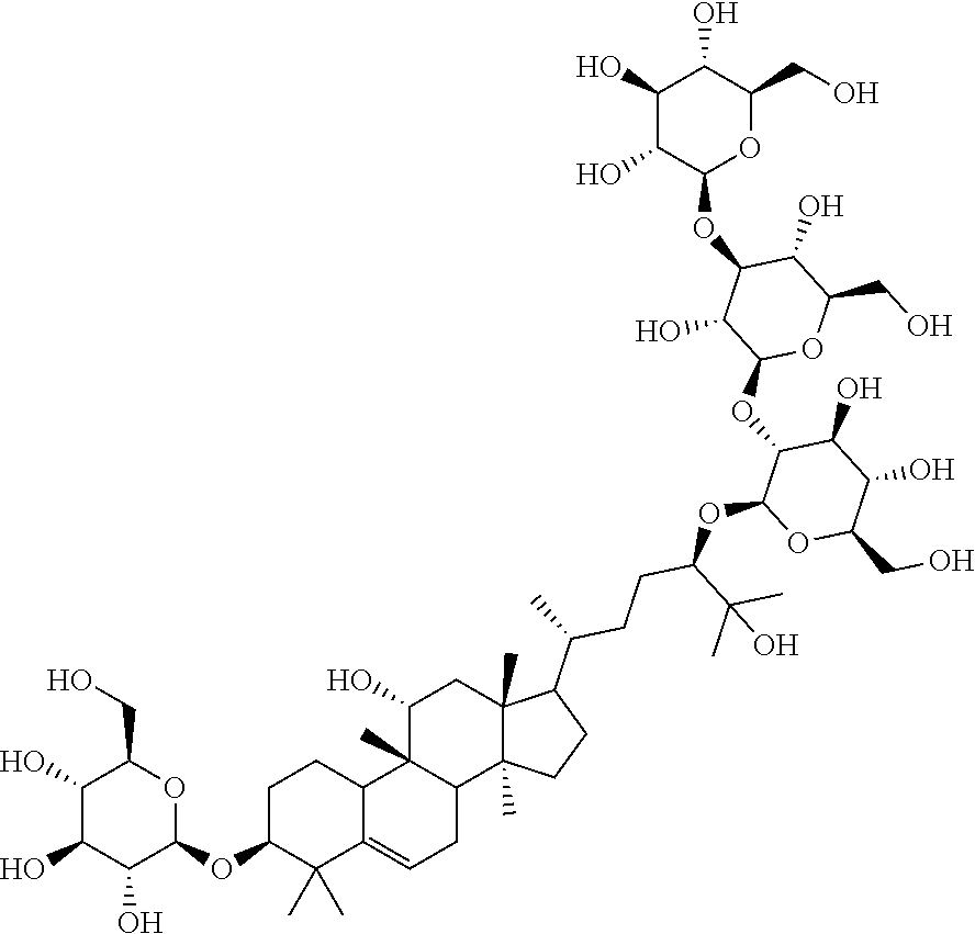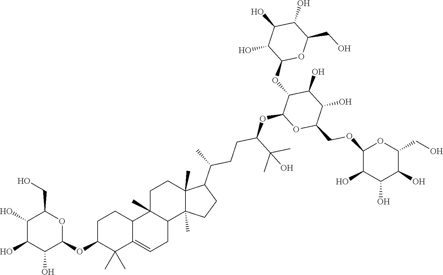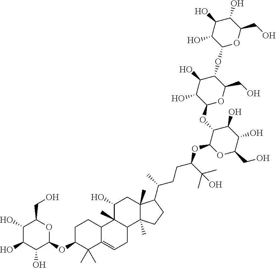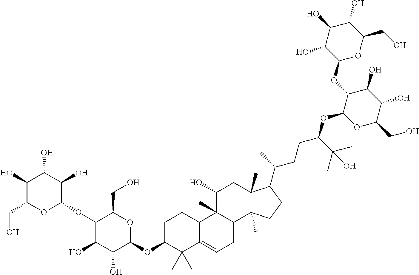 [0615]Mogrol:1H NMR (400 MHz, Pyridine-d5+D2O), selected signals: δ 5.64 (d, J=5.9 Hz, 1H), 4.19 (dd, J=10.7, 5.9 Hz, 1H), 3.81-3.76 (m, 1H), 3.74 (d, J=2.8 Hz, 1H), 1.55 (s, 3H), 1.52 (s, 3H), 1.42 (s, 3H), 1.36 (s, 3H), 1.18 (s, 3H), 1.00 (d, J=6.2 Hz, 3H), 0.91 (brs, 3H), 0.88 (s, 3H); ESI-MS 477.47 (MH)+; Molecular formula, C30H52O4.