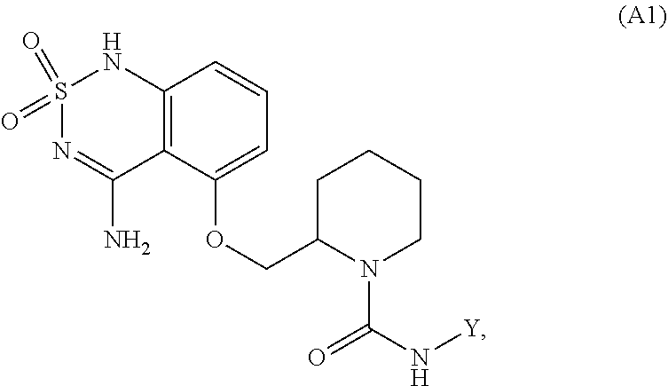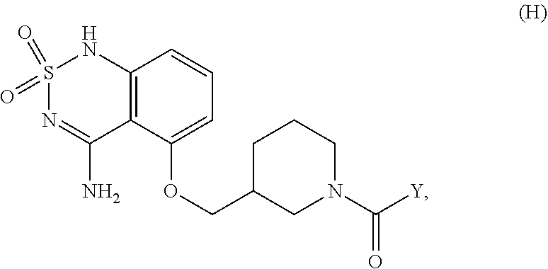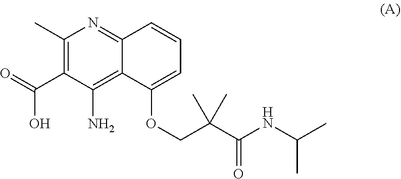 [0634]A concentrated powder formulation is prepared by blending the following ingredients: a compound of Formula (I), trisodium citrate, phosphoric acid, calcium carbonate, one or more flavoring agents, one or more anti-caking agents, one or more preservatives, one or more coloring agents, and optionally, a chelating agent.