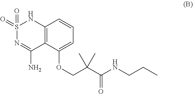 [0633]A concentrated liquid formulation is prepared by blending the following ingredients: a compound of Formula (I), trisodium citrate, phosphoric acid, calcium carbonate, one or more flavoring agents, one or more preservatives, one or more coloring agents, and optionally, a chelating agent. The blend is then dissolved in a solution of water and propylene glycol.