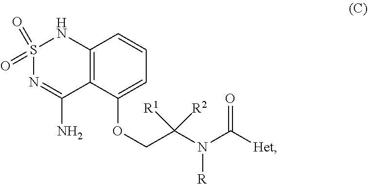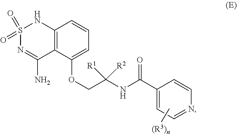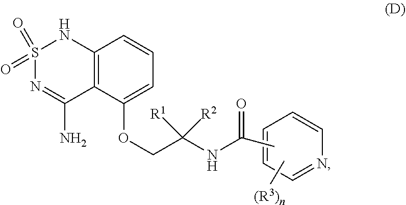[0636]Compound activity (EC50) was determined using an automated fluorometric imaging assay on a FLIPR instrument (Fluorometric Intensity Plate Reader, Molecular Devices, Sunnyvale, Calif.). Cell stably expressing the human sweet taste receptor and a promiscuous G protein were seeded into 384-well plates (at approximately 40,000 cells per well). Cells were grown for 24 hours at 37° C. Cells were then loaded with the calcium dye Fluo-4AM (Molecular Probes, Eugene, Oreg.), 4 μM in a phosphate buffered saline (D-PBS) (Invitrogen, Carlsbad, Calif.), for 1 hour at room temperature. After replacement with 25 D-PBS, stimulation was performed in the FLIPR instrument and at room temperature by the addition of 25 D-PBS supplemented with different stimuli at concentrations corresponding to twice the desired final level. Receptor activity was quantified by determining the maximal fluorescence increases (using a 480 nm excitation and 535 nm emission) after normalization to basal fluorescence intensity measured before stimulation. The activity for selected compounds (EC50) is shown in Table 1, below. A grade of “A” indicates an EC50 of less than 17 μM. A grade of “B” indicates an EC50 of 17 μM to 30 μM. A grade of “C” indicates an EC50 of greater than 30 μM.