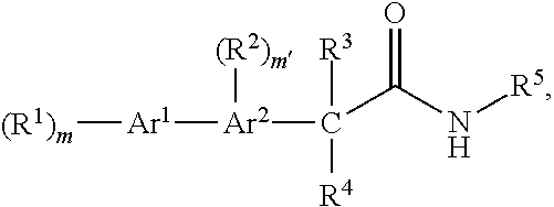 [0007]There has been significant recent progress in identifying useful natural flavoring agents, such as for example sweeteners such as sucrose, fructose, glucose, erythritol, isomalt, lactitol, mannitol, sorbitol, xylitol, certain known natural terpenoids, flavonoids, or protein sweeteners. See, e.g, Kinghom, et al., “Noncariogenic Intense Natural Sweeteners,” Med. Res. Rev. 18 (5) 347-360 (1998) (discussing discovered natural materials that are much more intensely sweet than common natural sweeteners such as sucrose, fructose, and the like.) Similarly, there has been recent progress in identifying and commercializing new artificial sweeteners, such as aspartame, saccharin, acesulfame-K, cyclamate, sucralose, and the like. See, e.g., Ager, et al., Angew. Chem. Int. Ed. 37, 1802-1817 (1998). The entire disclosure of the references identified above are hereby incorporated herein by reference in their entirety.