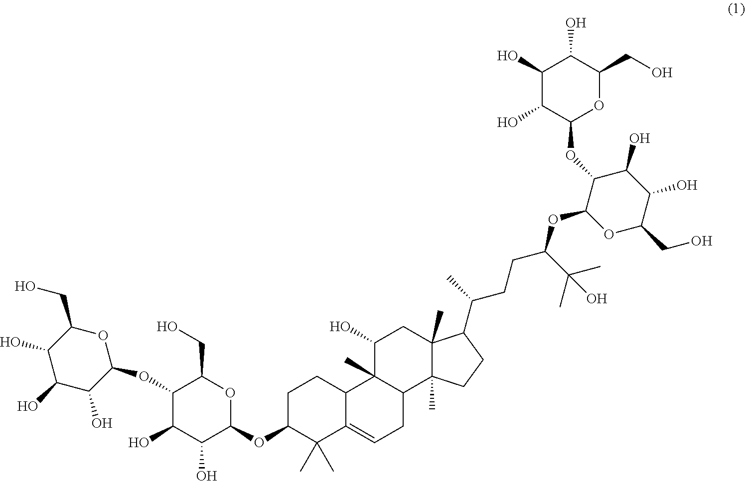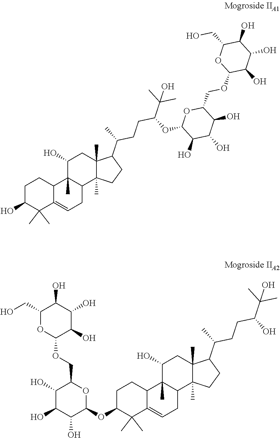 [0021]In some embodiments, the composition comprises less than 1% by weight of Mogroside IIIE. In some embodiments, the composition comprises less than 0.5% by weight of Mogroside IIIE. In some embodiments, the composition comprises less than 0.1% by weight of Mogroside IIIE.