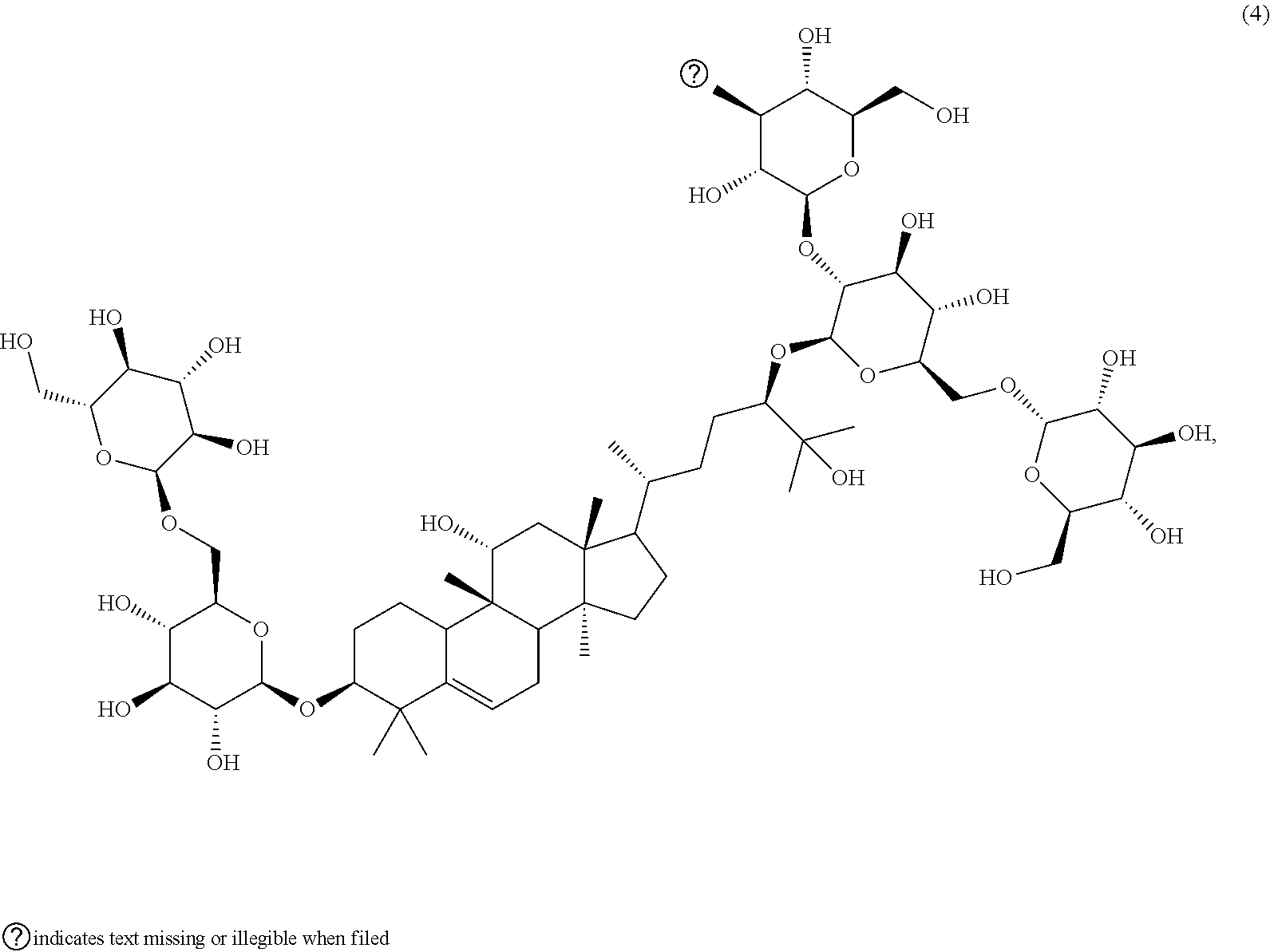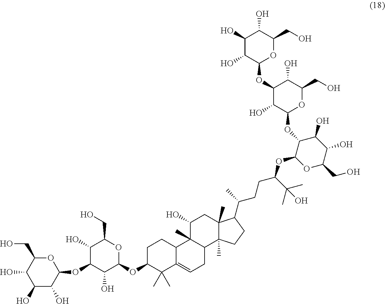 [0631]Mogroside III:1H NMR (400 MHz, Pyridine-d5+D2O), selected signals: δ 5.45 (m, 1H, 6-H, merged with HDO), 5.11 (d, J=7.8 Hz, 1H, G3-1H), 4.95 (d, J=7.8 Hz, 1H, G1-1H), 4.78 (d, J=7.8 Hz, 1H, G2-1H), 3.85 (1H, m, 24-H), 3.68 (d, J=2.8 Hz, 1H, 3-H), 1.47 (s, 3H, 28-Me), 1.41 (s, 3H, 26-Me), 1.37 (s, 3H, 27-Me), 1.29 (s, 3H, 19-Me), 1.08 (s, 3H, 29-Me), 0.93 (d, J=6.3 Hz, 3H, 21-Me), 0.84 (s, 2H, 30-Me), 0.77 (s, 3H, 18-Me); ESI-MS, 963.84 (MH)+, 961.92 (M−H)−; Molecular formula, C48H82O19.