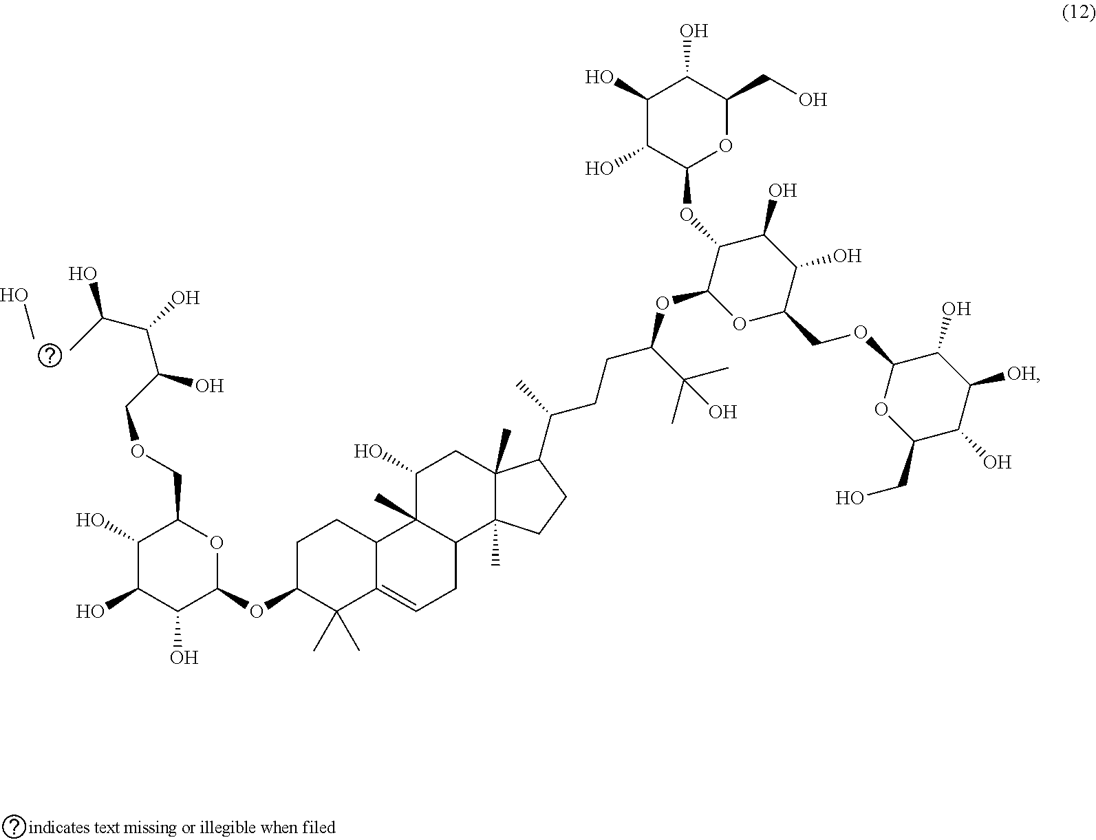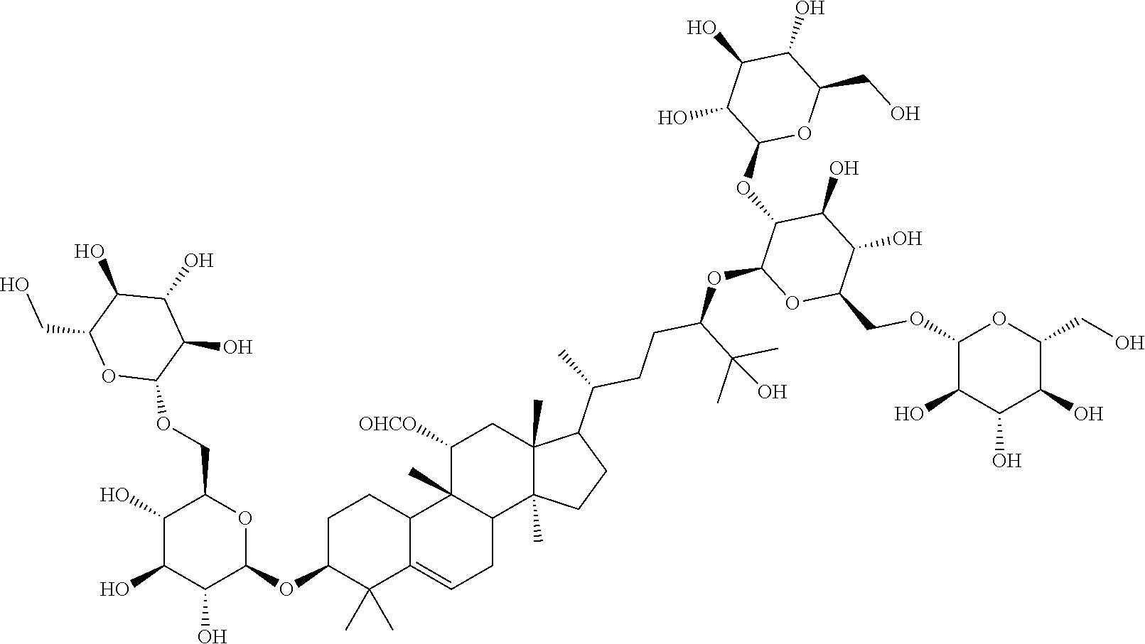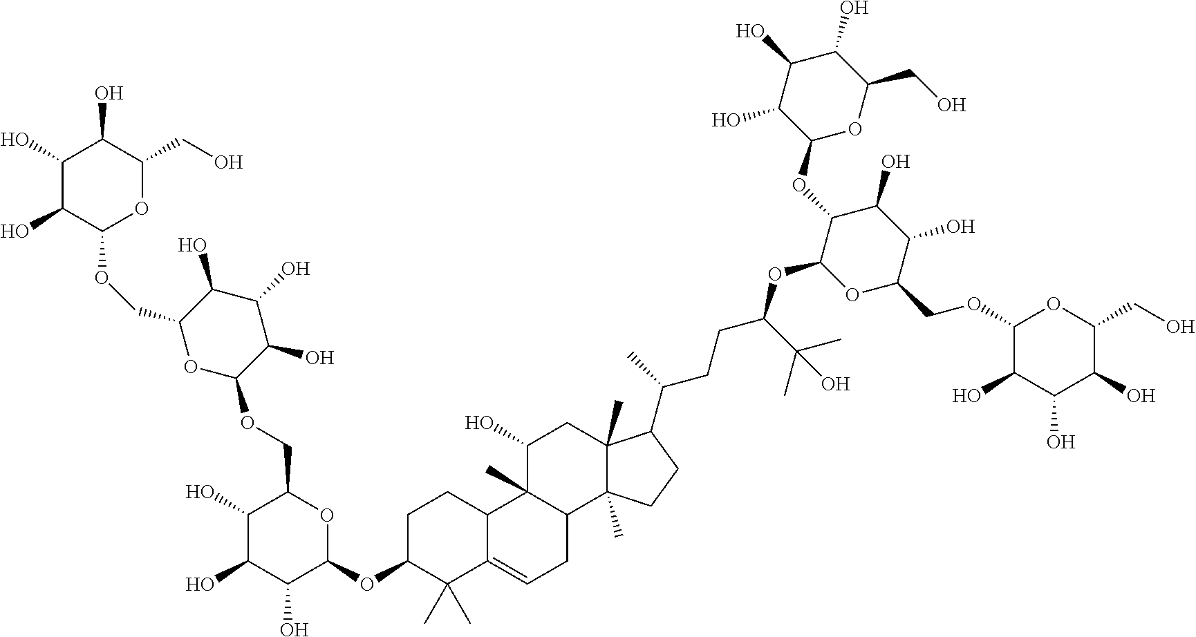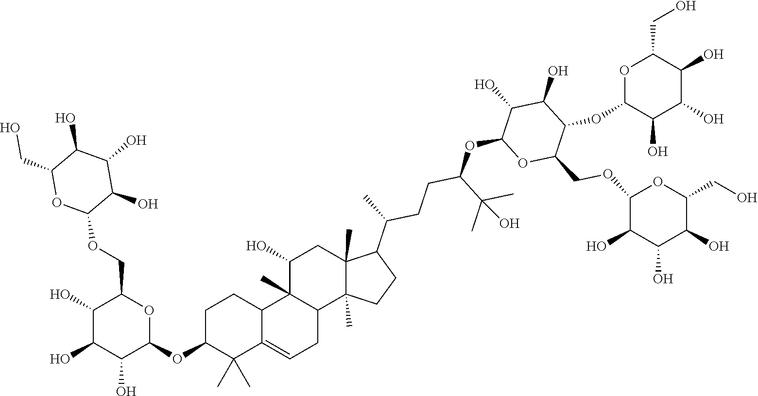 [0612]1H NMR (400 MHz, Pyridine-d5+D2O), selected signals: δ 5.97 (d, J=10.1 Hz, 1H), 5.4 (m, 3H, merged with HDO peak), 5.14 (d, J=7.8 Hz, 1H), 4.79 (d, J=7.5 Hz, 1H), 3.73 (m, 1H), 3.63 (m, 1H), 1.44 (s, 3H), 1.44 (s, 3H), 1.31 (s, 3H), 1.12 (d, J=6.3 Hz, 3H), 0.96 (s, 3H), 0.94 (s, 3H), 0.84 (s, 3H), 0.83 (s, 3H);13C NMR (101 MHz, Pyridine-d5+D2O) 6141.71, 134.9 (merged with pyridine-d5 peak), 132.86, 118.11, 106.70, 104.93, 104.73, 104.53, 103.65, 92.39, 87.02, 81.24, 78.39, 78.27, 78.20, 78.16, 78.04, 77.94, 77.56, 77.16, 76.25, 75.60, 75.05, 74.88, 72.75, 72.06, 71.42, 71.32, 71.20, 71.03, 69.93, 63.13, 62.48, 62.26, 49.77, 49.24, 47.16, 41.75, 41.55, 40.46, 37.60, 36.94, 33.00, 32.80, 29.03, 28.63, 28.14, 26.82, 25.79, 25.23, 24.45, 23.81, 21.55, 19.18, 18.87; ESI-MS 1269.76 (MH)+, 1267.69 (M−H)−; Molecular formula, C65H100O28.