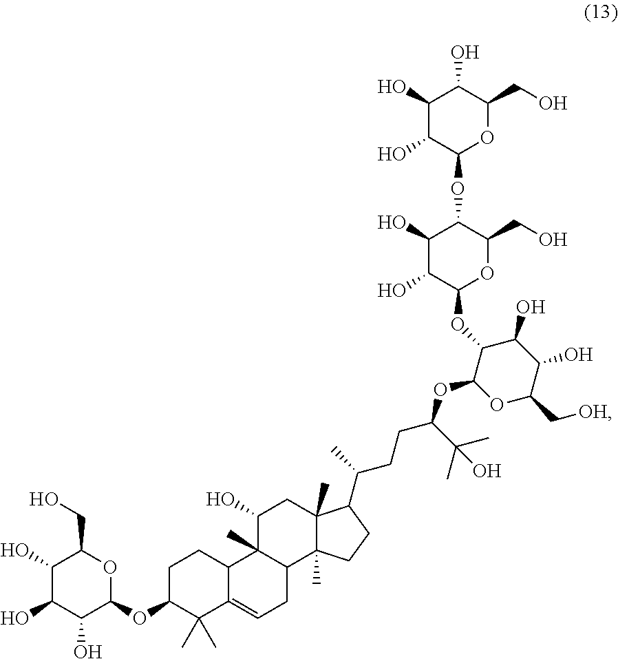 [0024]In some embodiments, the composition comprises less than 1% by weight of 11-oxo-mogrol. In some embodiments, the composition comprises less than 0.5% by weight of 11-oxo-mogrol. In some embodiments, the composition comprises In some embodiments, the composition comprises less than 0.1% by weight of 11-oxo-mogrol.