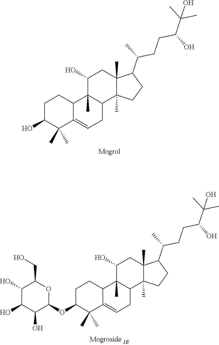[0041]In some embodiments, the composition comprises one or more additional compounds selected from the group consisting of Mogroside V, Siamenoside I, Mogroside IVE, Iso-mogroside V, Mogroside IIIE, 11-Deoxy-mogroside V, 11-Oxo-mogroside V, Mogroside VI, Mogroside IVA, Mogroside IIA, Mogroside IIA1, Mogroside IIA2, Mogroside IA, 11-oxo-Mogroside VI, 11-oxo-Mogroside IIIE, 11-oxo-Mogroside IVE, Mogroside IE, Mogrol, 11-oxo-mogrol, Mogroside IIE, Mogroside IIIA2, and Mogroside III.