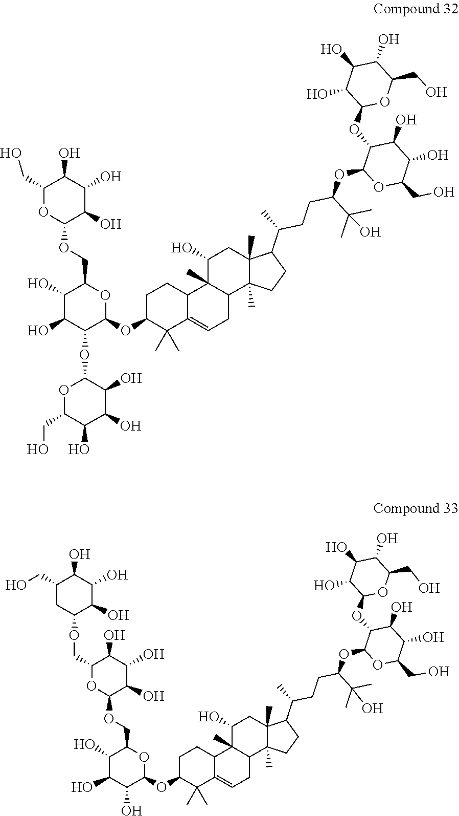 [0622]Compound 32:1H NMR (400 MHz, Pyridine-d5+D2O), selected signals: δ 5.44 (m, 1H, merged with HDO peak), 5.35 (d, J=7.8 Hz, 1H), 5.21 (d, J=7.7 Hz, 2H), 5.00 (d, J=7.7 Hz, 1H), 4.91 (d, J=7.9 Hz, 1H), 1.51 (s, 3H), 1.46 (s, 3H), 1.41 (s, 3H), 1.26 (s, 3H), 1.10 (s, 3H), 1.03 (d, J=6.3 Hz, 3H), 0.81 (s, 6H);13C NMR (101 MHz, Pyridine-d5+D2O) δ 144.43, 118.36, 106.37, 106.32, 105.70, 102.95, 102.20, 88.69, 86.70, 84.47, 83.06, 78.69, 78.44, 78.37, 78.30, 78.22, 78.16, 77.99, 77.85, 76.75, 76.35, 75.89, 75.36, 72.45, 71.93, 71.62, 71.20, 71.13, 70.96, 70.19, 63.08, 62.32, 62.25, 50.74, 49.66, 47.38, 43.48, 42.38, 40.76, 40.09, 36.72, 36.64, 34.50, 33.81, 29.62, 28.57, 27.66, 26.97, 26.92, 26.26, 26.16, 25.53, 24.54, 19.36, 19.10, 17.01; ESI-MS 1287.89 (MH)+, 1285.91 (M−H)−; Molecular formula, C60H102O29.