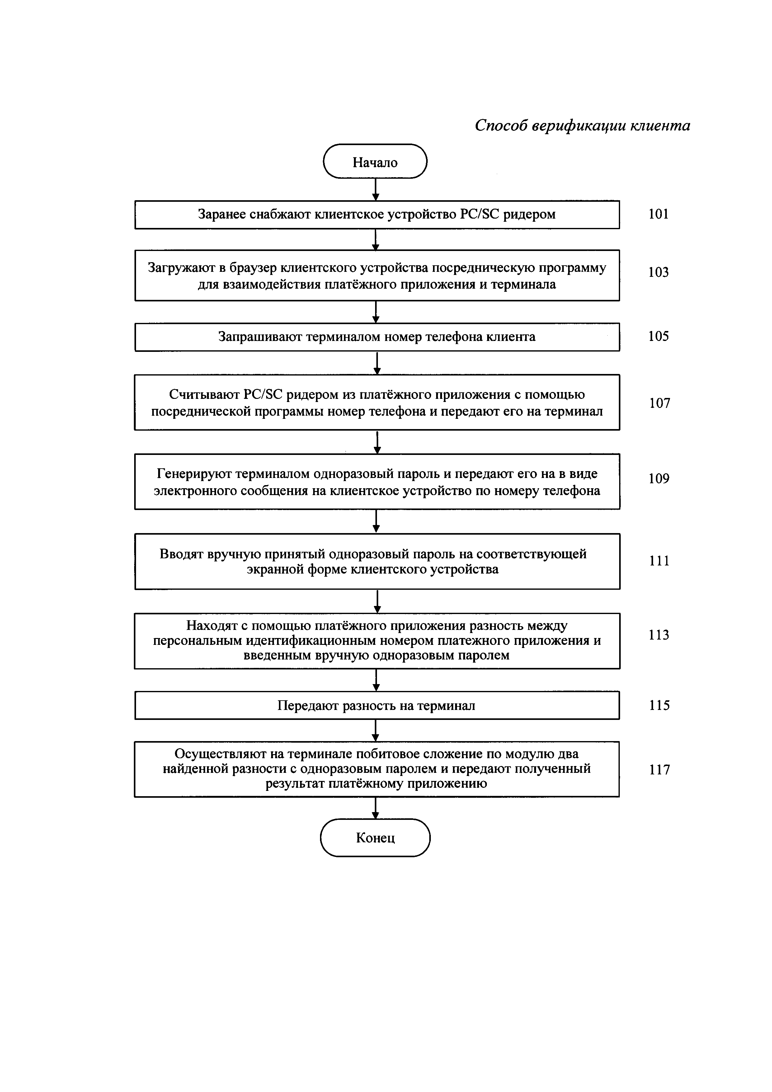 Область техники, к которой относится изобретение Данное изобретение относится в общем к методам осуществления транзакций, а в частности - к способу верификации клиента, являющегося держателем микропроцессорной карты с платежным приложением, при Интернет-транзакции. Уровень техники Осуществление верификации клиента (держателя карты) при осуществлении Интернет-транзакций может выполняться разными способами. В патенте РФ №2530323 (опубл. 10.10.2014) описан способ безопасного использования банковских карт, в котором данные с карты вводятся на веб-странице поставщика товаров (услуг), инициирующего сеанс связи с телефоном пользователя, номер которого привязан к номеру карты. В патенте США №7690027 (опубл. 30.03.2010) описан способ, в котором в SIM-картах заранее отпечатаны скрытые оболочки с кодами активации и ссылочные видимые коды. Все эти коды хранятся в сервере безопасности. Пользователю сообщают один ссылочный код в обмен на заполнение формы с персональными данными. При активации этот код вместе со своим кодом активации сохраняются вместе с идентификатором карты. В патенте США №7693797 (опубл. 06.04.2010) описан способ, в котором провайдер использует общие секреты и начальные числа в коде хешированных машинных адресов с секретными ключами для генерирования списка маркеров аутентификации, содержащих имя пользователя и пароль, для продаж. Общие секреты и начальные числа распределяются также в местных устройствах для генерирования такого же списка. Пользователь получает от местного устройства маркер аутентификации и предъявляет его удаленному провайдеру. Недостатком всех этих и иных аналогов является использование статического пароля (кода), что снижает надежность верификации клиента, поскольку статические пароли нужно хранить достаточно продолжительное время, в течение которого они могут стать доступны злоумышленнику. Раскрытие изобретения Задачей, на решение которой направлено настоящее изобретение, является повышение надежности верификации держателя микропроцессорной карты с платежным приложением (клиента). Для решения этой задачи и достижения указанного технического результата в настоящем изобретении предложен способ верификации клиента, являющегося держателем микропроцессорной карты с платежным приложением при совершении Интернет-транзакции, проводимой через терминал с использованием клиентского устройства, которое может осуществлять обмен данными с терминалом через телефонные сети, заключающийся в том, что: заранее снабжают клиентское устройство PC/SC ридером; в процессе осуществления транзакции загружают в браузер клиентского устройства посредническую программу для взаимодействия между терминалом и платежным приложением; запрашивают терминалом номер телефона клиента; считывают PC/SC ридером из платежного приложения с помощью посреднической программы номер телефона и передают его терминалу; генерируют терминалом одноразовый пароль и передают его в виде электронного сообщения на номер телефона клиента; вводят вручную принятый одноразовый пароль на соответствующей экранной форме клиентского устройства; находят с помощью платежного приложения разность между персональным идентификационным номером (ПИН), зафиксированным в отношении платежного приложения, и введенным вручную одноразовым паролем, сгенериров