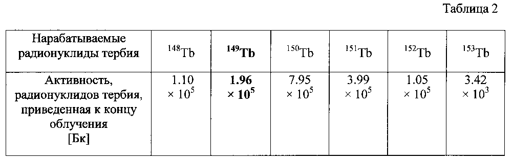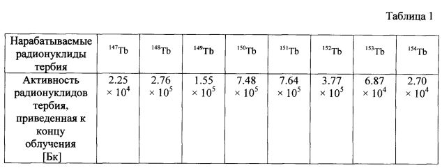 , M.Miederer Production routes of the alpha emitting 149Tb for medical application - Radiochimica Acta 90 (5) 247, 2002). В этом способе предлагается нарабатывать149Tb облучением изотопа152Gd протонами с энергией ≥50 МэВ. В работе по программе ALICE 91 проведены расчеты функций возбуждения с выходом149Tb для нескольких ядерных реакций. Показано, что реакция152Gd(p,4n)149Tb наиболее удобна как с точки зрения возможности реализации (относительно невысокая энергия протонов), так и с точки зрения величины выхода149Tb. Отмечается также, что получение149Tb без носителя (выделение149Tb из Gd мишени) можно реализовать за приемлемое (с точки зрения последующего использования149Tb) время. Основным недостатком прототипа следует считать необходимость использования в качестве мишени изотопа152Gd, содержание которого в природной смеси составляет всего 0.2%. Обогащенный по изотопу152Gd гадолиний получают энергоемким методом электромагнитного разделения изотопов. Вследствие этого цена на152Gd весьма высока. Использование природного Gd сопряжено с существенным снижением выхода149Tb и появлением широкого спектра нежелательных долгоживущих радиоактивных примесей.