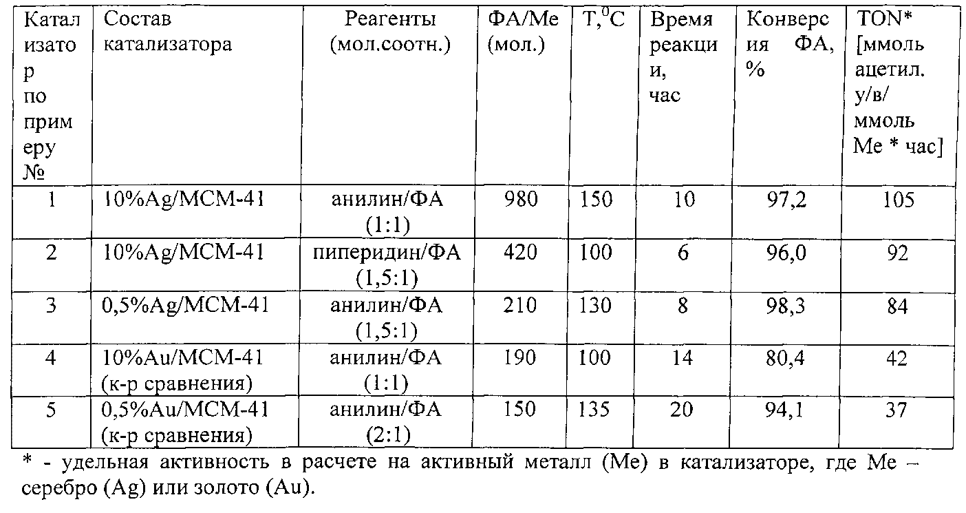 Группа изобретений относится к области каталитических технологий переработки углеводородного сырья и касается, в частности, катализатора и способа гидроаминирования жидких ацетиленовых углеводородов ароматическими аминами в ценные продукты - имины, которые при дальнейшем гидролизе приводят к образованию соответствующих кетонов. Ацетиленовые углеводороды (у/в) являются побочным продуктом производства олефиновых мономеров, получаемых, в основном, пиролизом широкой фракции легких углеводородов в трубчатых печах. Производители полимеров (например, полистирола) предъявляют высокие требования к степени очистки олефинов от ацетиленовых углеводородов. Последние, таким образом, не находят адекватного применения. Стирол получают каталитическим дегидрированием этилбензола, при этом вместе с целевым олефиновым мономером неизбежно образуется фенилацетилен и его содержание в сыром стироле составляет порядка 2-3%. В ходе полимеризации стирола даже такое "примесное" содержание фенилацетилена быстро отравляет катализаторы и резко снижает качество образующихся полимеров. Традиционно, примеси ацетиленовых, и в частности фенилацетилена, удаляют в ходе их селективного гидрирования [N.A. Khan, S. Shaikhutdinov, H.-J. Freund // Acetylene and ethylene hydrogenation over supported Pd-Ag model catalysts // Catalysis Letters, 2006, v.108, №.3-4, p.159-164; B.A. Wilhite, M.J. McCready, A. Varma // Kinetics of phenylacetylene hydrogenation over Pt/Al203 catalyst // Ind. Eng. Chem. Res., 2002, v.41, p.3345-3350], однако этот способ с использованием катализаторов с благородными металлами достаточно дорогой и энергозатратный. Каталитическое гидроаминирование является более эффективным методом, приводящим к получению ценных продуктов - иминов и кетонов. В настоящее время в качестве катализаторов для гидроаминирования широко используются лантанидные и актинидные комплексы [Burgstein M.R., Berbeich Н., Roesky P.W. // Animation of Aromatic Olefins with Anilines: A New Domino Synthesis of Quinolines // Organometallics, 1998, 17, 1452]. Существенным недостатком процесса в присутствие органолантанидных комплексов типа Cp′2LnCH(SiMe3)2 и Me2SiCp″LnCH(SiMe3)2 (Ср′=(5-Ме5С5; Ln=La, Nd, Sm, Lu) является высокое содержание катализатора - 20 мол.%, а также отношение алкен:амин=70:1. К недостаткам самих каталитических систем на основе органолантанидов относятся их чувствительность к воздуху, нестабильность, а также высокая стоимость. В случае соединений переходных металлов [Muller Т.Е., Beller М. // Metal-Initiated Animations of Alkenes and Alkynes // Chem. Rev. 1998, 98, 675-703] наиболее часто применяются комплексы титана, циркония, палладия и родия. Так, в работе [Brunet J.J., Neibecker D., Philippot К. // Evaluation of amido rhodium complexes in catalytic oxidative hydroamination of α-olefmes // Tetrahedron Lett., 1993, 34, 3877] рассматривается присоединение анилина к алкенам (RCHCH2) в присутствии каталитической системы, образующейся in situ из комплекса [RhCl(PMe3)2]2 и LiNHPh. В результате получается смесь продуктов гидроаминирования (RCH2CHNHPh, RCH(Me)NHPh) и побочных продуктов окислительного аминирования (RC(Me)=NPh). Например, применение норборнена в качестве субстрата приводит к тому, что каталитическая реакция протекает крайне медленно (12 дней, 70 (C), и в результате образуется только 33% продукта гидроаминирования. Также рассматриваются цеолиты, содержащие бренстедовские и льюисовские кислотные центры [Brunet J.-J., Neibecker D., Niedercorn F. // Recent developments in late metal catalyzed hydroamination // J. Mol Catal., 1989, 49, 235]. Согласно литературным данным, трудности, возникающие при практическом осуществлении гидроаминирования в первую очередь связаны с тем, что пр