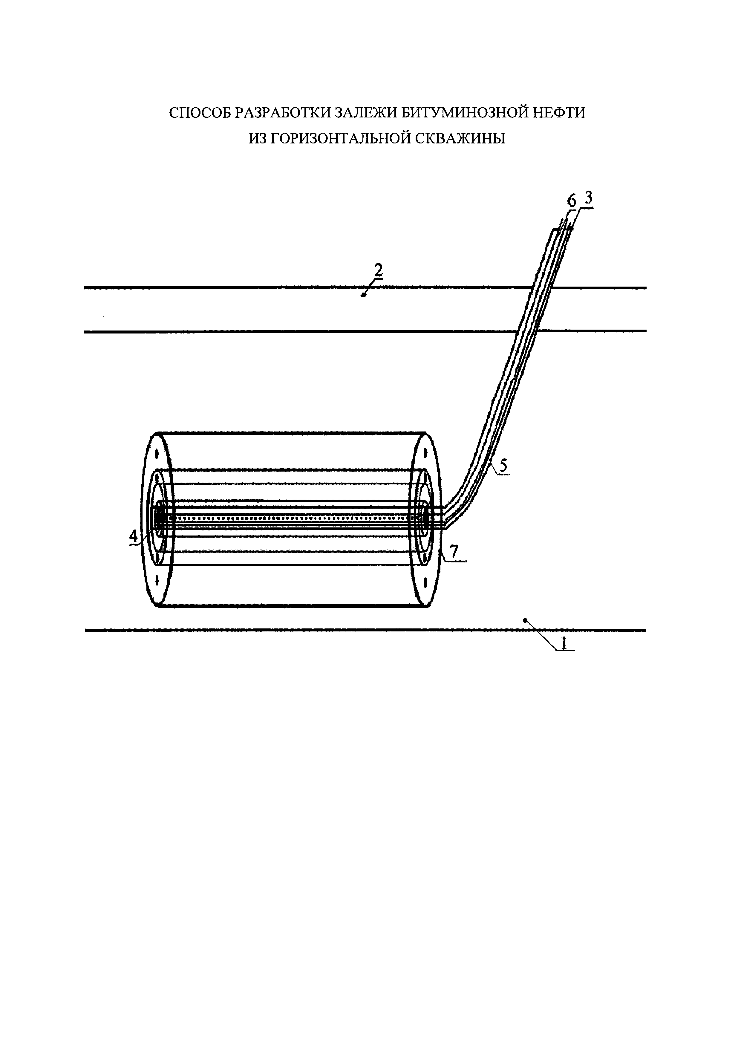 Способ разработки залежи битуминозной нефти из горизонтальной скважины, включающий строительство горизонтальной скважины с вскрытием продуктивного пласта, спуск насосно-компрессорных труб - НКТ, подачу теплоносителя по НКТ и отбор продукции скважины, отличающийся тем, что до начала строительства скважины производят исследования месторождения для выделения участков с наличием газовых шапок, горизонтальную скважину располагают под газовой шапкой, а при строительстве в ней располагают устройство контроля давления и температуры, в качестве рабочего агента применяют водяной пар, который циклически нагнетают при давлении, не превышающем давление в газовой шапке, сочетая с ожиданием термокапиллярной пропитки и последующим отбором продукции по НКТ.