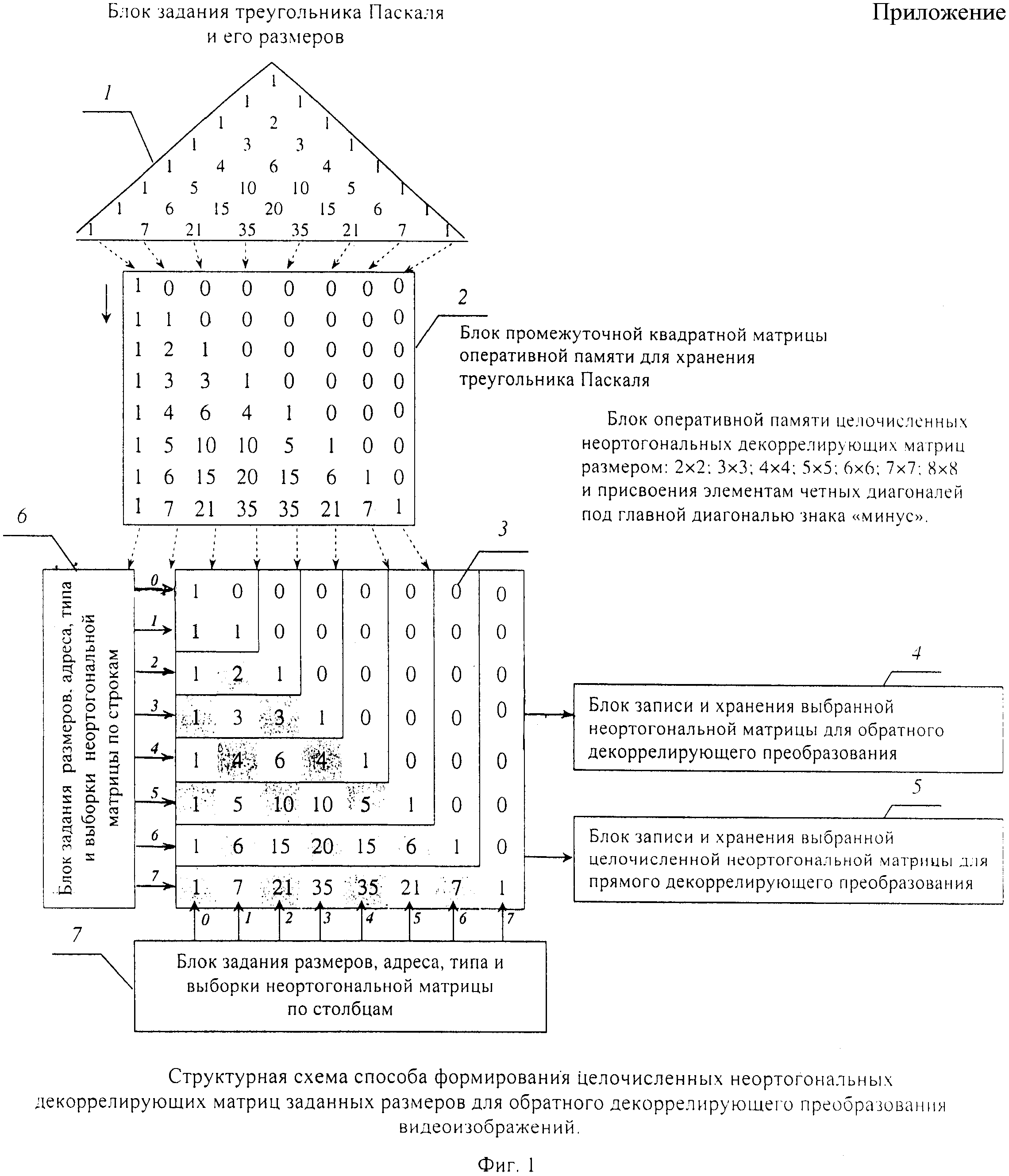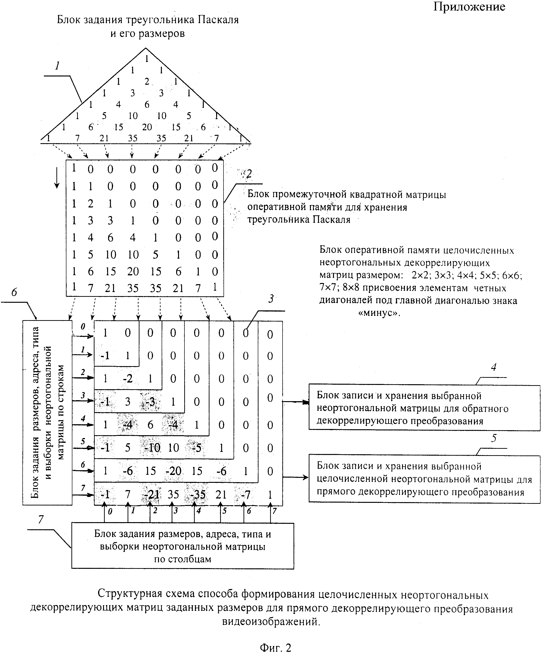 1. Способ формирования целочисленных неортогональных декоррелирующих матриц для матричного преобразования видеоизображений, характеризующийся выбором порождающей матрицы и последующим формированием неортогональной матрицы заданного размера, при этом в качестве порождающей матрицы выбирают равнобедренный треугольник Паскаля с размерами боковых сторон, равными заданным размерам формируемой матрицы, а формирование неортогональной матрицы осуществляют посредством заполнения выбранного треугольника Паскаля по строкам, параллельным основанию треугольника, причем после выбора порождающей матрицы формируют промежуточную квадратную матрицу, своими размерами соответствующую выбранным размерам боковых сторон треугольника Паскаля, и в эту матрицу переносят элементы треугольника Паскаля полосами, параллельными его, например, левой боковой стороне, путем сдвига по столбцам соответственно слева направо, а нулями заполняют элементы этой матрицы, расположенные выше ее главной диагонали, причем для прямого матричного преобразования видеоизображений элементам второй и всех последующих четных диагоналей квадратной матрицы, расположенных выше главной диагонали, присваивают знаки «минус», а для матриц обратного декоррелирующего преобразования этим элементам присваивают знаки «плюс». 2. Устройство для осуществления способа формирования целочисленных неортогональных декоррелирующих матриц для матричного преобразования видеоизображений, включающее блок формирования порождающей матрицы, отличающееся тем, что в него дополнительно введены блок формирования промежуточной матрицы, три блока памяти, два блока задания структуры целочисленной неортогональной декоррелирующей матрицы, а также блок управления и коммутатор, при этом выход блока формирования порождающей матрицы соединен с первым входом блока формирования промежуточной матрицы, выходом подключенного к первому входу первого блока памяти, своими вторым и третьим входами соединенного с выходами соответственно первого и второго блоков задания структуры целочисленной неортогональной декоррелирующей матрицы, а первым и вторым выходами подключенного соответственно к первому и второму входам коммутатора, первым и вторым выходами соединенного соответственно с первыми входами второго и третьего блоков памяти, вторыми входами соединенными соответственно с первым и вторым выходами блока управления, третьим, четвертым и пятым выходами подключенного к первым входам соответственно блока формирования порождающей матрицы и первого и второго блоков задания структуры целочисленной неортогональной декоррелирующей матрицы, а шестым, седьмым и восьмым выходами соединенного со вторым и третьими входами соответственно блока формирования промежуточной матрицы, коммутатора и первого блока памяти, четвертым входом подключенного к первому входу устройства для осуществления способа формирования целочисленных неортогональных декоррелирующих матриц для матричного преобразования видеоизображений, вторым, третьим, четвертым и пятым входами соединенного со вторыми входами соответственно блока формирования порождающей матрицы, первого и второго блоков задания структуры целочисленной неортогональной декоррелирующей матрицы и входом блока управления, а п
