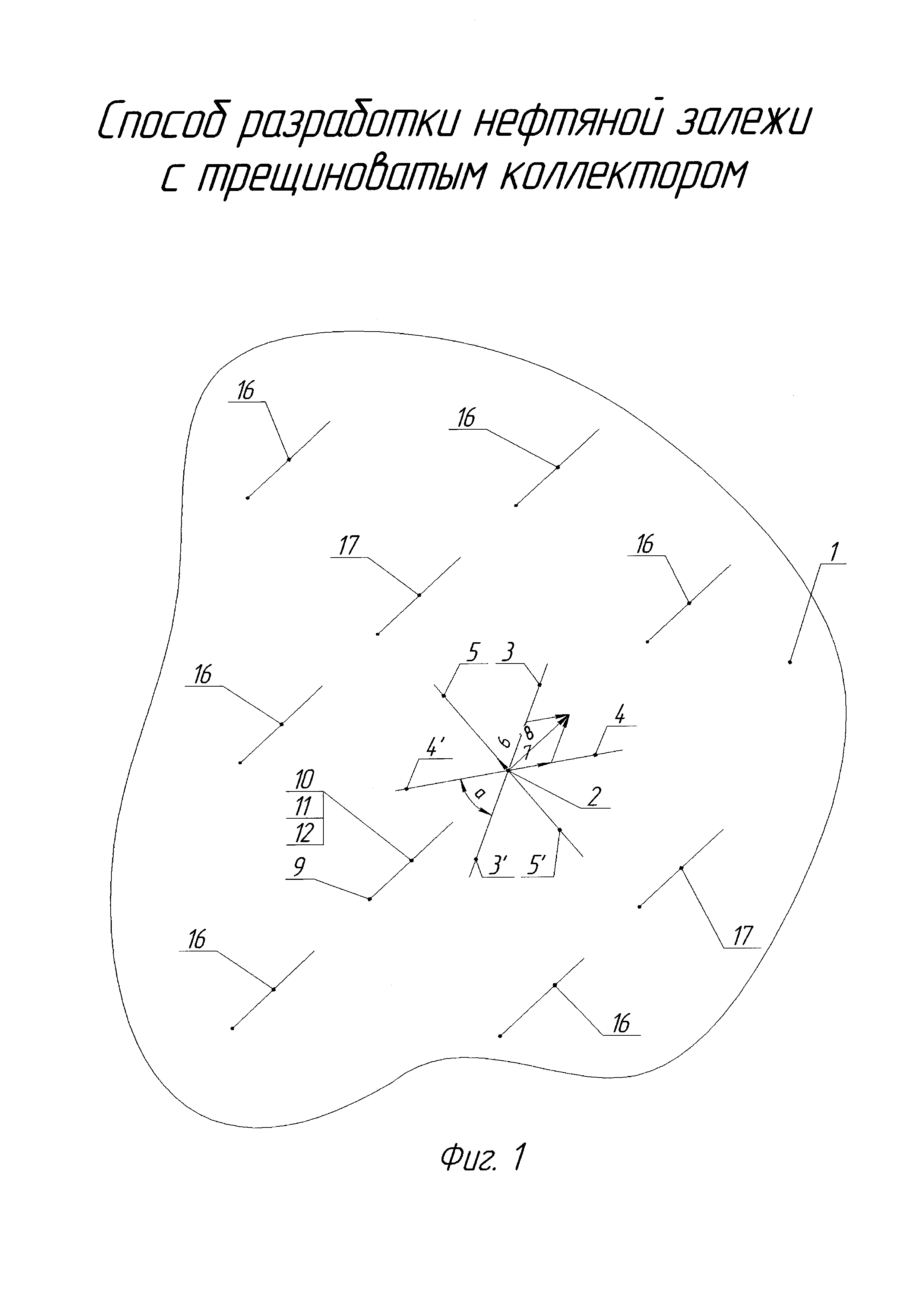 Способ разработки нефтяной залежи с трещиноватым коллектором, включающий бурение пилотной скважины, определение по данным геофизических исследований в продуктивном коллекторе преобладающего направления трещиноватости залежи, бурение из пилотной скважины ствола горизонтальных стволов в продуктивном пласте, как минимум один из которых бурится перпендикулярно направлению естественной трещиноватости, строительство добывающих и нагнетательных скважин, закачку рабочего агента через нагнетательные скважины и отбор продукции через добывающие скважины, отличающийся тем, что из пилотной вертикальной скважины проводятся одинаковые разнонаправленные парные горизонтальные стволы, причем парные стволы направлены в противоположные стороны, и только первая пара горизонтальных стволов бурится перпендикулярно направлению естественной трещиноватости, после проводки каждого горизонтального ствола отбором определяют прирост дебита продукции в пилотной вертикальной скважине, по завершении строительства горизонтальных стволов прирост дебитов парных стволов суммируют, отбирают две наиболее продуктивные пары стволов, и при виде сверху по направлению этих пар строят векторы с началом в пилотной вертикальной скважине, пропорциональные суммарному дебиту этих пар, с углом между ними, не превышающим 90°, суммируют полученные векторы, параллельно направлению полученного вектора строят дополнительную пилотную скважину с несколькими наклонными и горизонтальными однонаправленными стволами, но с разными зенитными углами, имеющими одинаковую длину вскрытого участка в залежи, определяют продуктивность каждого из стволов, отбирают два наиболее продуктивных ствола и по направлению этих стволов в вертикальной плоскости строят векторы с началом в пилотной вертикальной скважине, пропорциональные их дебиту, суммируют полученные векторы, и параллельно направлению полученных векторов по направлению в горизонтальной и вертикальной плоскостях оснащают всю залежь добывающими и нагнетательными скважинами.
