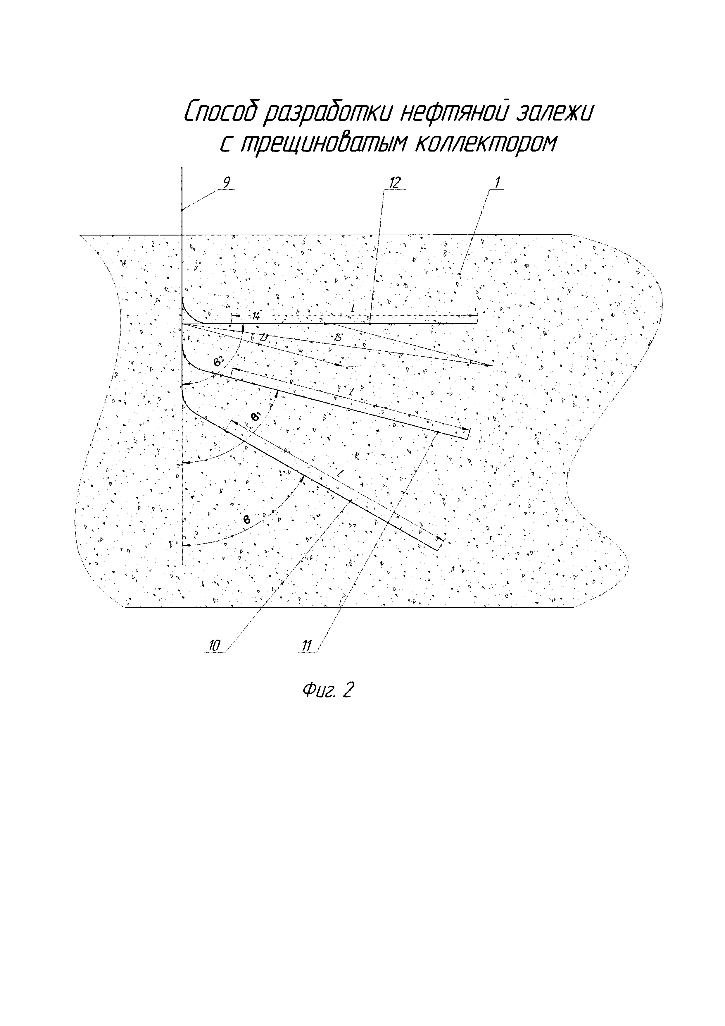 Изобретение относится к нефтяной промышленности и может найти применение при разработке нефтяной залежи с трещиноватым коллектором. Способ разработки нефтяной залежи с трещиноватым коллектором включает бурение пилотной скважины, определение по данным геофизических исследований в продуктивном коллекторе преобладающего направления трещиноватости залежи, бурение из пилотной скважины одинаковых разнонаправленных парных горизонтальных стволов, которые направлены в противоположные стороны от скважины. Причем первая пара горизонтальных стволов бурится перпендикулярно направлению естественной трещиноватости. При этом после проводки каждого горизонтального ствола отбором определяют прирост дебита продукции в пилотной вертикальной скважине. По завершению строительства горизонтальных стволов, прирост дебитов парных стволов суммируют. Отбирают две наиболее продуктивные в суммарном выражении пары стволов, при виде сверху по направлению пар строят векторы с началом в пилотной вертикальной скважине, пропорциональные суммарному дебиту этих пар с углом между ними, не превышающим 90°. Суммируют полученные векторы. Параллельно направлению полученного вектора строят дополнительную пилотную скважину с несколькими наклонными и горизонтальными однонаправленными стволами, но с разными зенитными углами, имеющими одинаковую длину вскрытого участка в залежи. Определяют продуктивность каждого ствола, отбирают два наиболее продуктивных ствола и по направлению этих стволов в вертикальной плоскости строят векторы с началом в дополнительной пилотной скважине, пропорциональные их дебиту, суммируют полученные векторы. Параллельно направлению полученных векторов по направлению в горизонтальной и вертикальной плоскостях оснащают всю залежь добывающими и нагнетательными скважинами. Техническим результатом является повышение эффективности разработки нефтяной залежи. 1 пр., 2 ил.