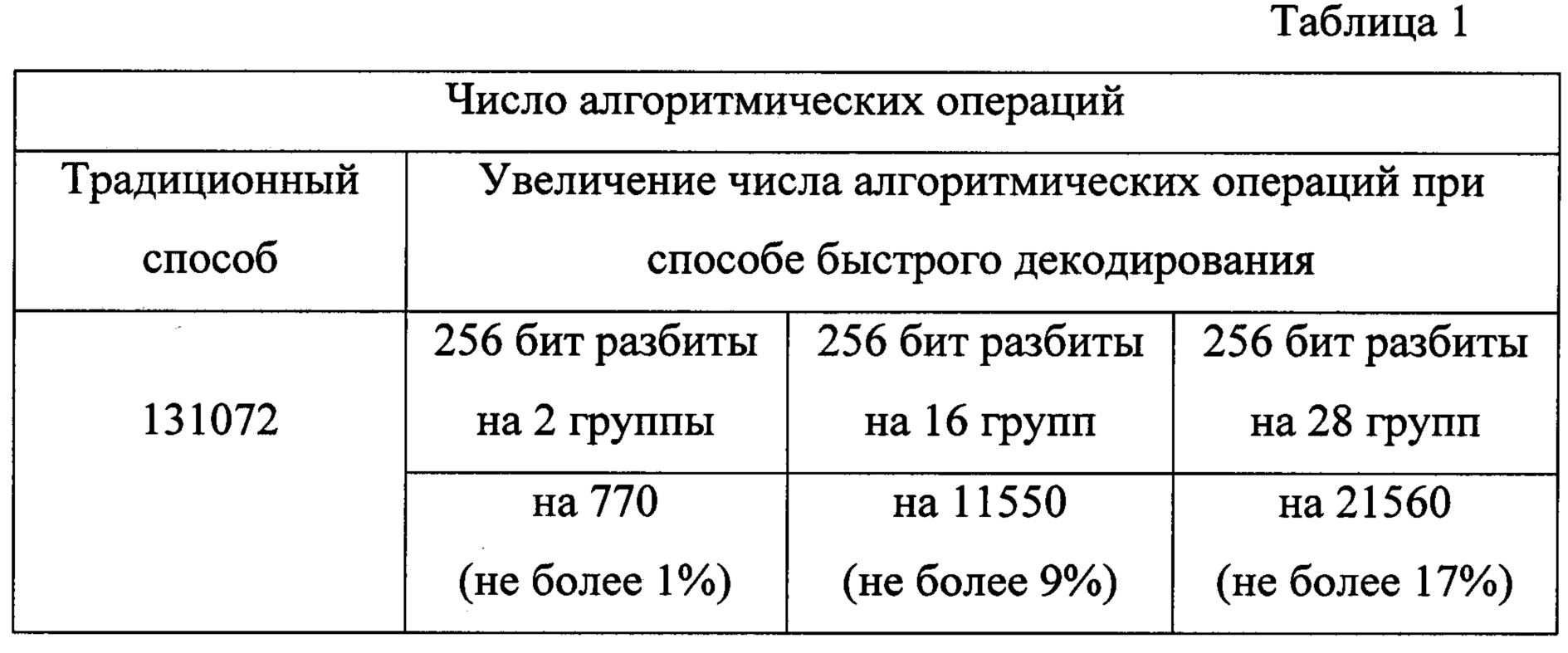 время декодирования будет существенно меньше. Так, например, для базы n=256 и при разбиении n на 16 одинаковых групп, выигрыш по времени будет: при количестве бит ƒ=n1, при количестве бит ƒ=2n1, …, при количестве бит ƒ=14n14. И только при количестве бит ƒ=15n15 и количестве бит ƒ=n будет превышение времени, соответственно, не более, чем на 3% и 9% от времени традиционного декодирования.