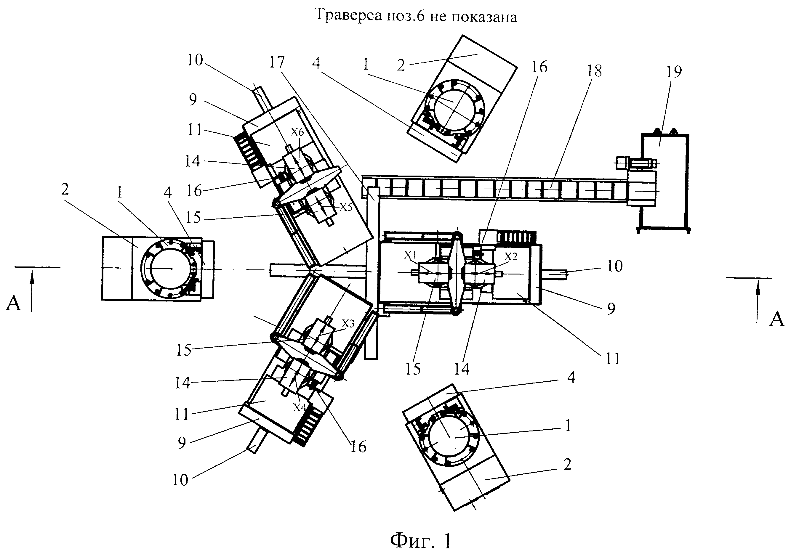 Изобретение относится к станкостроению и может быть использовано при изготовлении фрезерованием корпусных деталей малой жесткости вафельной конструкции, например топливных баков с ячеистым фоном. Известен многошпиндельный фрезерный станок, содержащий основание, выполненное в виде кольца с установленными на нем с возможностью перемещения в горизонтальной плоскости секторами, на которых шарнирно закреплены скобы, имеющие возможность радиального смещения. На каждой скобе установлены фрезерная головка и опора слежения за контуром обрабатываемой детали. Станок также содержит портал, установленный с возможностью перемещения по рельсам и выполненный в виде двух колонн, расположенных по разные стороны основания. Сверху колонны соединены друг с другом поперечиной. На колоннах с возможностью вертикального перемещения посредством привода смонтированы две каретки, на которых шарнирно закреплена траверса. На траверсе смонтирован кольцевой стол с элементами для закрепления обрабатываемой детали, а привод вращения стола размещен на траверсе. При загрузке станка портал смещают по рельсам на расстояние, достаточное для того, чтобы цеховыми транспортными средствами опустить в пространство между плечами скоб обрабатываемую деталь. Затем портал возвращают в исходное состояние и фиксируют в этом положении. Включают привод перемещения кареток и опускают их (а следовательно, траверсу и стол) до контакта стола с подлежащей обработке деталью. Закрепляют деталь на столе, после чего перемещением кареток вверх поднимают траверсу и стол с закрепленной на нем деталью в исходное для осуществления обработки положение. Включают привод поворота стола, привод вращения фрезы фрезерной головки и осуществляют обработку детали. Слежение за обрабатываемым контуром осуществляется следящей опорой (см. патент РФ №1630144, кл. В23С 3/00, 1996 г.). В результате анализа конструкции известного станка необходимо отметить, что из-за наличия многочисленных подвижных стыков и постоянного нарушения базирования перемещаемых узлов снижается точность обработки детали. Конструкция станка, выполненная по этой схеме, неоправданно утяжелена и занимает излишнюю производственную площадь. Наличие портала, на котором размещен раздаточный редуктор привода кареток, утяжеляет станок, увеличивая его металлоемкость, а применение раздаточного редуктора удлиняет кинематическую цепь, ухудшая тем самым динамическую характеристику одной из координат станка, что также приводит к снижению точности обработки. Известен многошпиндельный фрезерный станок, содержащий две колонны с вертикальными направляющими, на которых смонтированы с возможностью перемещения каретки, каждая из которых снабжена индивидуальным регулируемым приводом. На каретках смонтирована траверса с кольцевым столом, оснащенным планшайбой, предназначенной для установки подлежащей обработке детали. Стол оснащен приводом его вращения. Между колоннами на стойках установлены шарнирно скобы с возможностью их радиального смещения для настройки на размер обрабатываемой детали. На плечах каждой скобы в торцевой ее части установлены попарно фрезерная головка и опора слежения за контуром обрабатываемой детали. Для облегчения работ, связанных с установкой детали в рабочее положение, на каретках смонтир