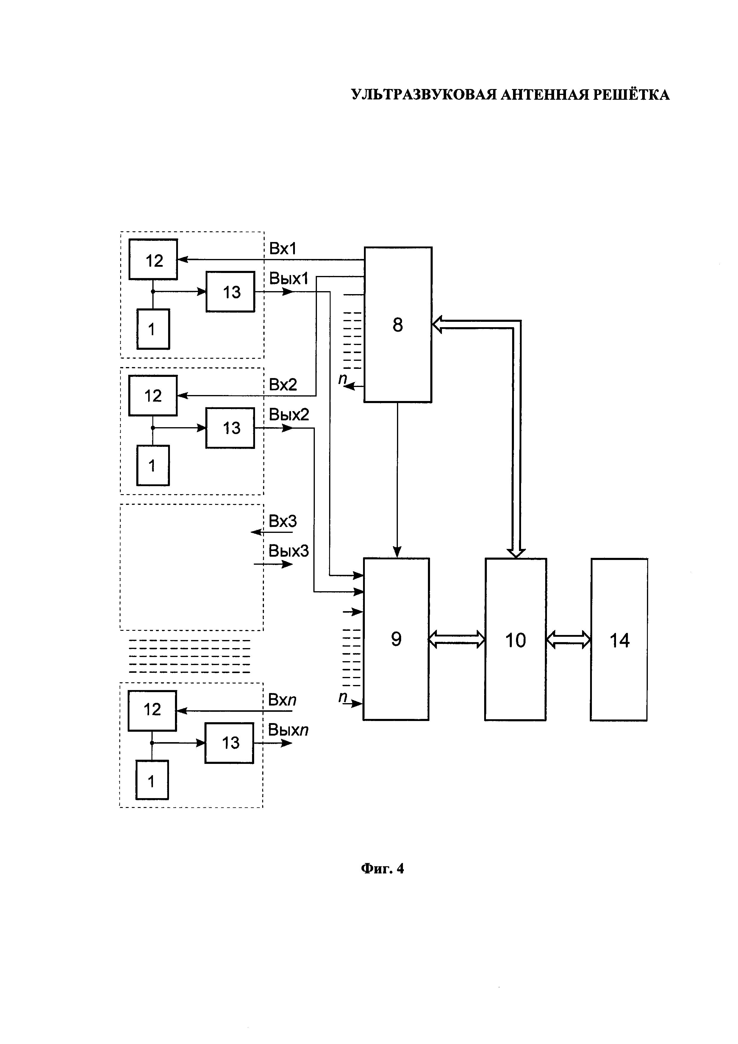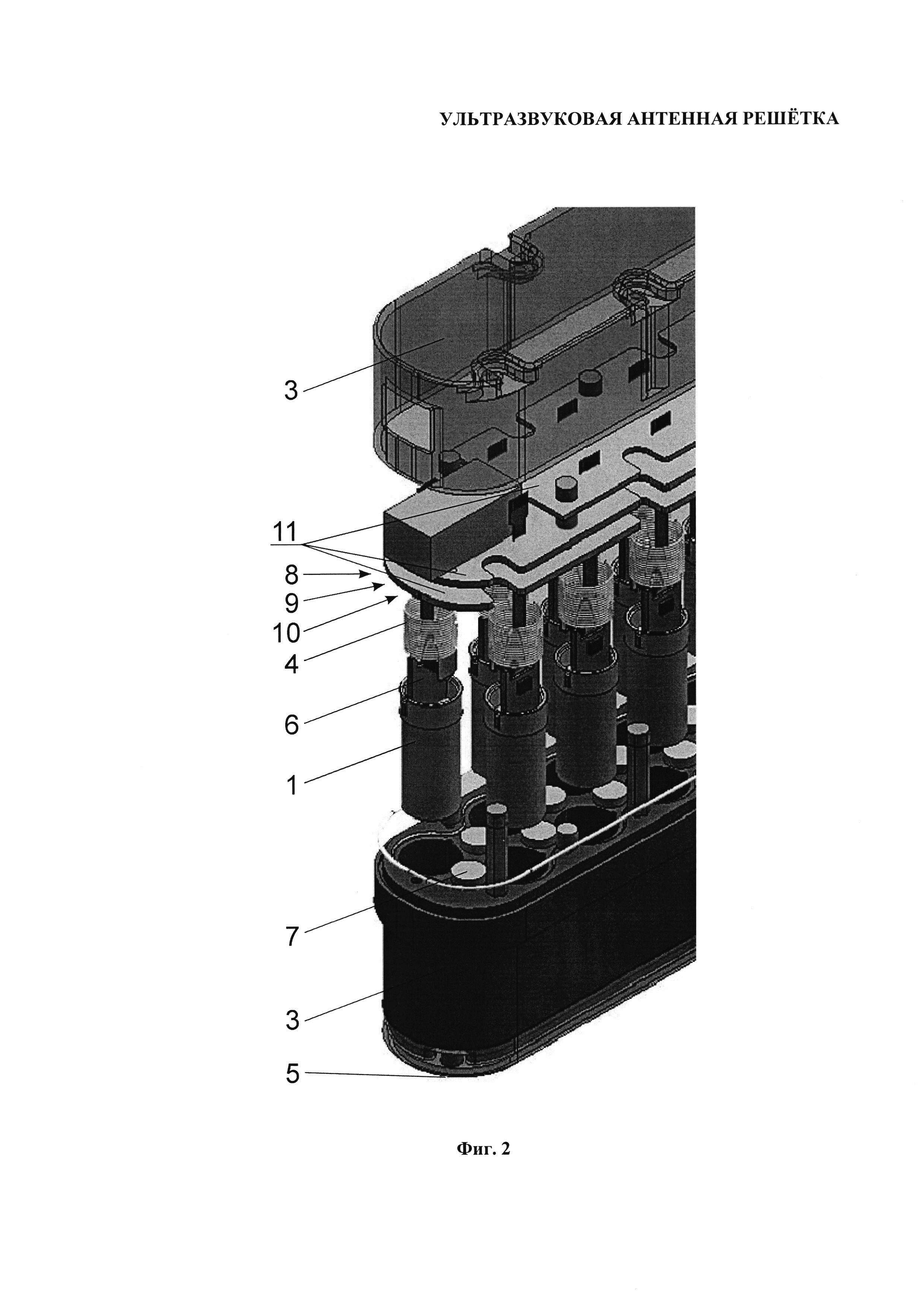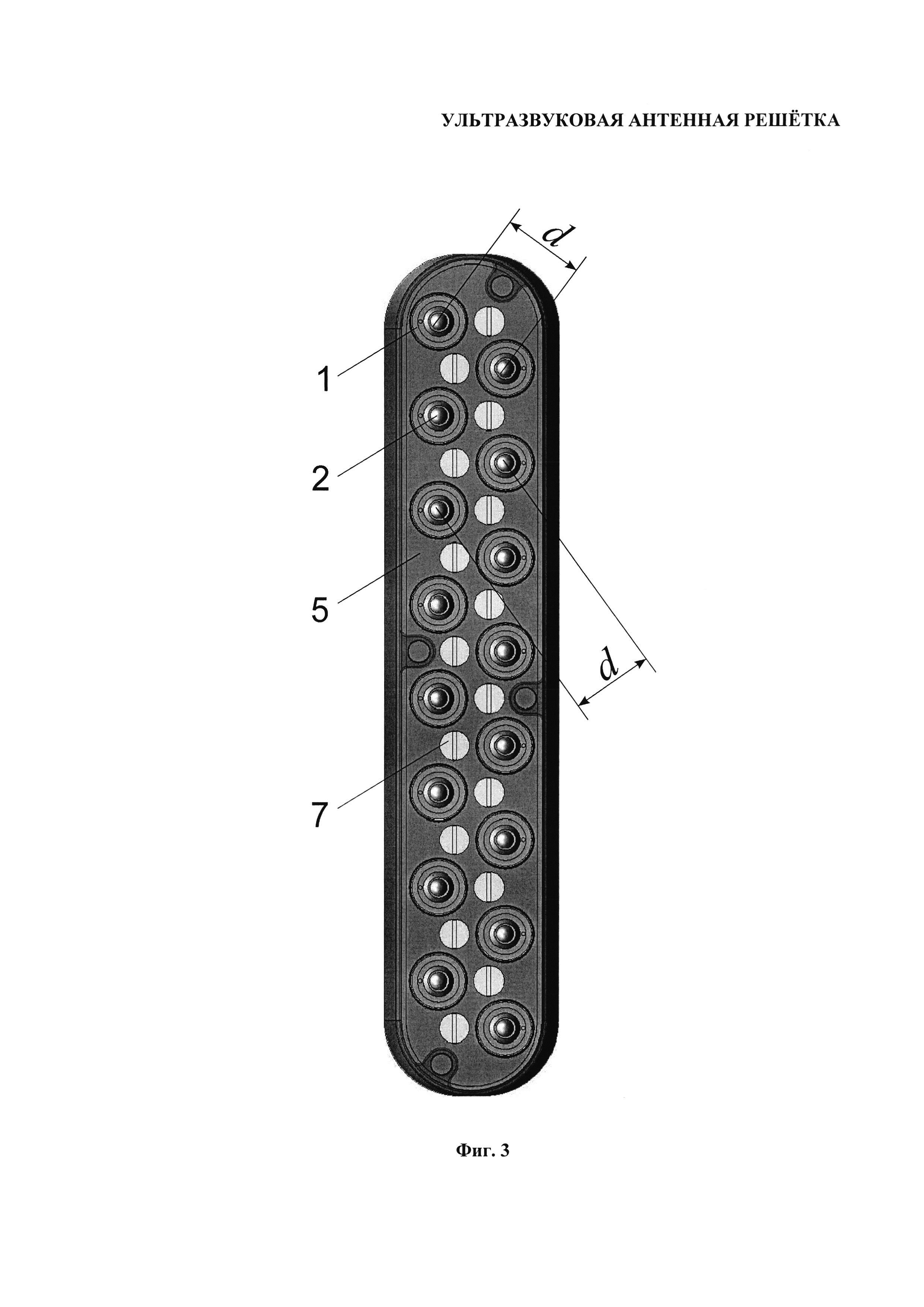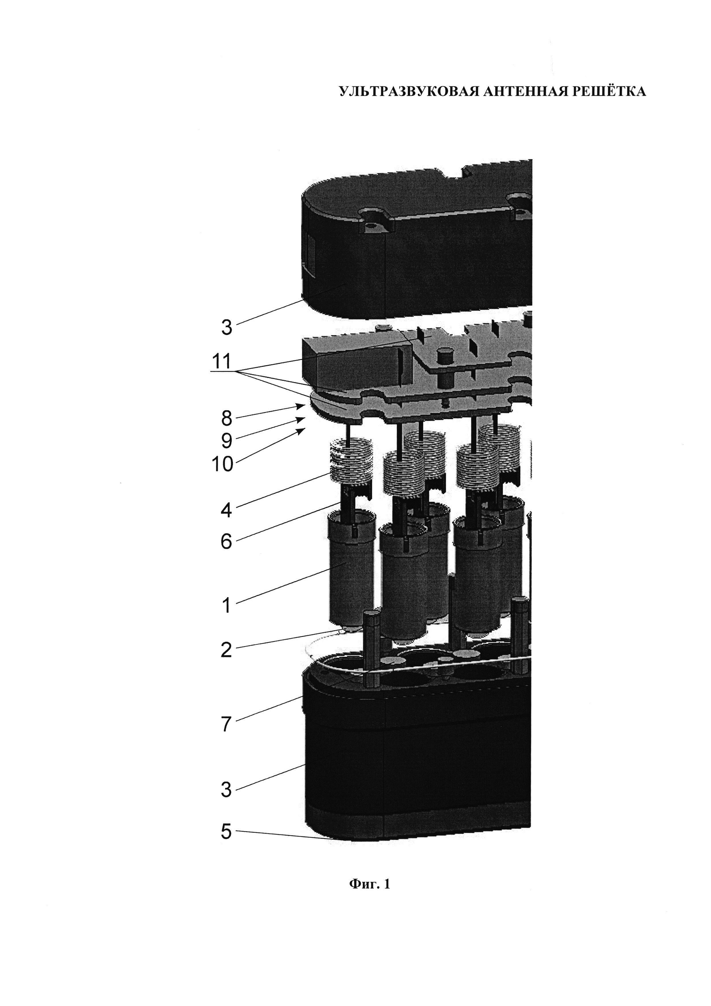 Использование: для дефектоскопии протяженных изделий эхометодом. Сущность изобретения заключается в том, что ультразвуковая антенная решетка, содержащая установленные в корпусе ультразвуковые преобразователи с сухим точечным контактом на рабочей поверхности решетки, индивидуальным прижимным механизмом с возможностью возвратно-поступательного перемещения перпендикулярно рабочей поверхности решетки и схемой управления, при этом преобразователи расположены в плане вдоль зигзагообразной линии с точками контакта в ее вершинах, векторы колебательных смещений всех ультразвуковых преобразователей ориентированы поперек или вдоль продольной оси антенной решетки, дополнительно установлены постоянные магниты, размещенные на рабочей поверхности решетки, схема управления выполнена в виде усилителя и генератора импульсов для каждого преобразователя, общего блока управления, устройства обработки сигналов и блока связи, при этом выход каждого генератора импульсов подключен к входу соответствующего преобразователя и входу соответствующего усилителя, выход которого подключен к соответствующему информационному входу устройства обработки сигналов, вход генератора импульсов соединен с соответствующим выходом блока управления, синхронизирующий выход которого соединен с входом устройства обработки сигналов, связанным, так же как и блок управления, с блоком связи, выход которого является выходом антенной решетки, связанным с устройством обработки и отображения информации. Технический результат: обеспечение возможности создания устройства с возможностью контроля изделий как с малыми поперечными размерами, так и изделий с двоякой протяженностью. 1 з.п. ф-лы, 4 ил.