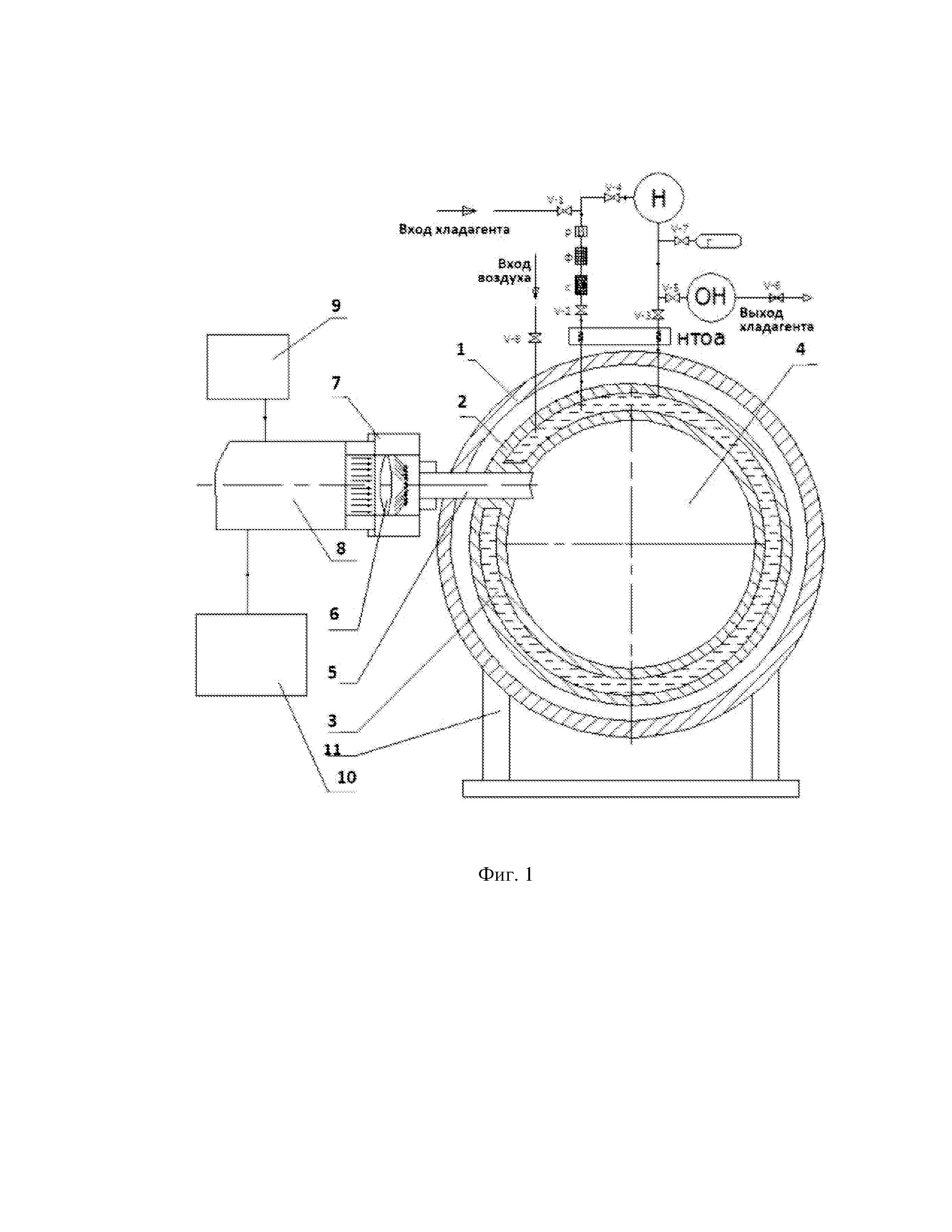 , где R – радиус внешней сферы (м); h – зазор между внешней и внутренней сферами (м); m – масса теплоносителя, заполняющего зазор; с – плотность теплоносителя. Циркуляция теплоносителя (хладагента) обеспечивает равенство температур на поверхности внутренней сферической конструкции 2, ограничивающей внутреннюю полость 4 внутри которой моделируются характеристики абсолютно чёрного тела. Пространство между внешней 1 и внутренней 2 сферическими конструкциями, а также внутренняя полость 4, образованная сферической конструкцией 2 может быть заполнена теплоизолирующей средой (газом (воздухом), теплоизолирующим материалом) либо в данном пространстве может быть создан вакуум.