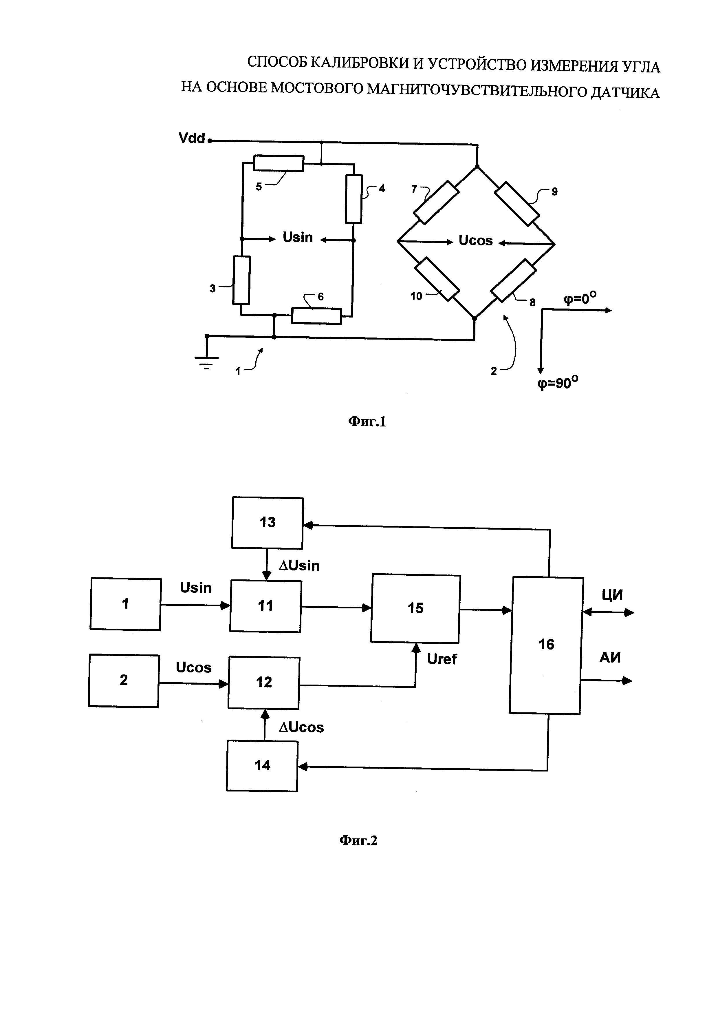 Изобретение относится к измерительной технике, в частности к способам калибровки и устройствам измерения угла на основе мостового магниточувствительного датчика, и может быть использовано в автомобильной технике, станкостроении, авиационной и ракетной технике и других областях, где требуется измерять углы до 90° с помощью датчиков на основе магниторезисторов или элементов Холла. Устройство измерения угла на основе мостового магниточувствительного датчика содержит два моста, повернутых друг относительно друга на 45°, два усилителя, два ЦАП, АЦП и вычислительное устройство. Усилители соединены с выходами мостов датчика, входы смещения нуля усилителей соединены с выходами компенсационных ЦАП, входы которых соединены с вычислительным устройством. Вход АЦП соединен с выходом первого усилителя, а вход опорного напряжения АЦП соединен с выходом второго усилителя. Вычислительное устройство содержит память программ и калибровочные данные, а также цифровой и аналоговый интерфейсы. Технический результат заключается в возможности измерения угла в диапазоне от 45° до -45° за один такт преобразования АЦП с использованием одного АЦП. 2 н.п. ф-лы, 3 ил.