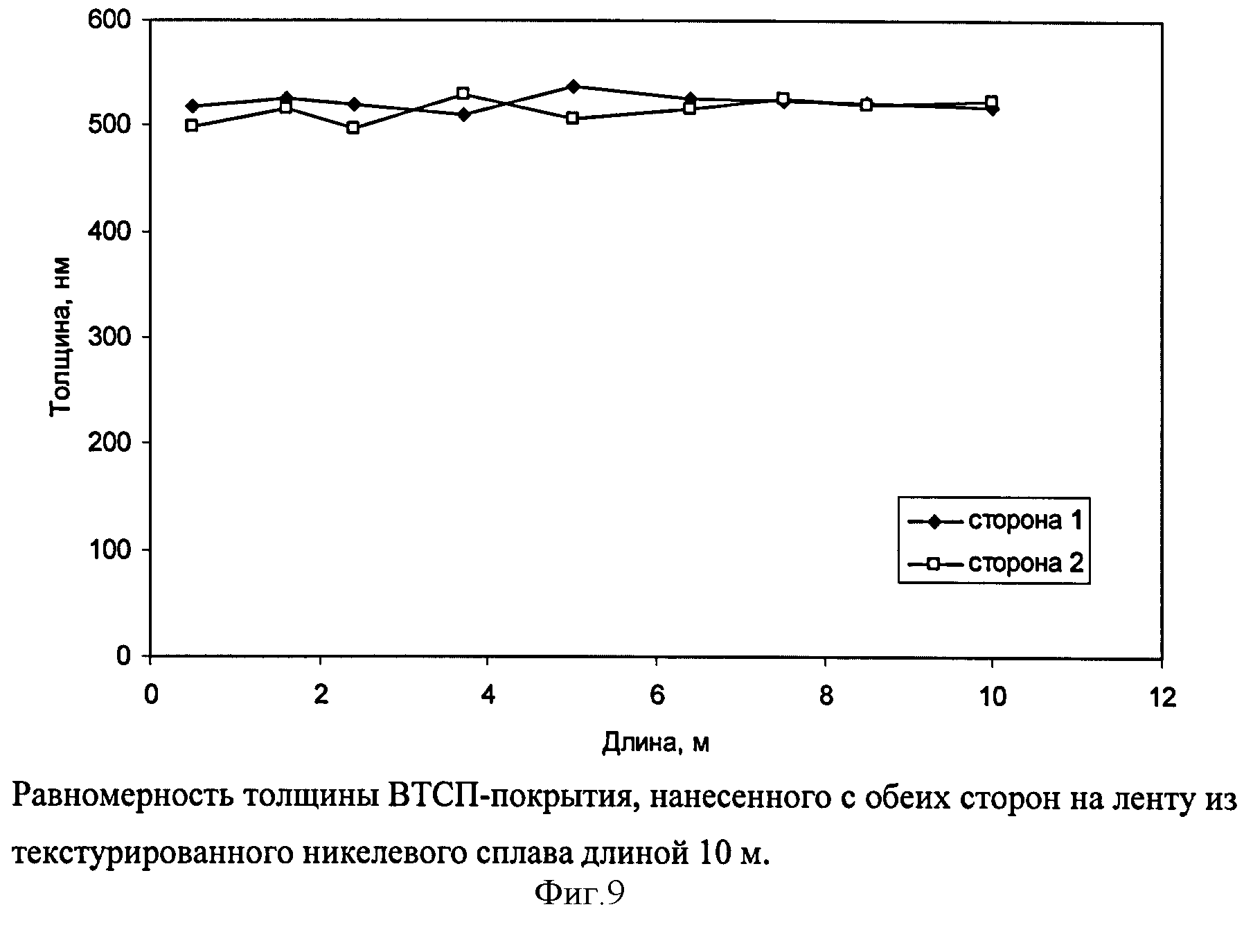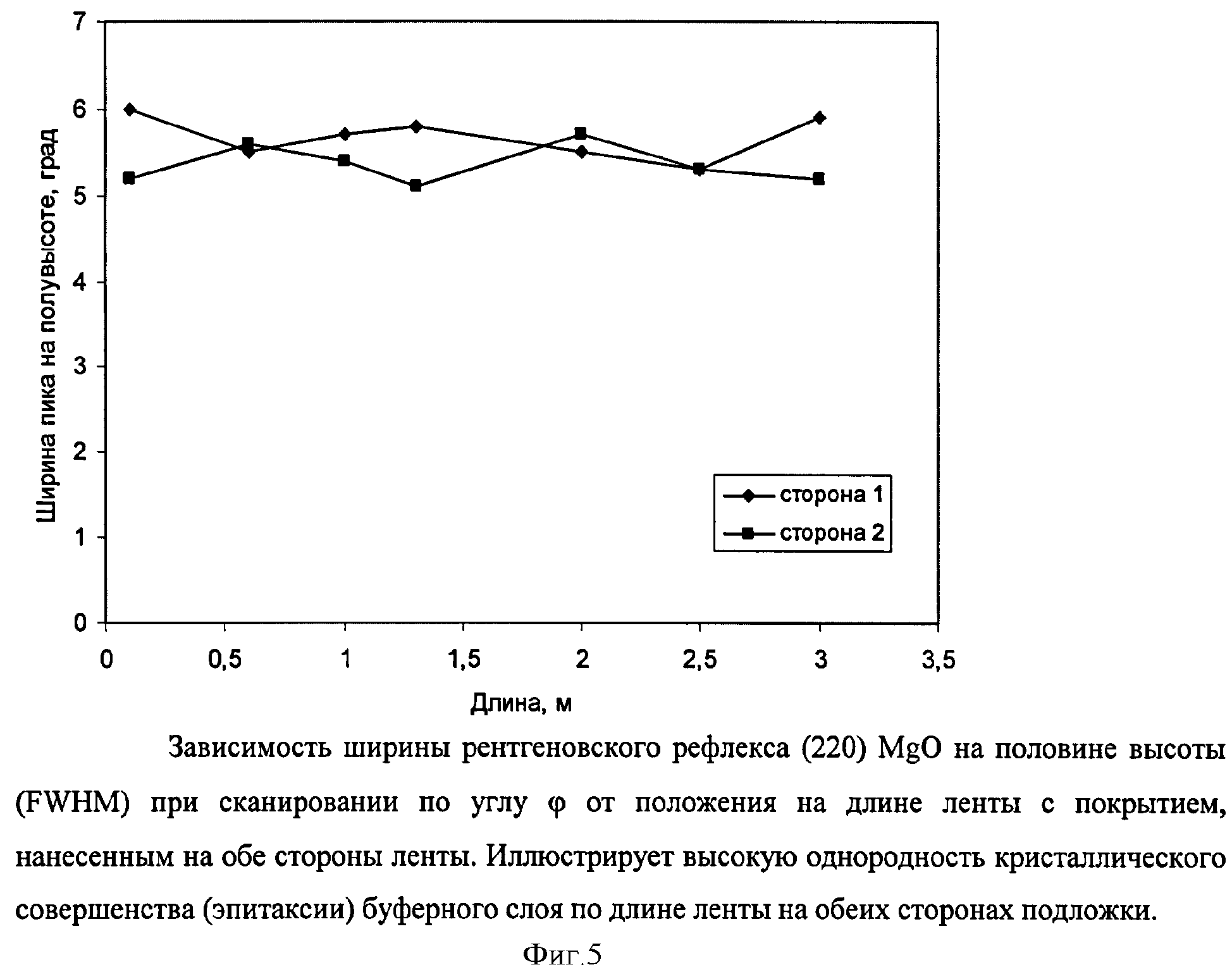 Изобретение относится к области химической технологии получения покрытий так называемых сверхпроводящих проводников второго поколения. Способ получения двухстороннего сверхпроводника второго поколения методом химического осаждения металлоорганических соединений из паровой фазы в трубчатом реакторе химического осаждения заключается в том, что сначала в трубчатом реакторе одновременно на две стороны движущейся длинномерной подложки осаждают из паров металлорганических соединений буферный слой при температуре 350-850°С, а затем, в указанном реакторе, одновременно на две стороны движущейся длинномерной подложки на нанесенный буферный слой осаждают из паров металлоорганических соединений сверхпроводящий слой при температуре 650-850°С, при этом нагрев трубчатого реактора осуществляют с помощью нагревательных элементов, расположенных вдоль внешней поверхности трубчатого реактора, давление в трубчатом реакторе поддерживают равным 0,1-100 Мбар, металлоорганические соединения предварительно испаряют в испарителе при температуре 150-300°С и газом-носителем подают в зону осаждения трубчатого реактора, движение подложки осуществляют со скоростью 1-10 м/час, а с двух противоположных сторон трубчатый реактор продувают газообразным потоком. Изобретение позволяет наносить буферный и сверхпроводящий слой одновременно на обе стороны длинномерной металлической ленты-носителя и тем самым удвоить величину критического тока единичного проводника, расширить выбор типов используемых подложек, снизить температуру осаждения при повышении качественных характеристик осаждаемых буферных и сверхпроводящих слоев, повыси�