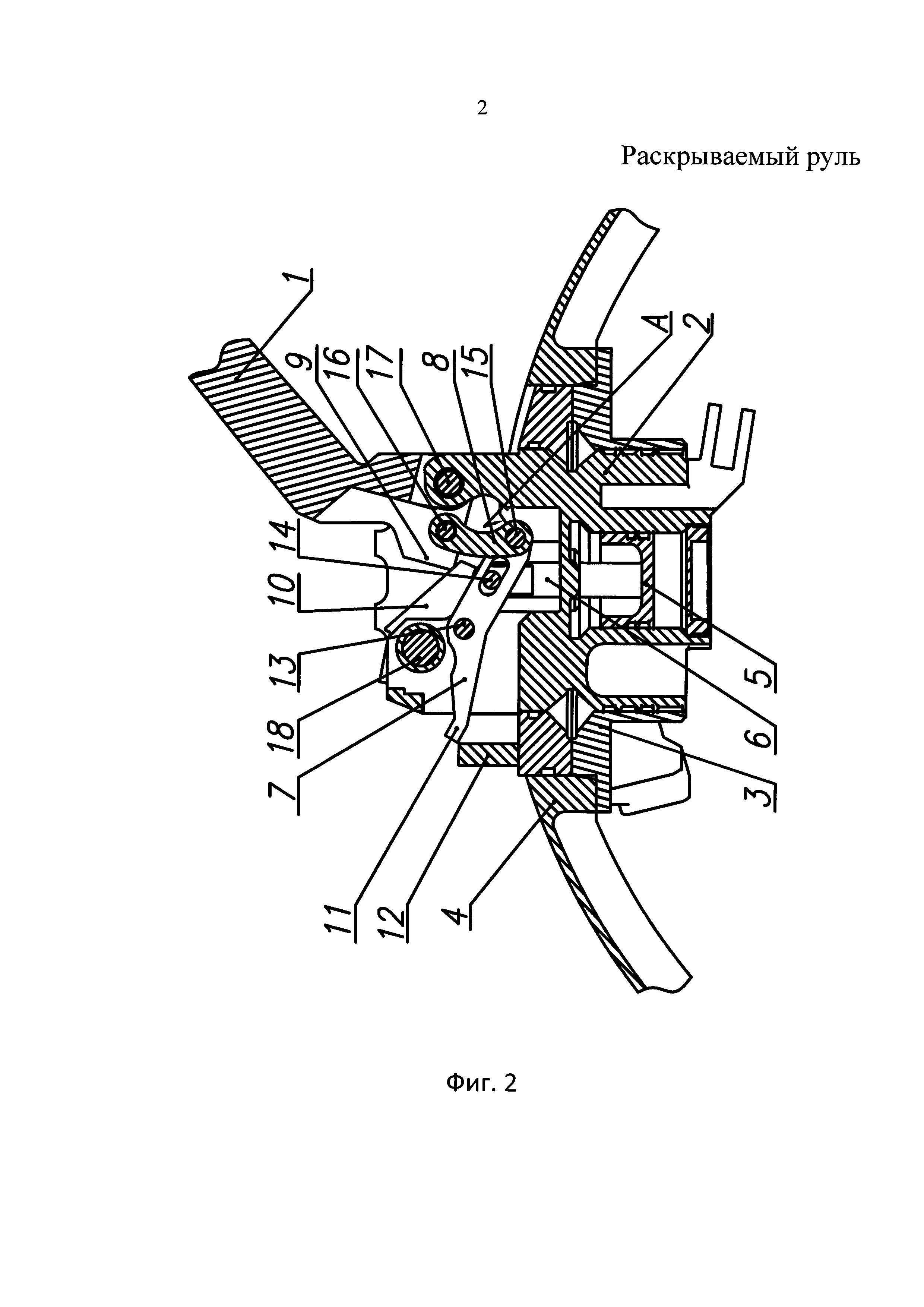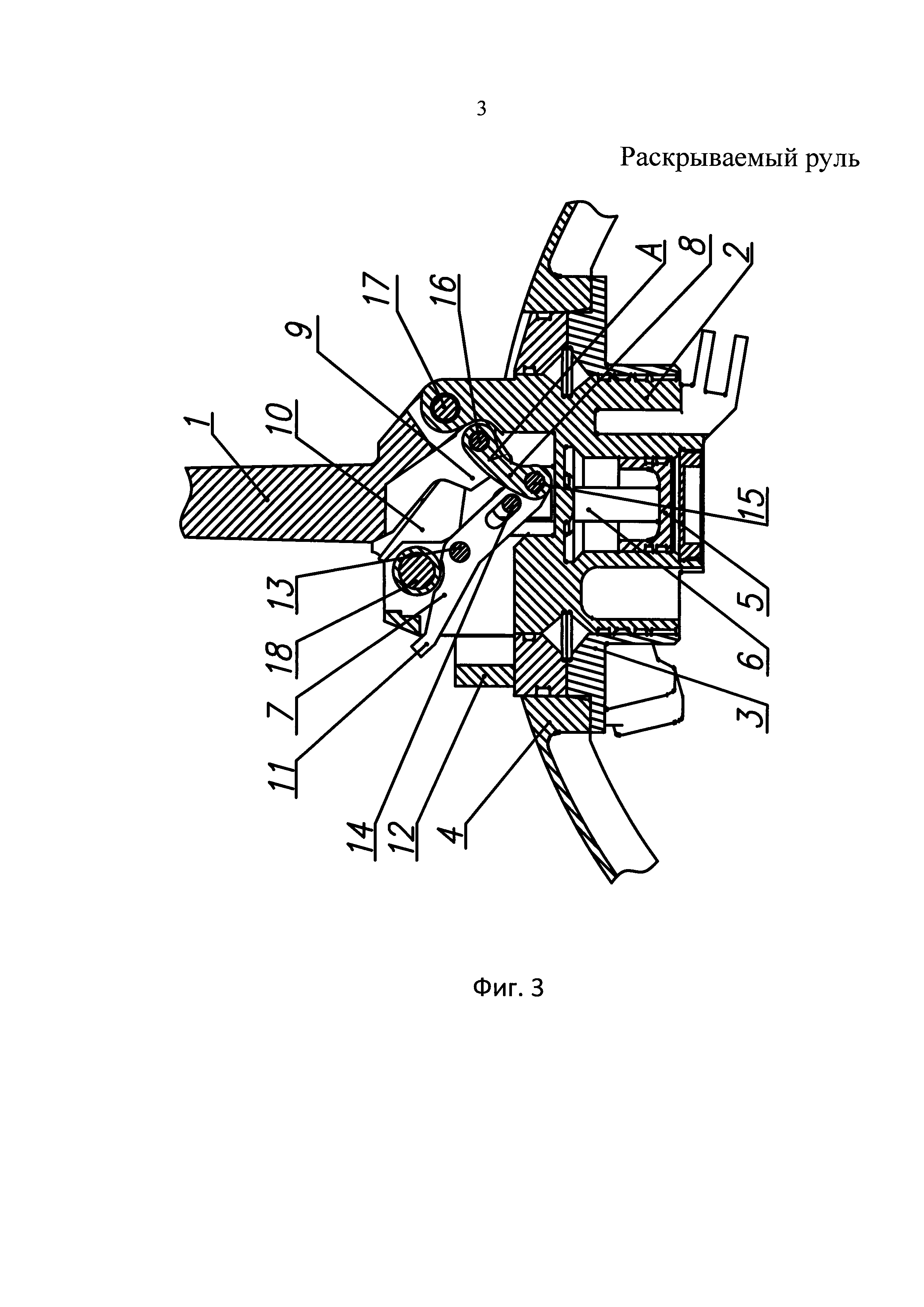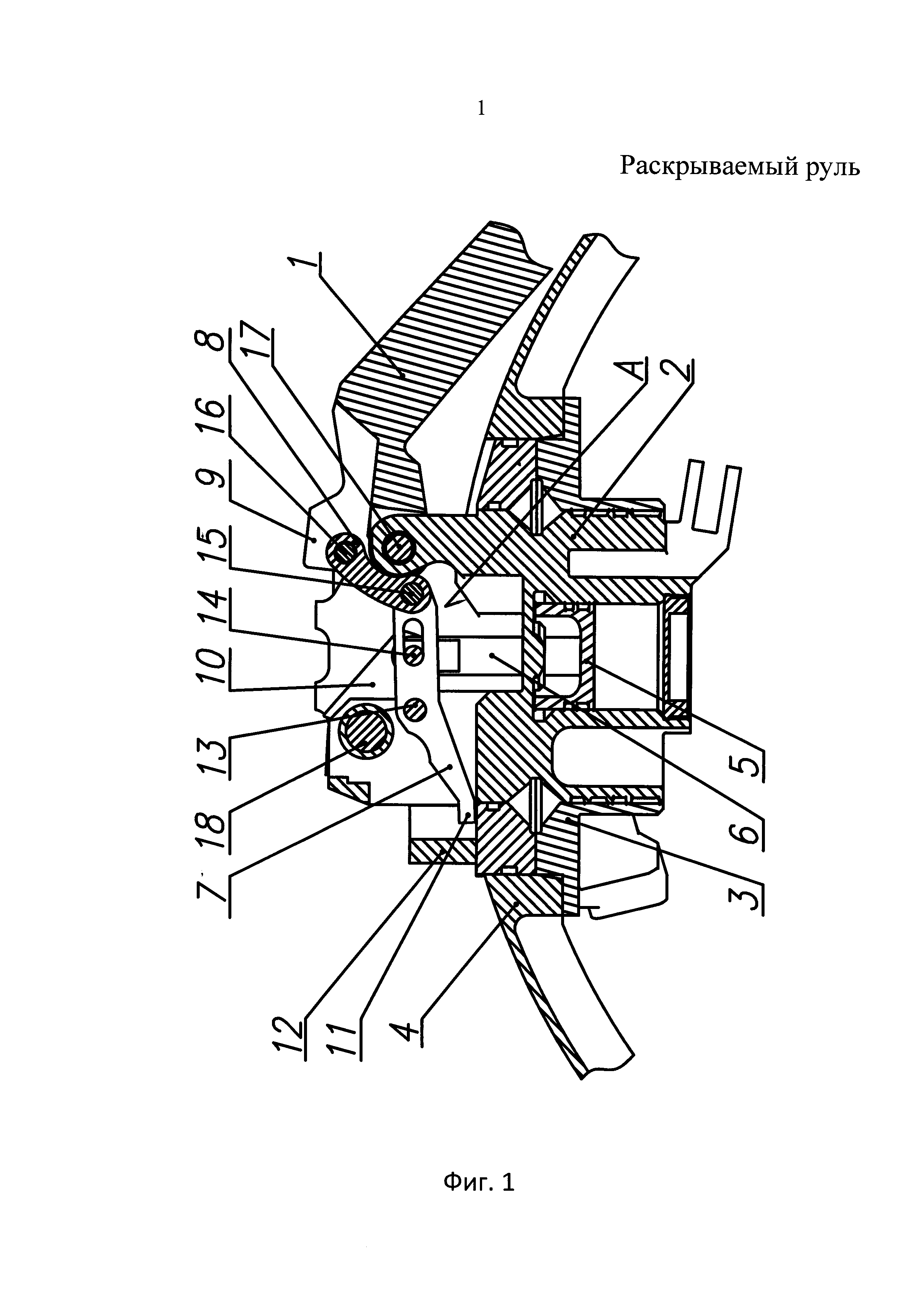 Изобретение относится к ракетной технике и может найти применение в конструкциях складываемых устройств (рулей, стабилизаторов и др.). Известны устройства раскрываемых аэродинамических поверхностей летательных аппаратов, содержащие привод раскрытия, механизмы фиксации от произвольного раскрытия и от поворота в сложенном состоянии: 1. Пат. RU 2354916 C1, МПК6 F42B 10/16. Устройство фиксации сложенных аэродинамических поверхностей беспилотного летательного аппарата / Юрконенко А.Н., Бадей Д.М. - 27.01.2009; 2. Пат. RU 2349498 C1, МПК6 B64C 3/56, B64C 9/34. Складываемая аэродинамическая поверхность / Соловей В.А., Шибаев Б.И. - 20.03.2009; 3. Пат. RU 2453799 C1, МПК6 F42B 10/00. Складная аэродинамическая поверхность беспилотного летательного аппарата / Сабанцев В.М., Остапенко М.Ю. - 20.06.2012; 4. Пат. RU 73305 U1, МПК6 B64C 5/02, F42B 15/00. Механизм раскрытия стабилизатора ракеты / Кравчук А.П., Орелиов Г.Р., Сокольник B.C., Тарасов В.И., Хмелев В.И. - 20.05.2008; 5. Пат. RU 2532286 C1, МПК F42B 10/16. Раскрываемый руль ракеты / Шевченко В.В., Шестаков С.А., Земсков В.А., Дергачев А.В. - 10.11.2014; 6. Пат. RU 2520812 C1, МПК6 F42B 10/16. Раскрываемый руль ракеты / Шестаков С.А., Земсков В.А. - 27.06.2014; 7. Пат. RU 2503919 C1, МПК6 F42B 10/14; F42B 10/64; F64C 13/28. Привод несущей управляющей плоскости летательного аппарата / Михеев С.Г., Белюстин Л.В., Марцун Ю.В. - 10.01.2014. Анализ патентов, рассмотренных в качестве аналогов, показал следующее: - [1] - устройство обеспечивает фиксацию аэродинамических поверхностей в сложенном положении. Недостаток данного технического решения в том, что это сложное многозвенное некомпактное устройство с увеличенной по габариту корневой частью аэродинамической поверхности и остающейся на замыкающей кромке части троса; - [2] - увеличены габариты объекта за счет выступания корневой части аэродинамической поверхности. Сложность изготовления винтовой пары может отразиться на надежности раскрытия, особенно в условиях больших аэродинамических нагрузок; - [3] - устройство содержит неподвижную и подвижную части поверхности, узел раскладывания подвижной части с приводом и фиксатор поверхности в раскрытом положении; имеет те же недостатки, что и [1]. Также из опыта применения тросовых механизмов известно, что они не обладают высокой надежностью в условиях больших перегрузок; - [4] - велика вероятность отказа устройства и объекта вследствие возможного излома пружины кручения при длительном хранении в заневоленном состоянии, - при очевидной нежесткой фиксации поворотной части возможны продольная и поперечная вибрации, а также перемещения при полетных перегрузках объекта; - [5] - раскрываемый руль, шарнирно закрепленный на валу, установленном в корпусе ракеты с возможностью поворота, жестко фиксируемый в раскрытом положении при помощи подпружиненных защелок, прижимающих опорный зуб руля к упору вала. Руль содержит механизм раскрытия в виде подпружиненного толкателя, последний воздействует на руль посредством троса, пропущенного через ролики. Устройство обладает следующими недостатками: постоянное воздействие усилия на трос при длительном хранении ракеты не гарантирует его высокой надежности, как и надежности срабатывания при высоких перегрузках воздействия. Указанное условие требует обязательного крепления складываемой части к корпусу ракеты специальным механизмом, а после разъединения во время раскрытия возможно смещение руля по повороту, что не обеспе